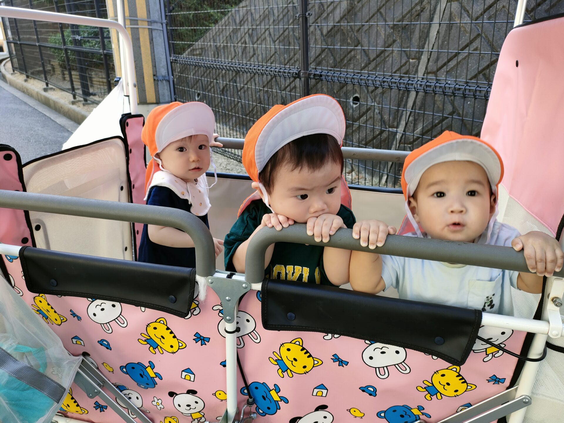 お外遊びを楽しみにしていたようで、立ち乗りバギーに乗り、笑顔で出発。