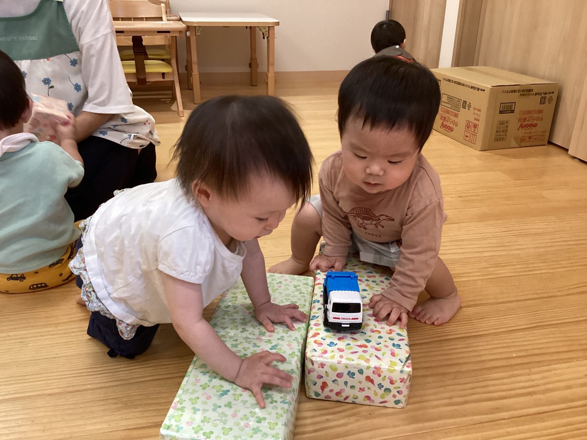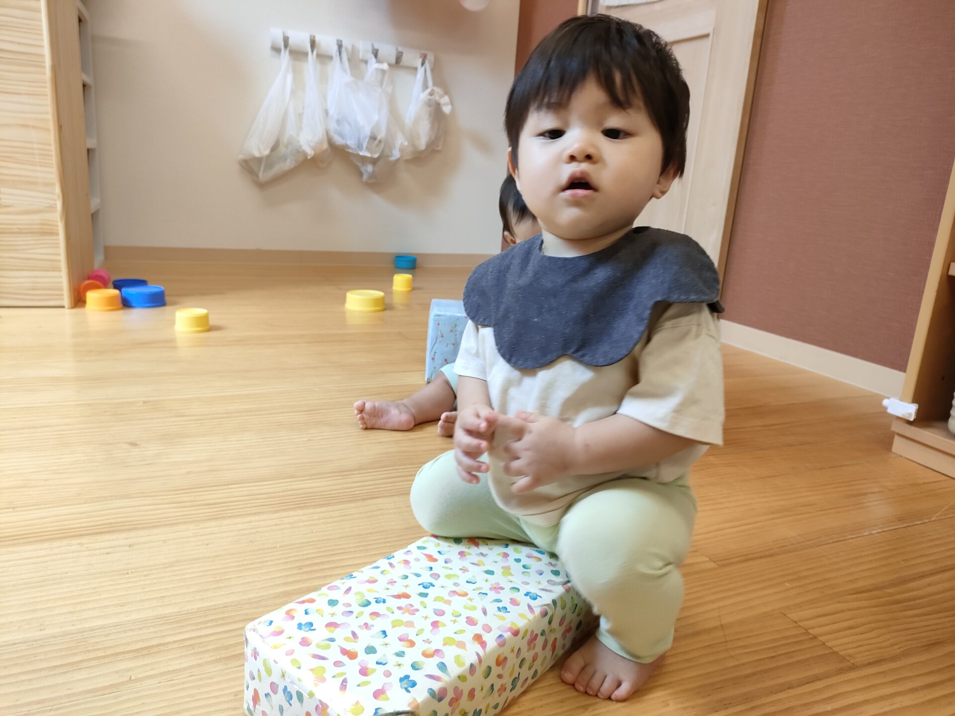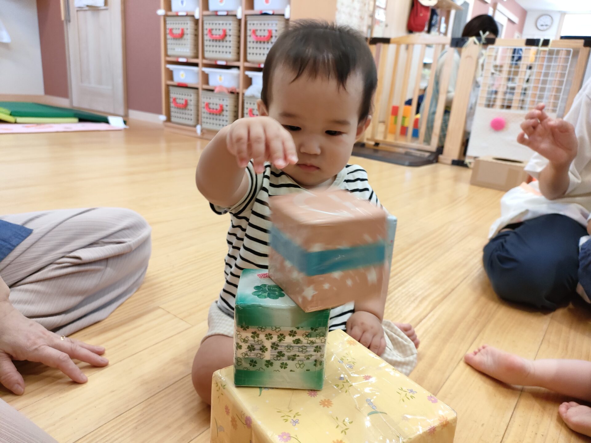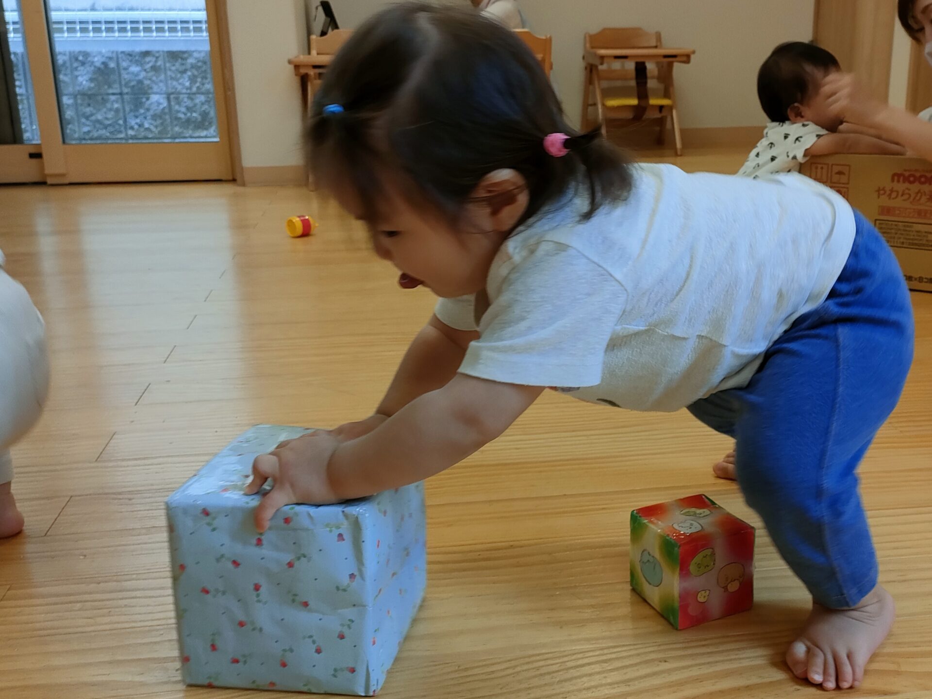 歌に合わせて、音が鳴る小さい箱をフリフリしたり、少し大きい箱を押したり、運んだり、座ったりを思い思いに遊んでいます。