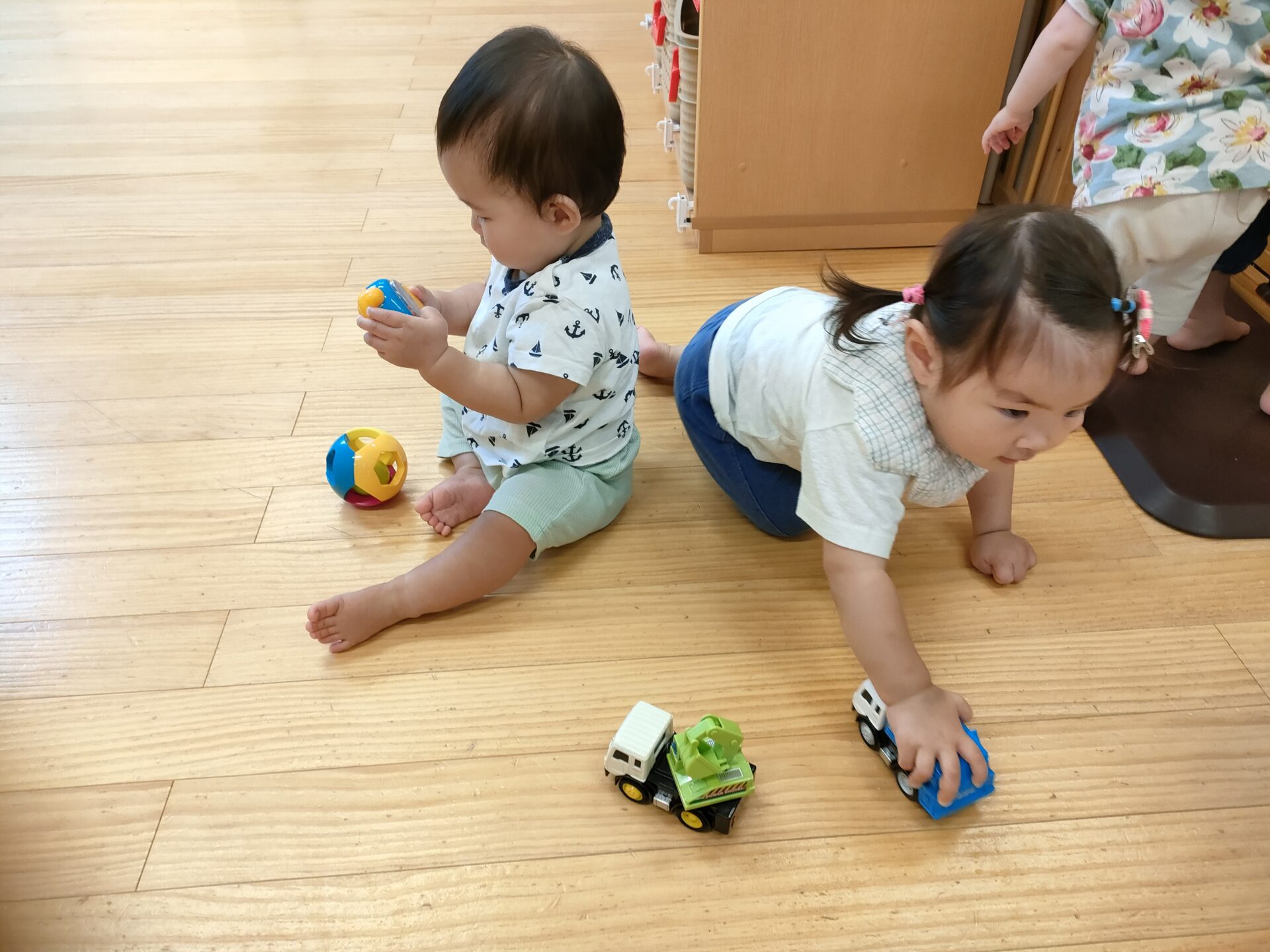 朝1番の遊びは、好きな車をおもちゃの箱から選んで、室内を走らせています。他にも、おもちゃが色々あるのですが、みんな車を選んでいますよ。☺️