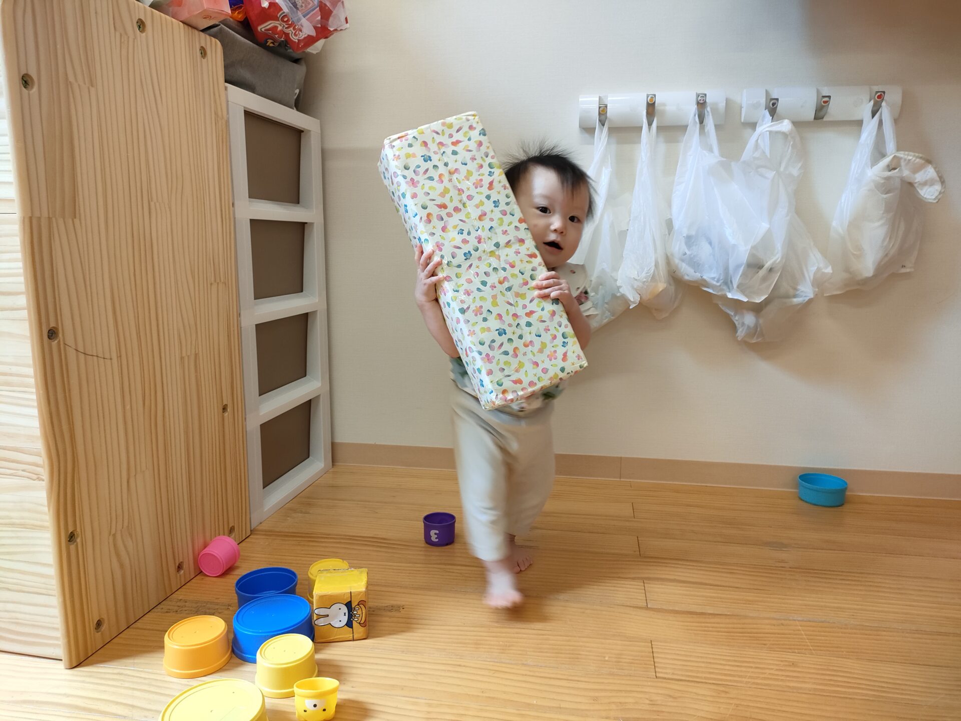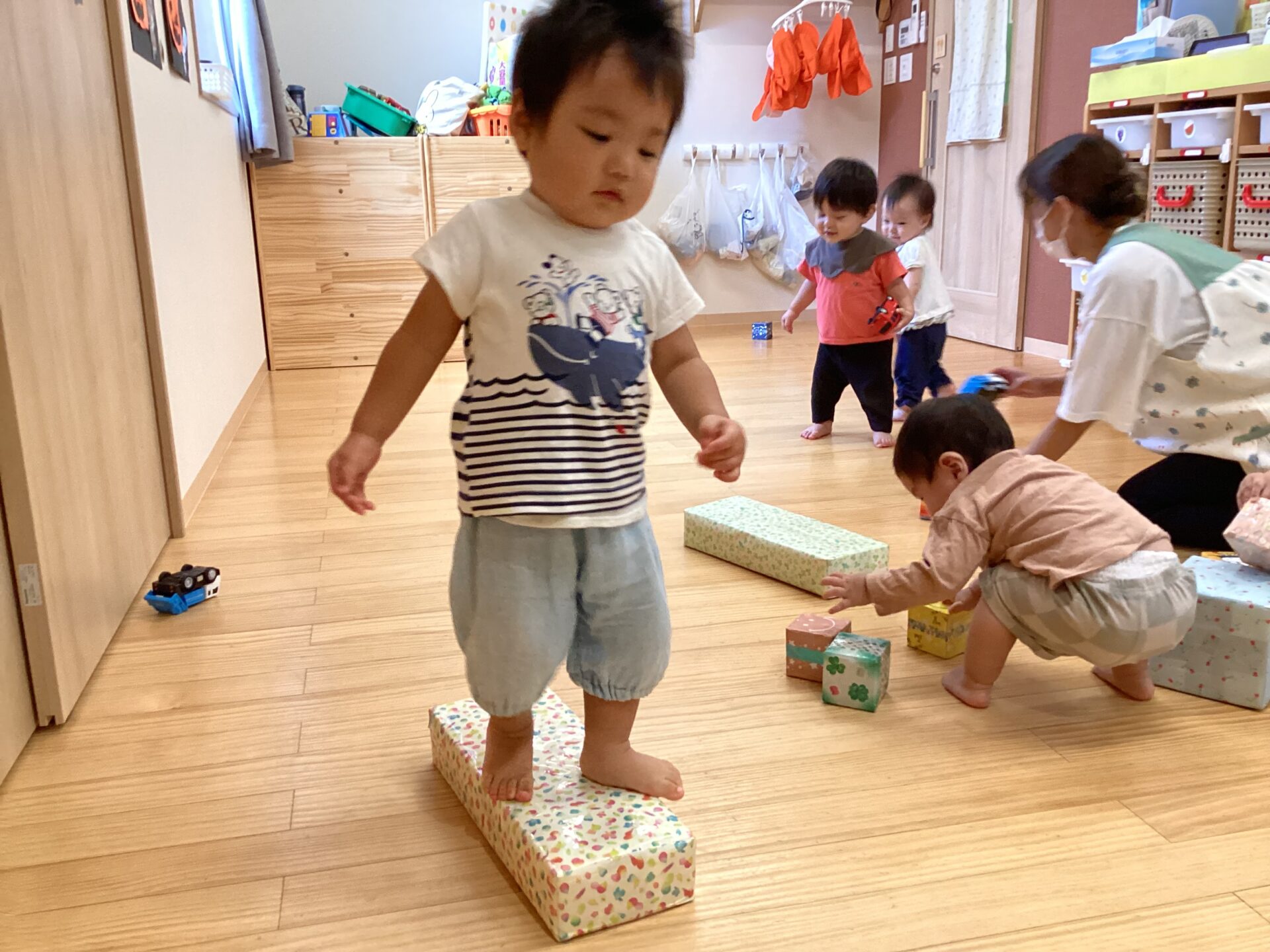 歩行が安定したお友だちは、少し長い箱を並べて、バランスを取りながら、歩く事を楽しんでいますよ。うまく歩けない時は、置き方を考えたり、少し壁を持ちながら歩こうすることもあります。