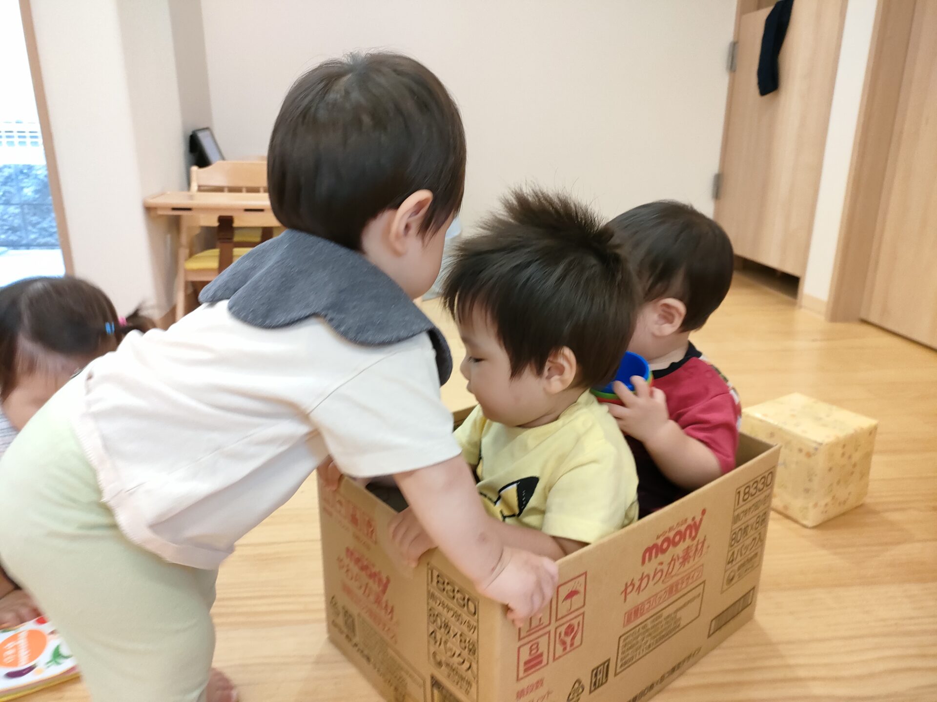 狭い所も大好きで、一斉に入ろうとする事もありますが、順番に入ったり、保育者の真似をして押したりしながら、お友だちと一緒に遊ぶ姿も増えていますよ。