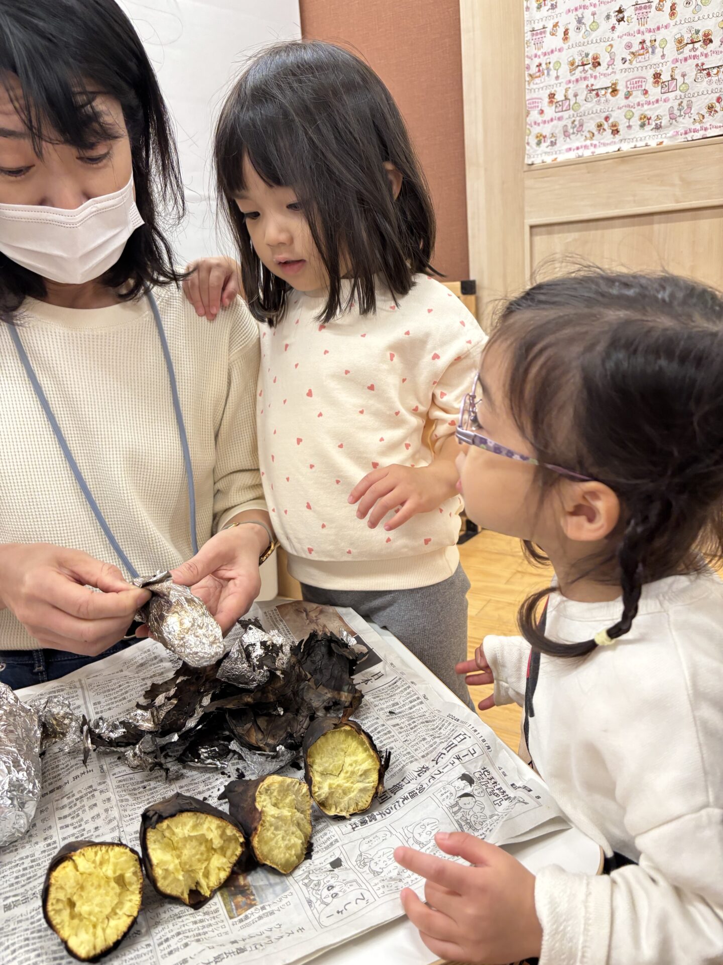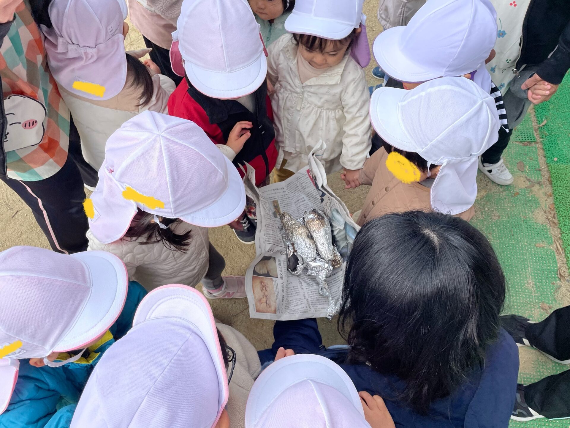 お芋が焼けるまで、大園周辺を少しだけお散歩してから園庭に戻ると、美味しそうな焼き芋が焼き上がっていました。
