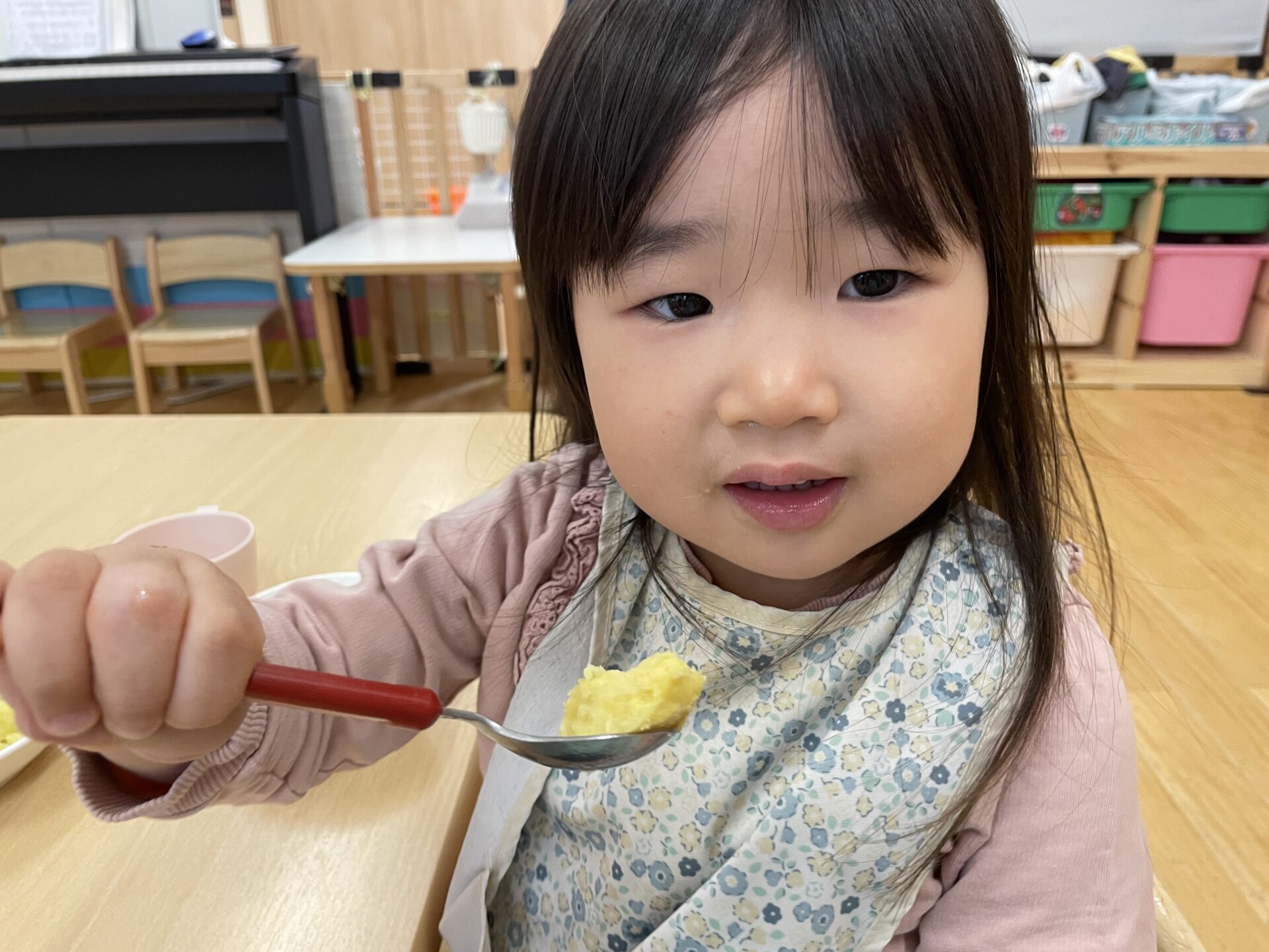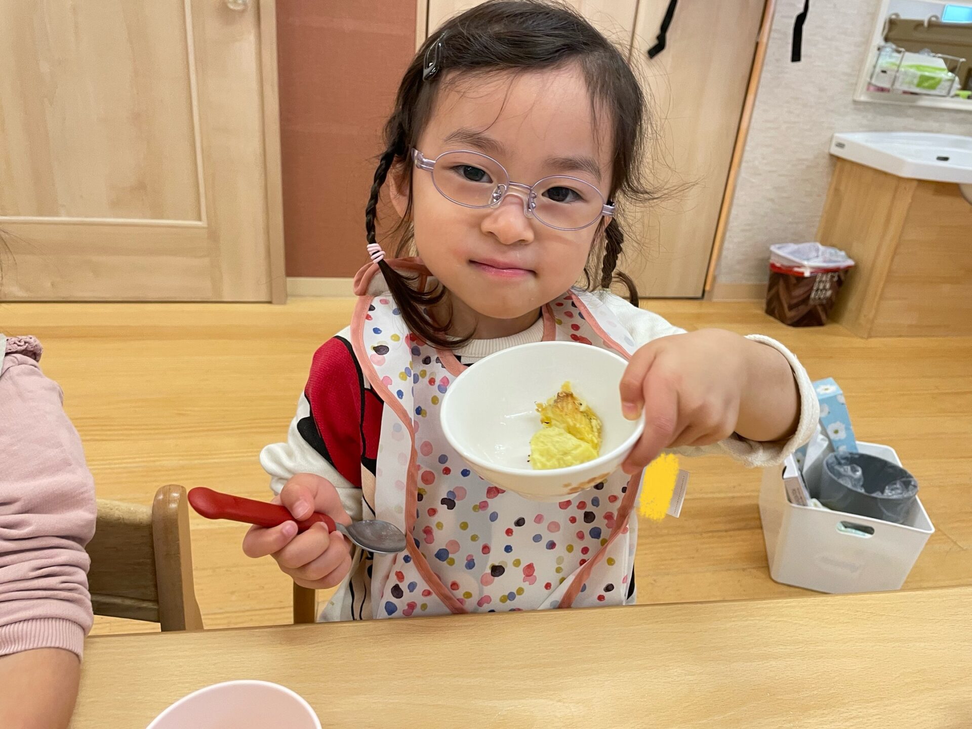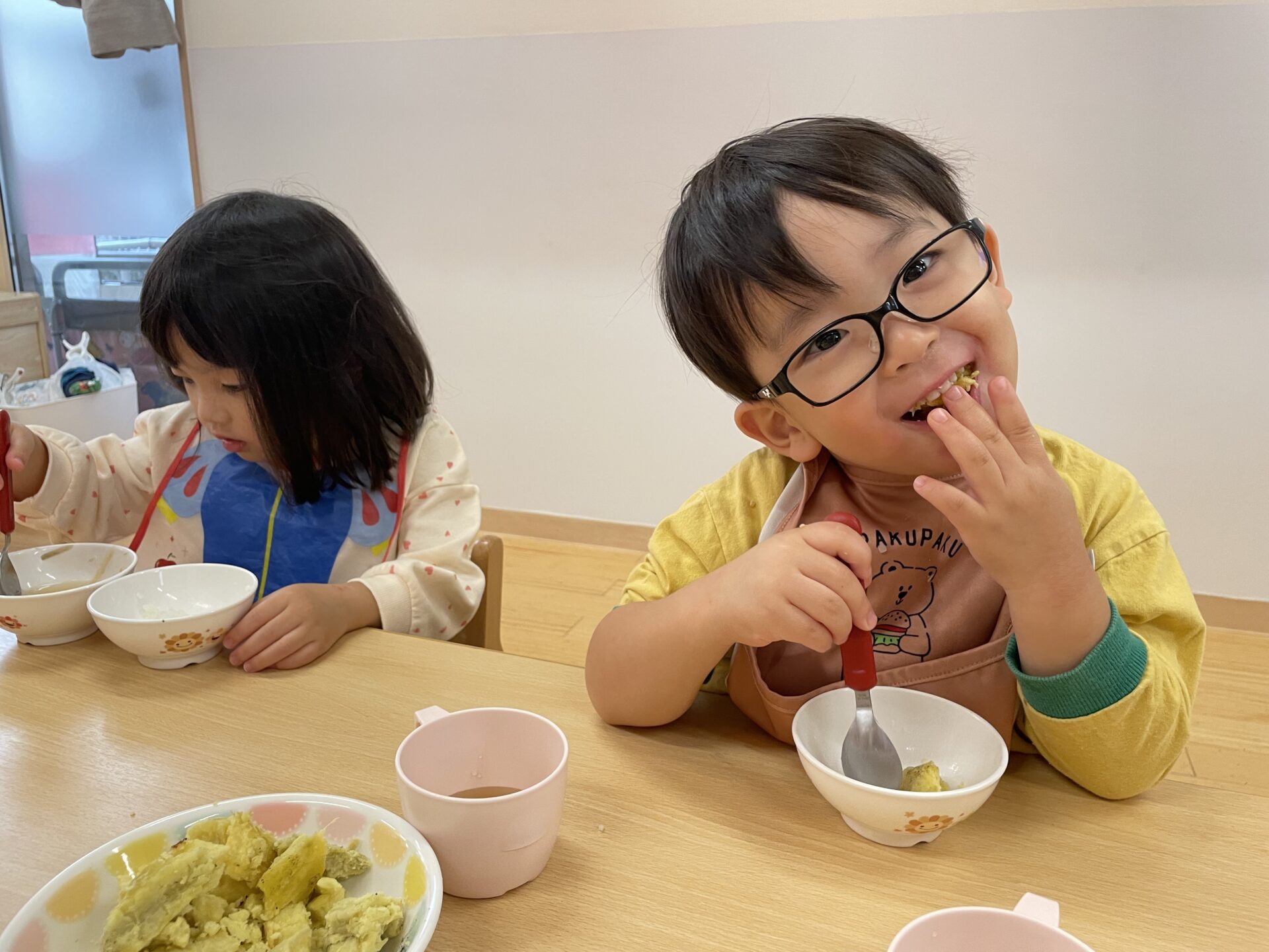 完成したお芋を給食後に食べると、自分で焼いたお芋は一味違う美味しさだったようで、「スペシャル焼き芋だね!」「めーっちゃ美味しい!」と笑顔の子どもたち☺️素敵な体験になりました✨