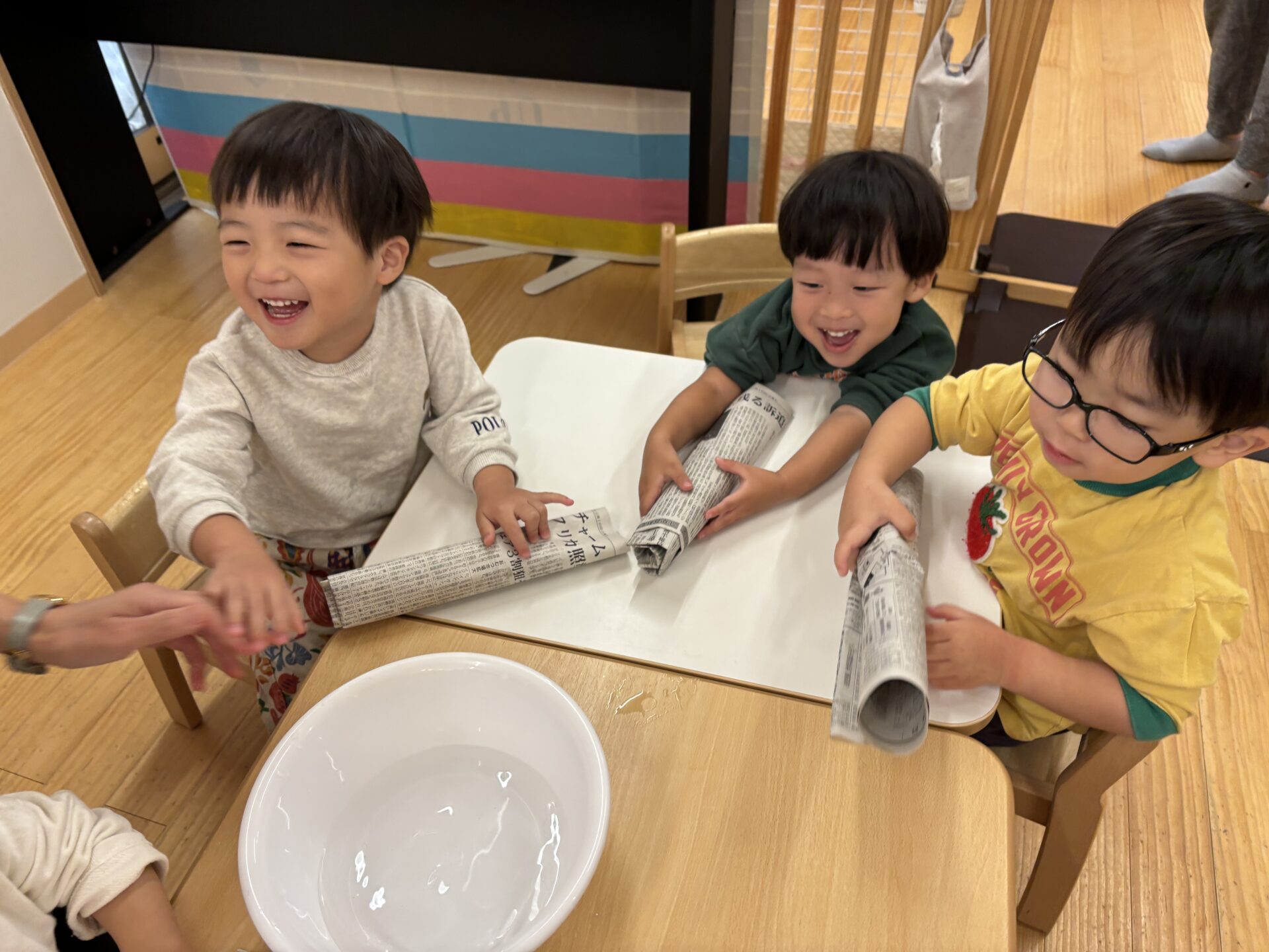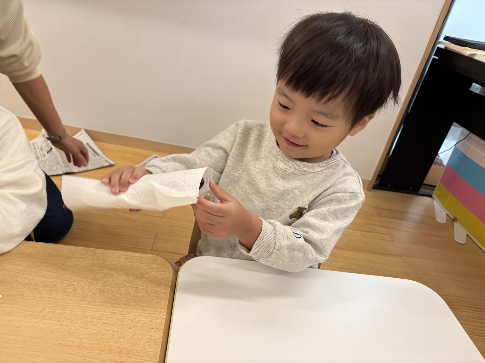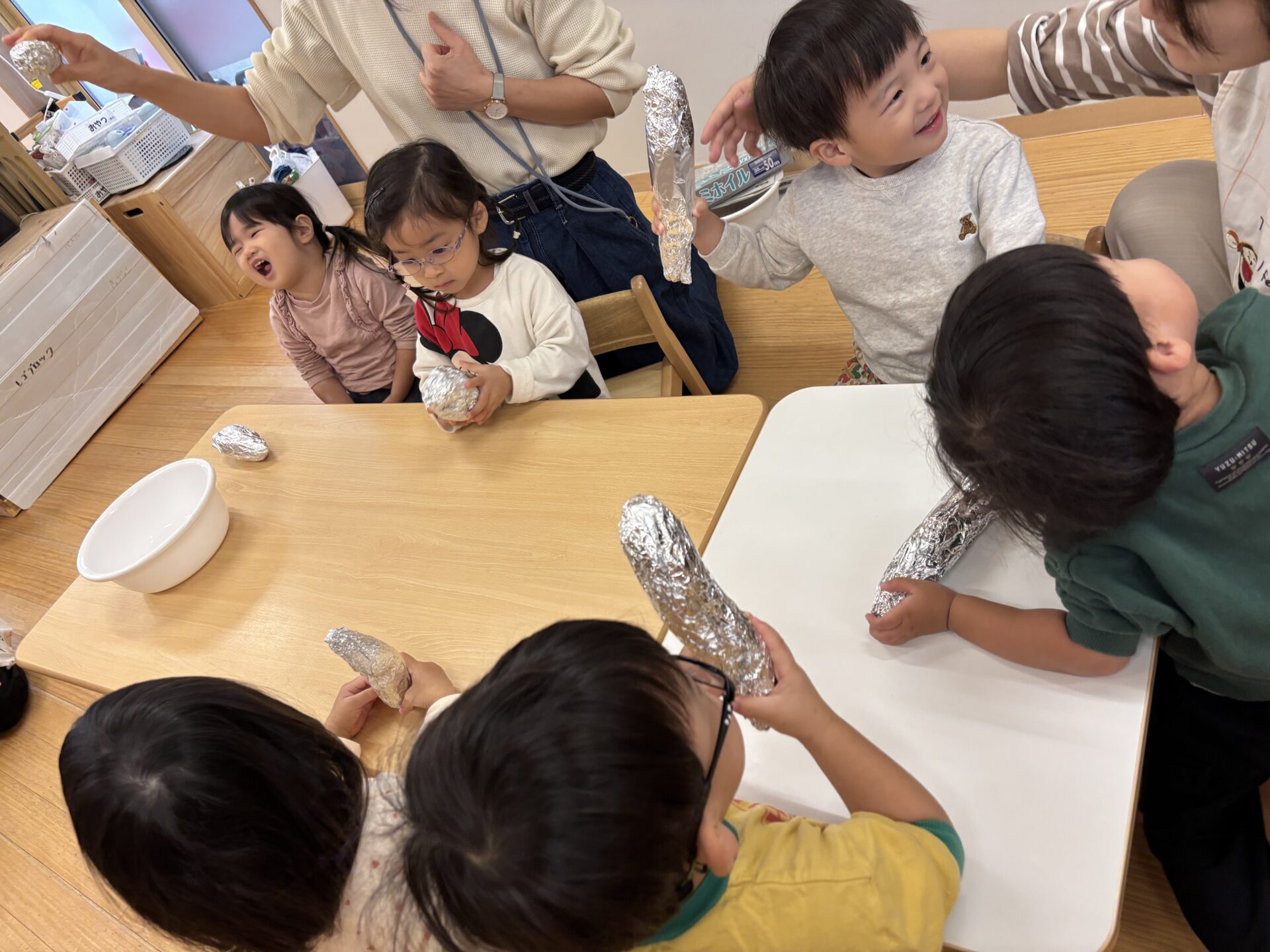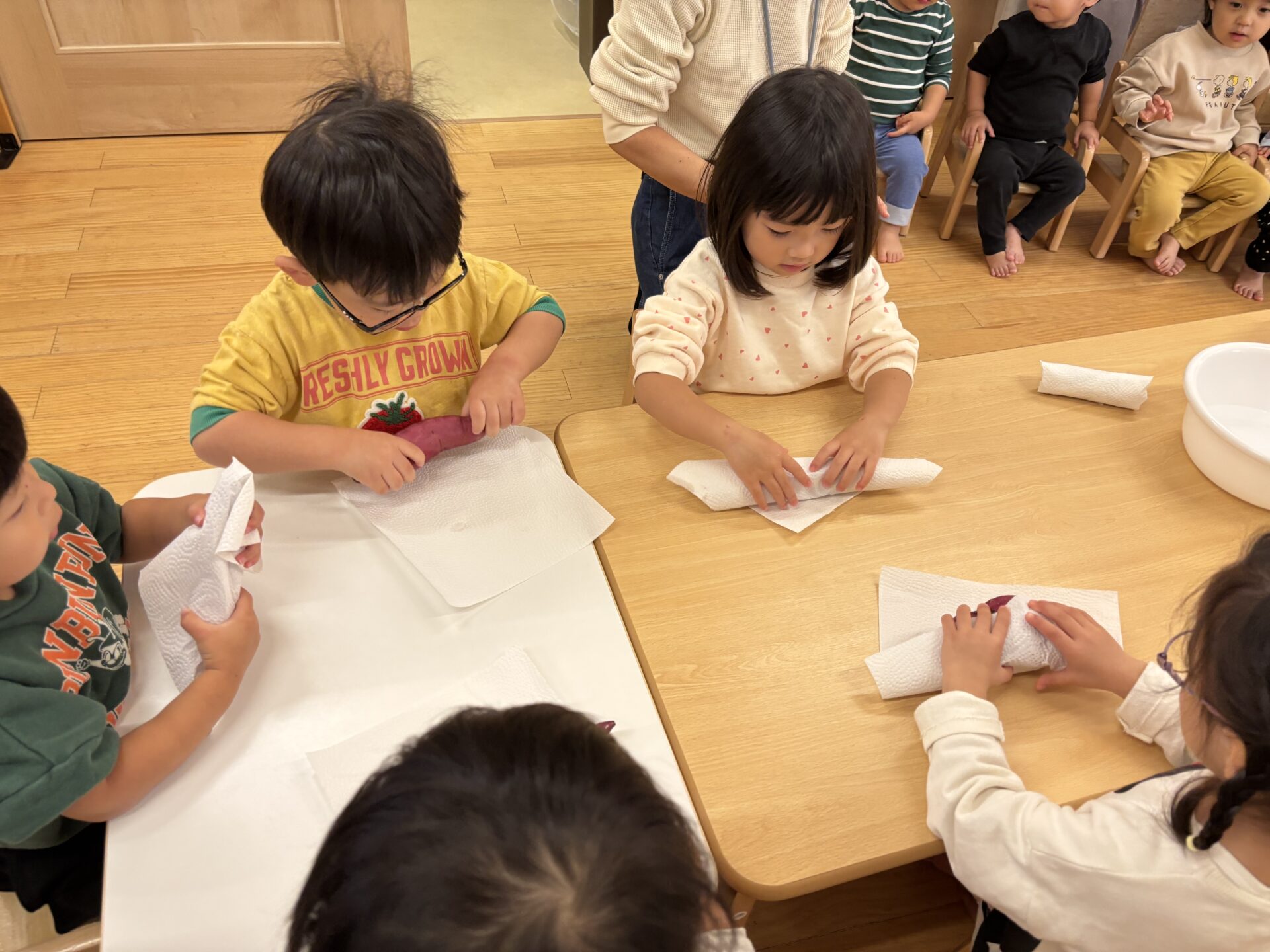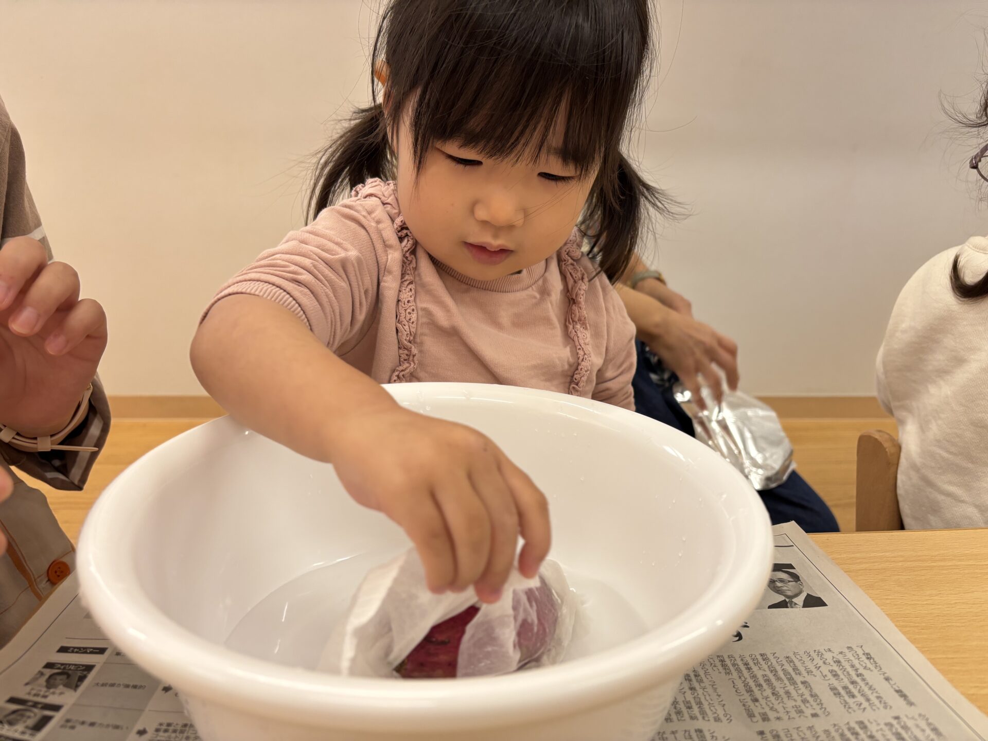「どうやってやるのー?」と保育者のお手本を見ながら、上手にお芋を包んでいました。流石のあめ組さんです✨