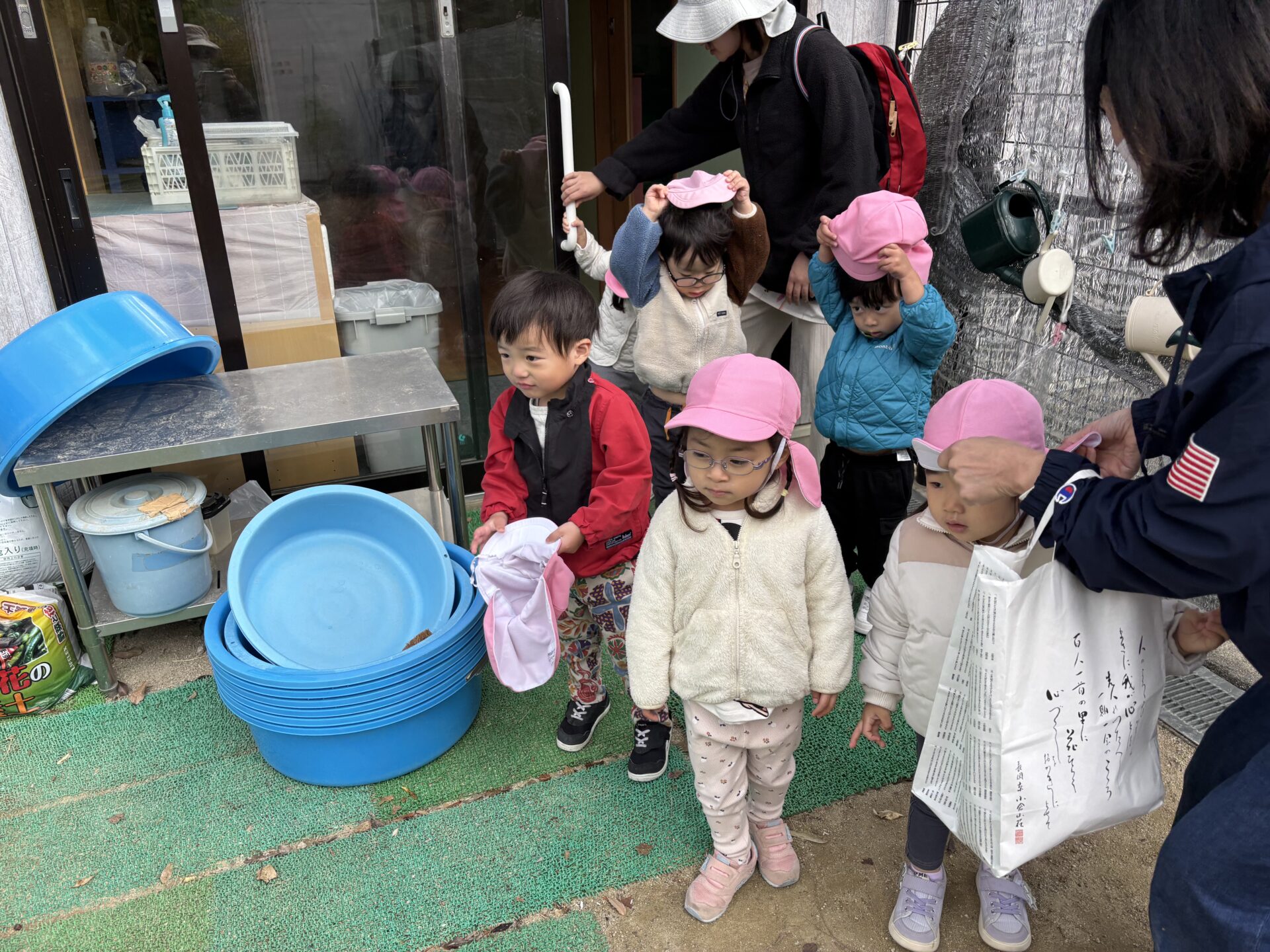 お芋を受け取ると「おっきいー!」「こっちは細長いよ〜!?」とそれぞれのお芋の形の違いに気づき、楽しそうにお喋りしていましたよ☺️