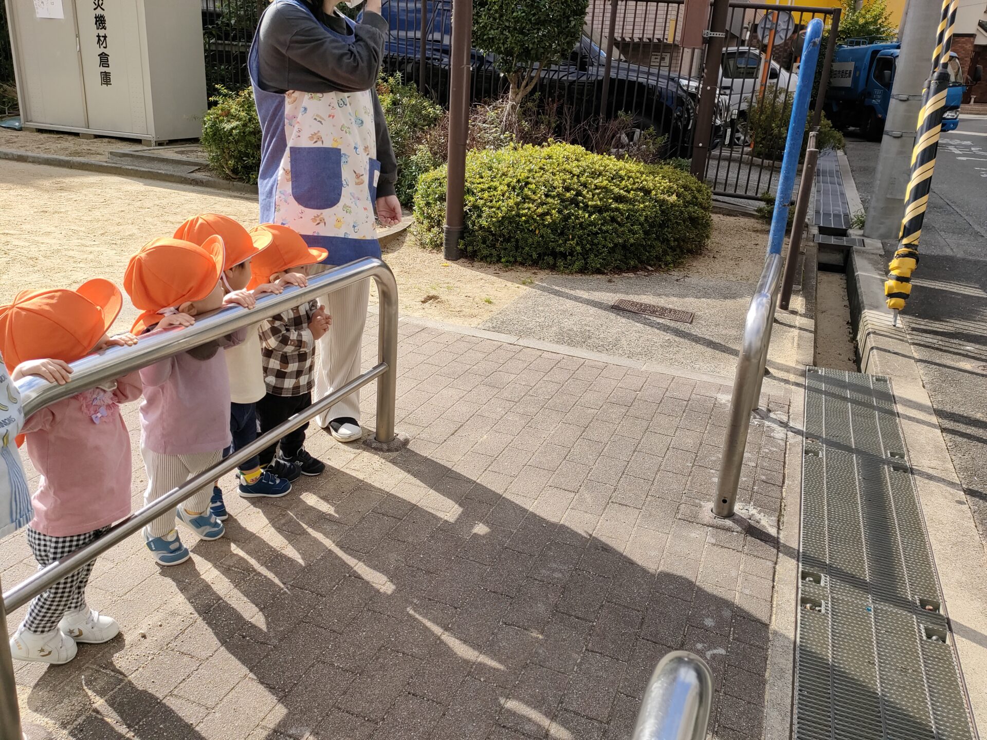 ゴミ収集車の音が聞こえると、立ち止まり、キョロキョロしながら探す子ども達。