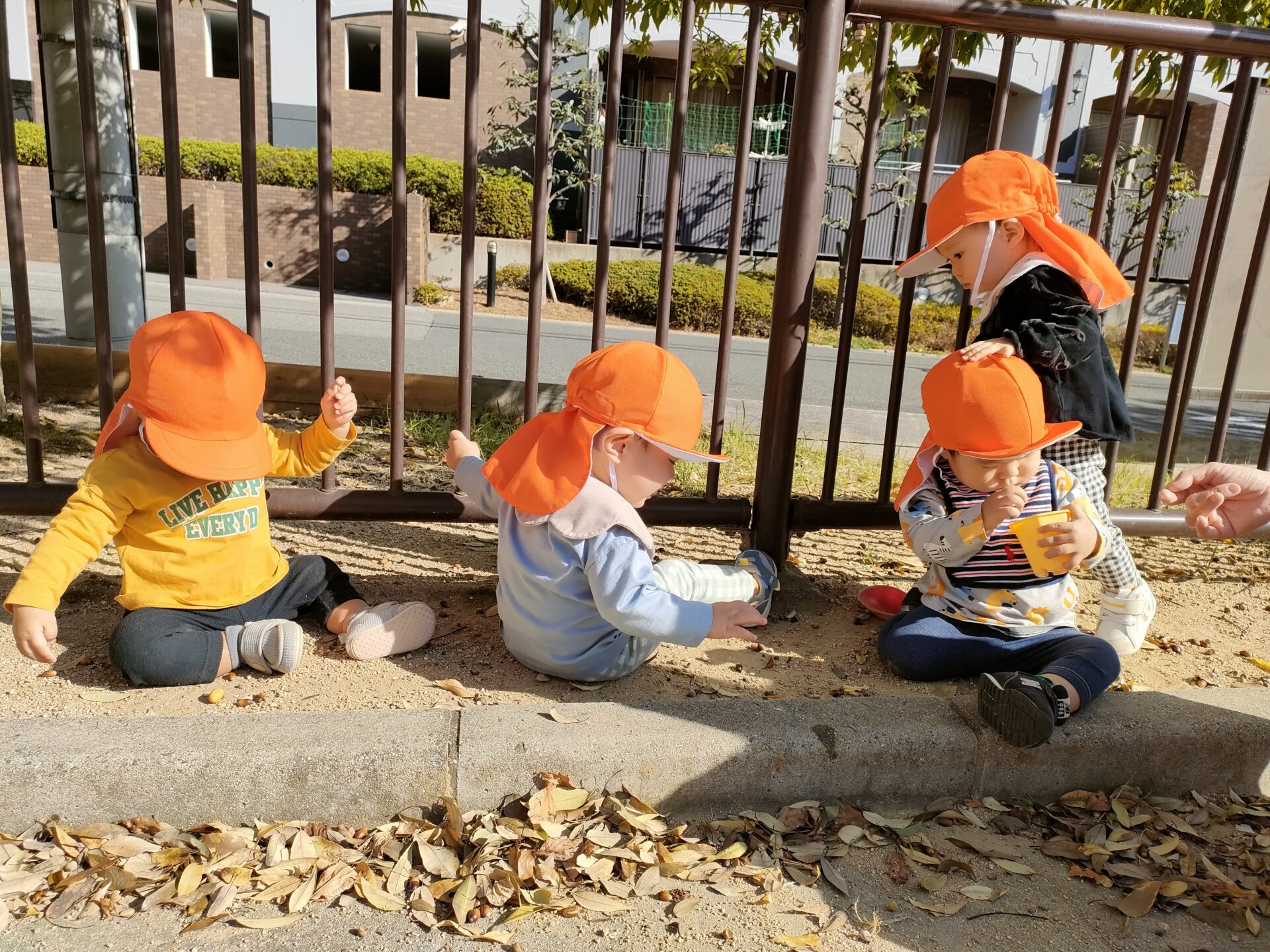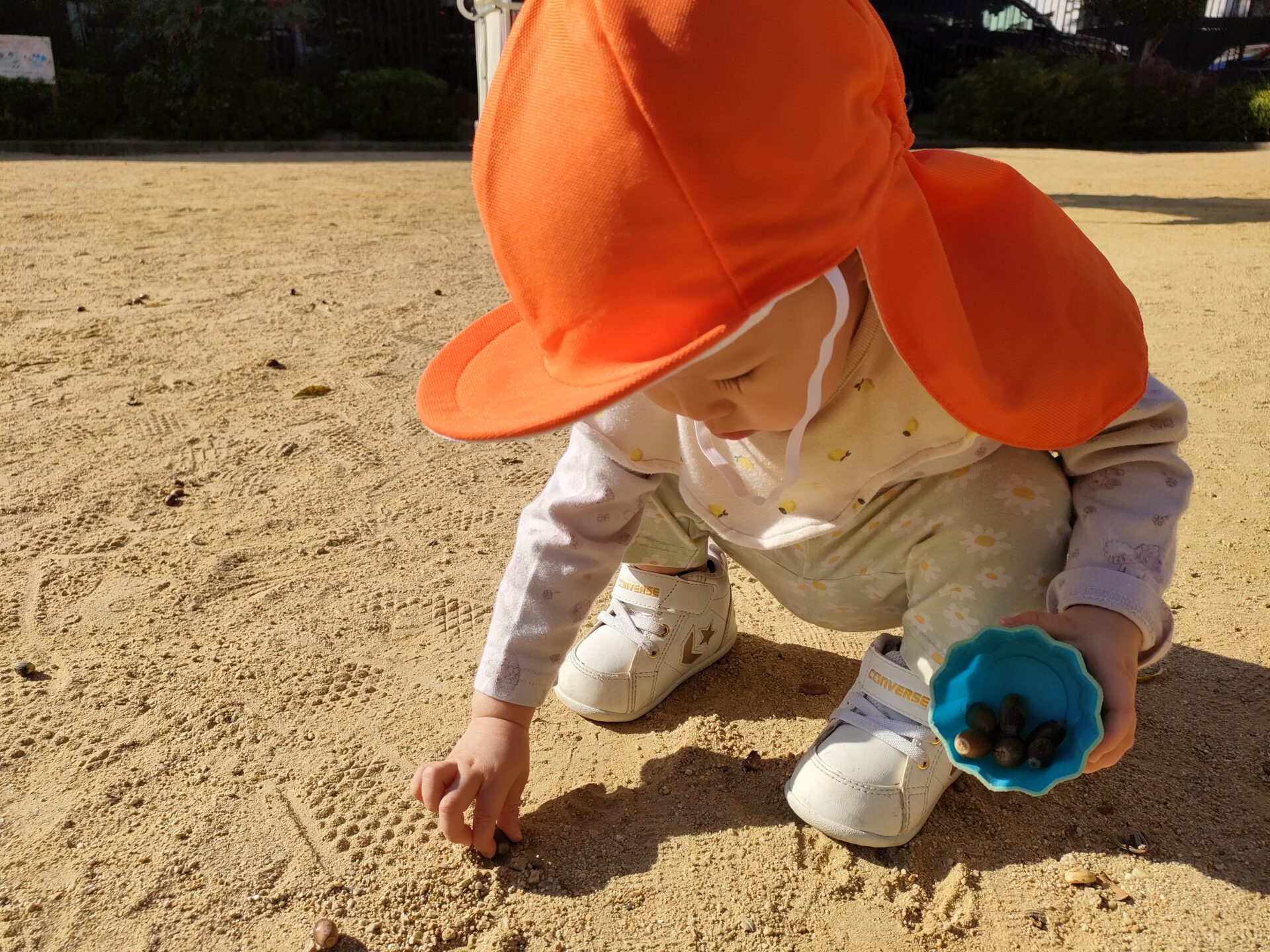 どんぐりを見つけると、大事そうに握っています。砂遊びの容器にたくさん集めるお友だちもいますよ。