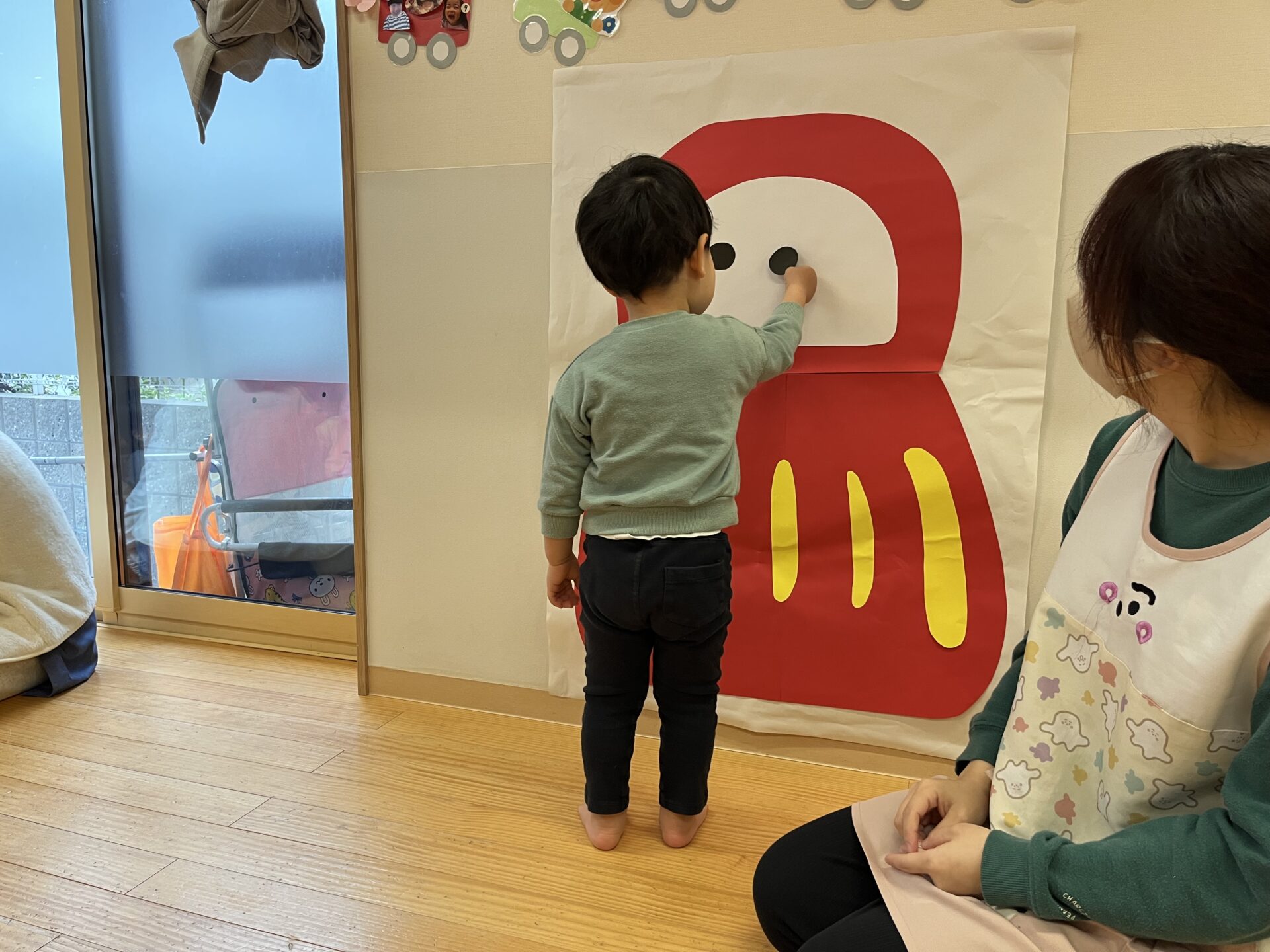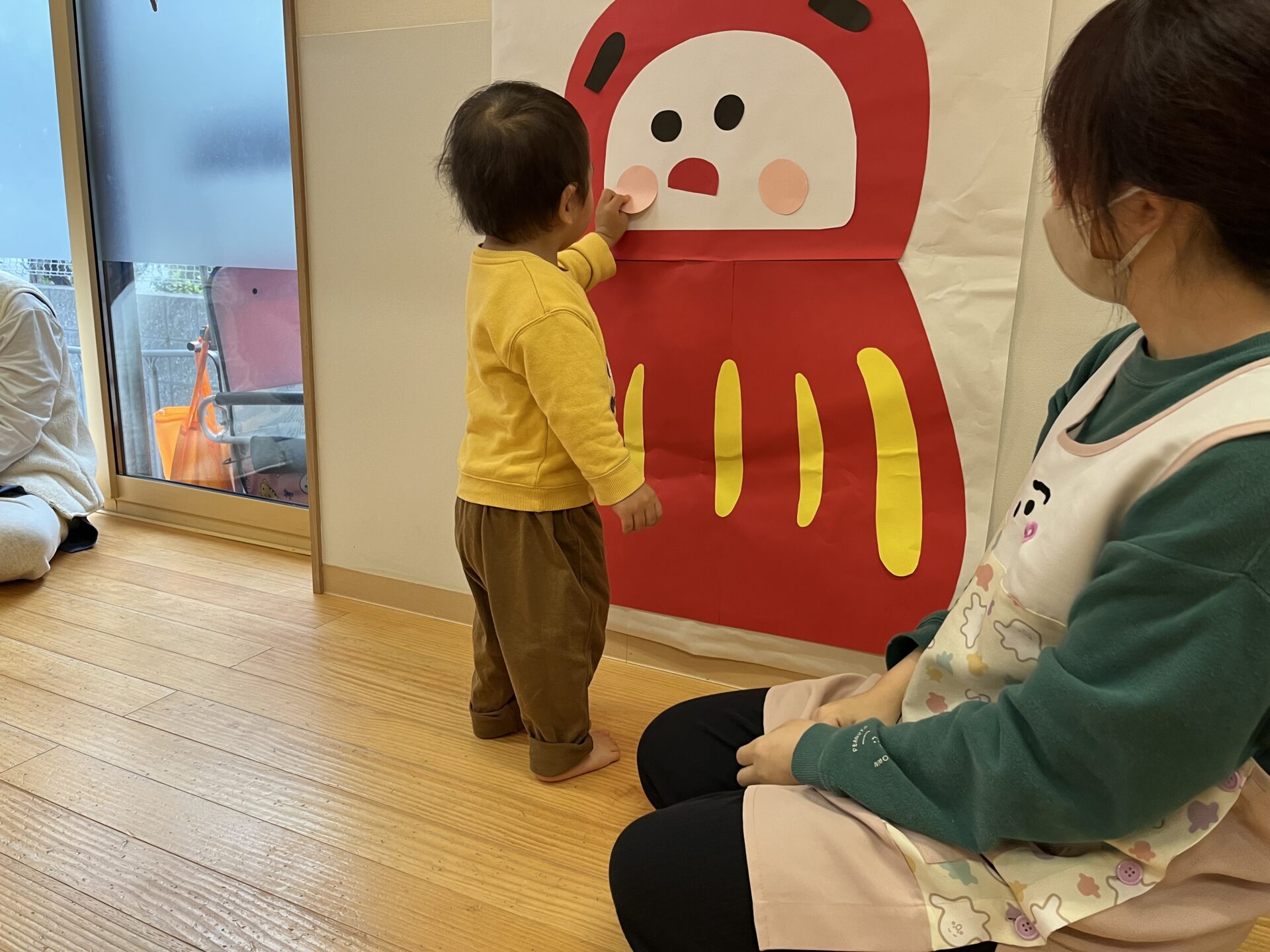 子どもたちは思い思いの場所にパーツを貼り、少しずつだるまの顔が出来上がってきました!