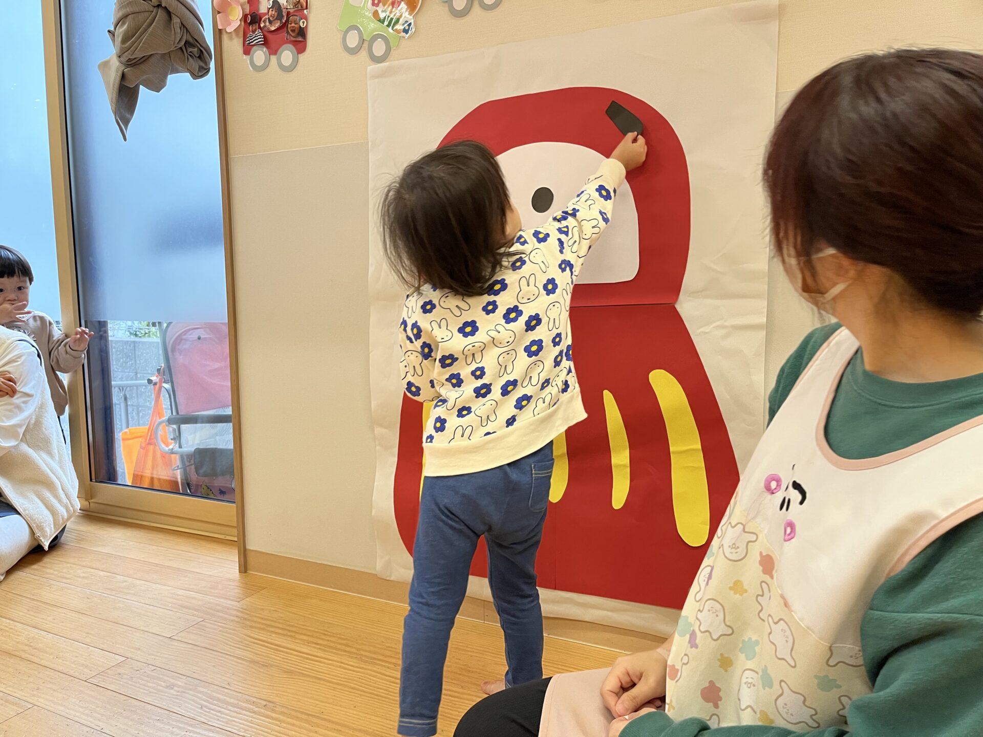 少し早いですが、お正月に向けて共同製作を行い、クラスみんなで大きなだるまを作りました。