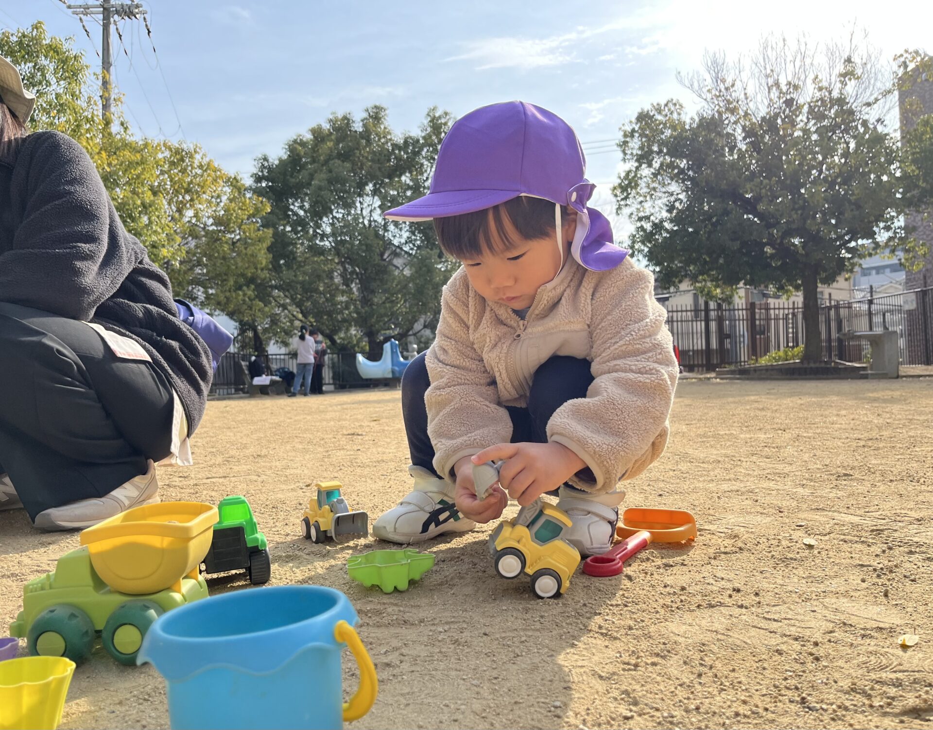 だいち組さんはお砂遊びが大好き。お気に入りの車を走らせたり、バケツやカップに砂を入れていろいろなものをイメージしながら、お砂遊びを楽しんでいますよ。
