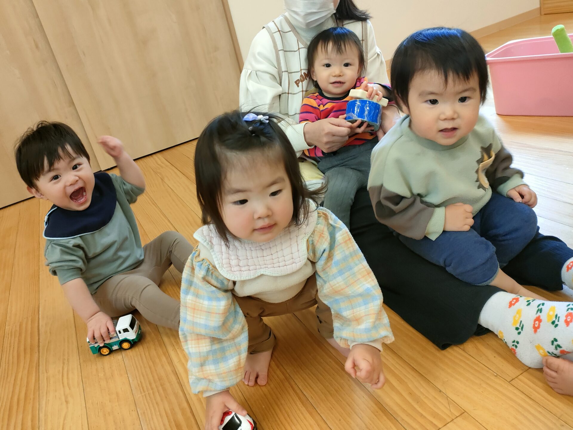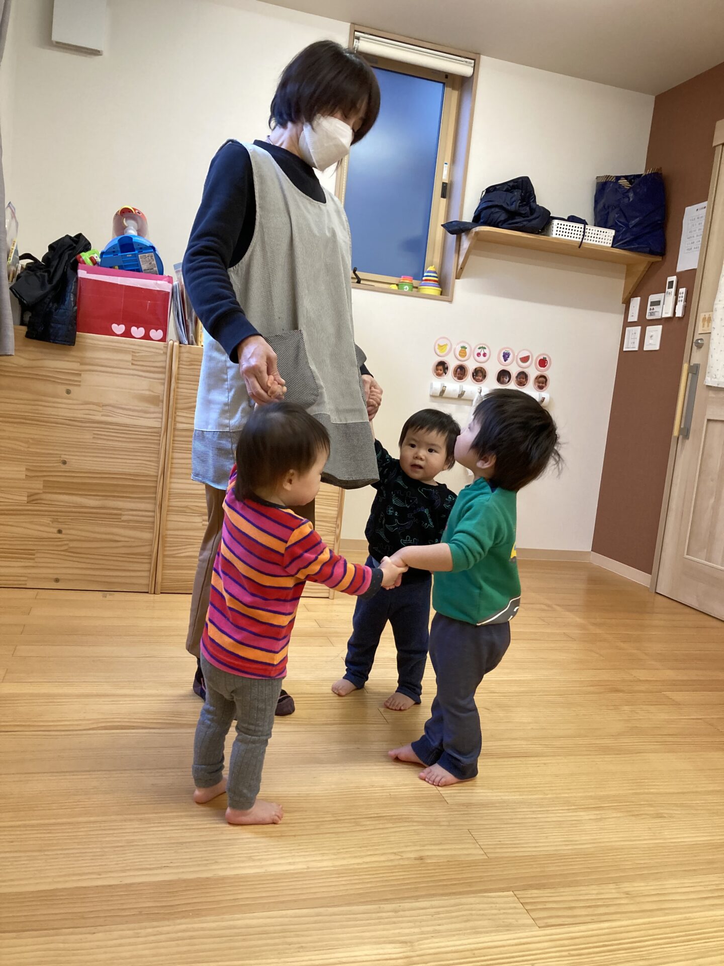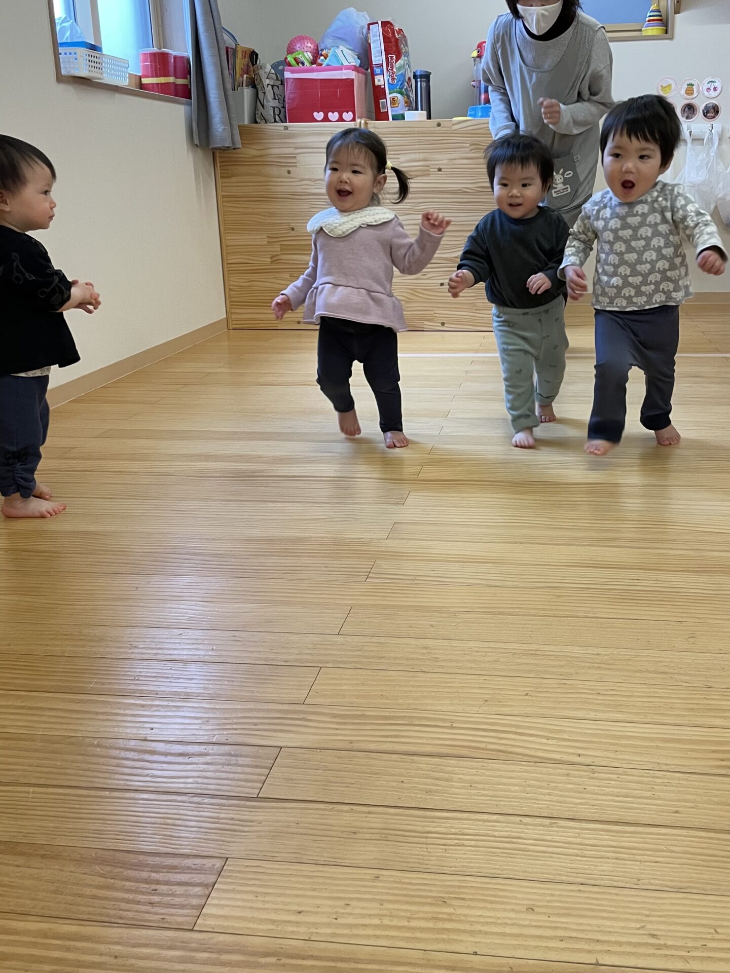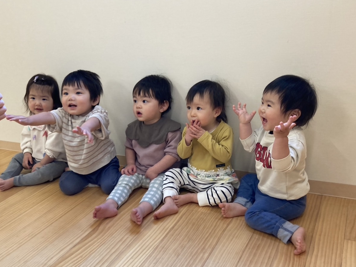 歩行の発達はさまざまですが、お互いに歩調を合わせてリズム遊びも楽しんでいます。