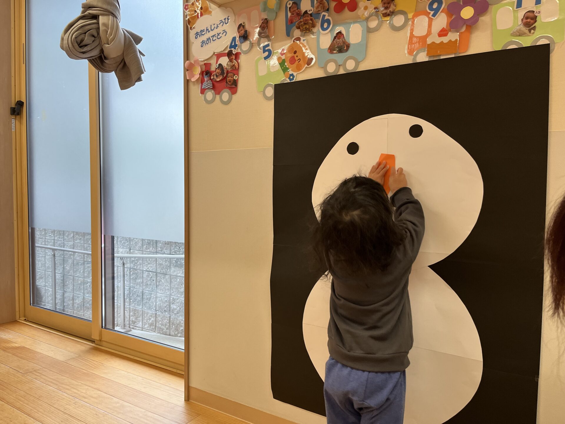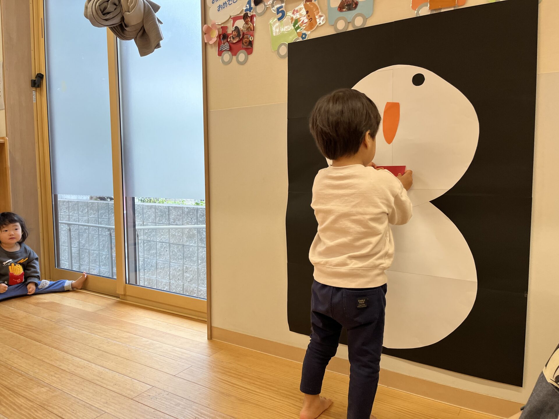 子どもたちが登園してくる前からお部屋の壁に貼って準備していたので、