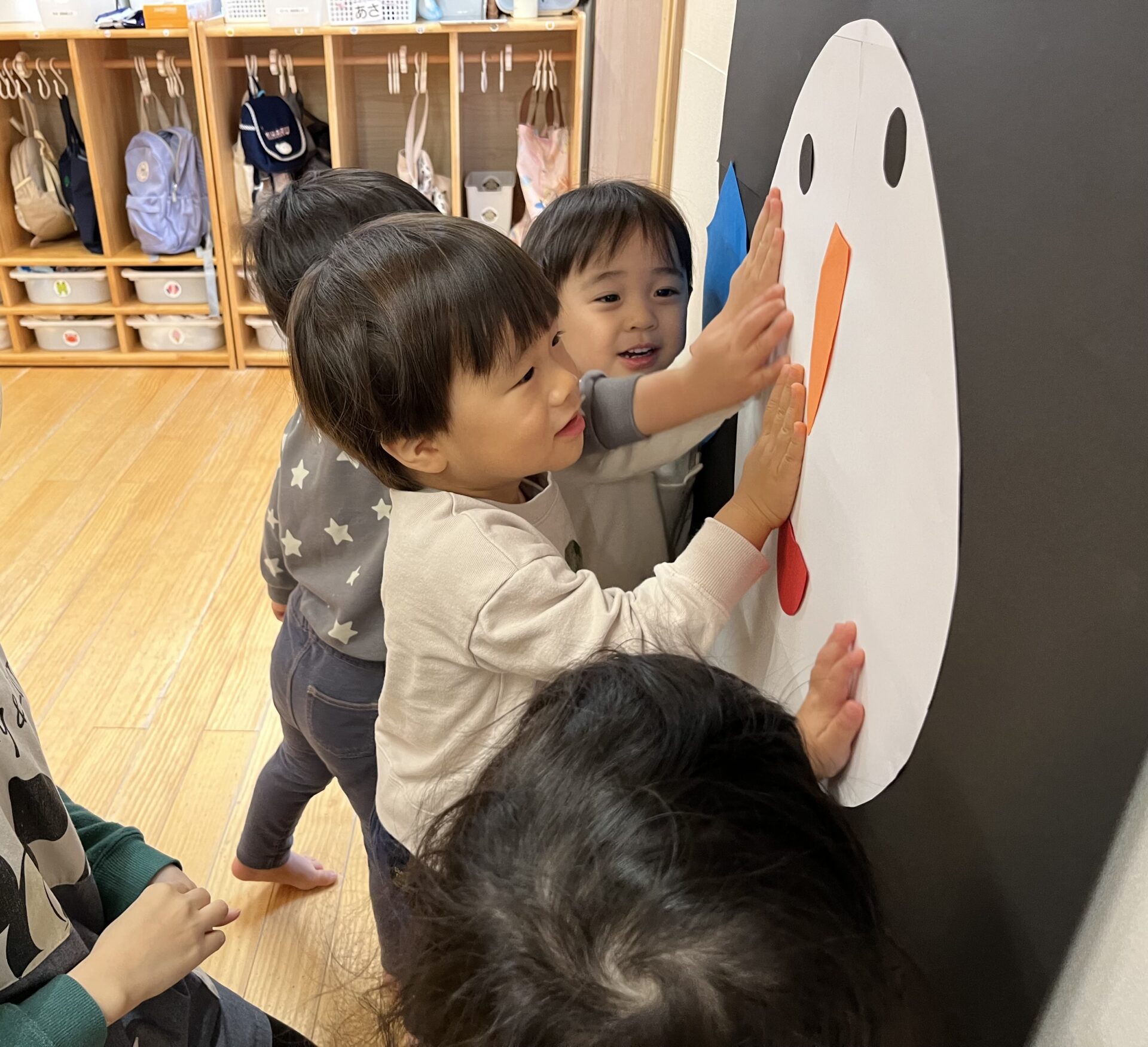 保育者が「ご挨拶しておいで〜」と声掛けすると一斉に雪だるまさんの元に集まり、「こんにちは〜」「僕は〇〇です!」「一緒に遊ぼうね〜」と自己紹介をしながら出会いを喜んでいましたよ♩