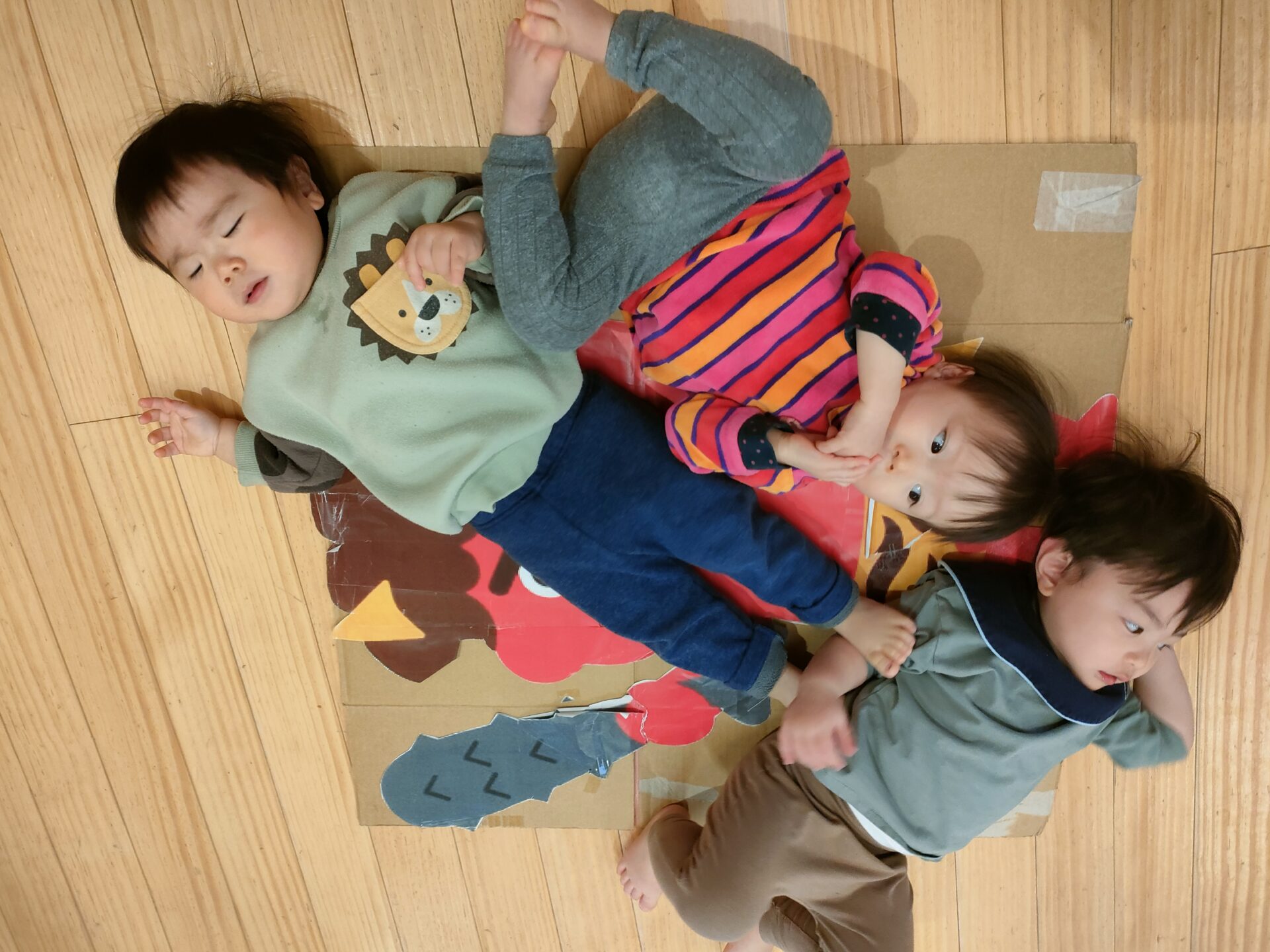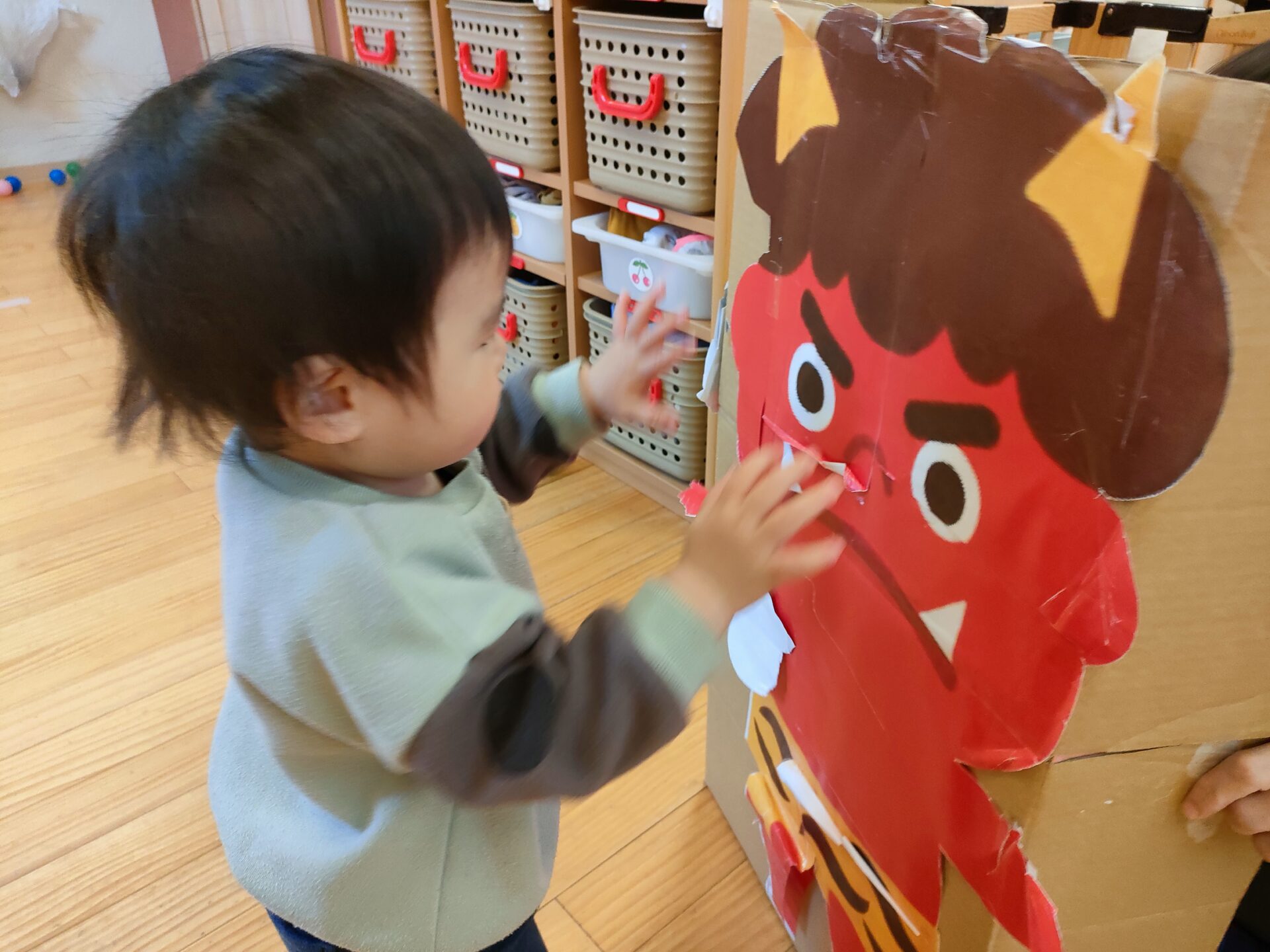 子ども達の背丈くらいのダンボールに貼り付けた鬼が登場しても、怖がるどころか、