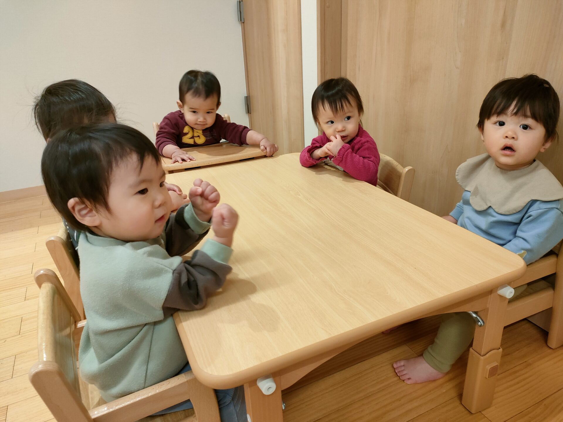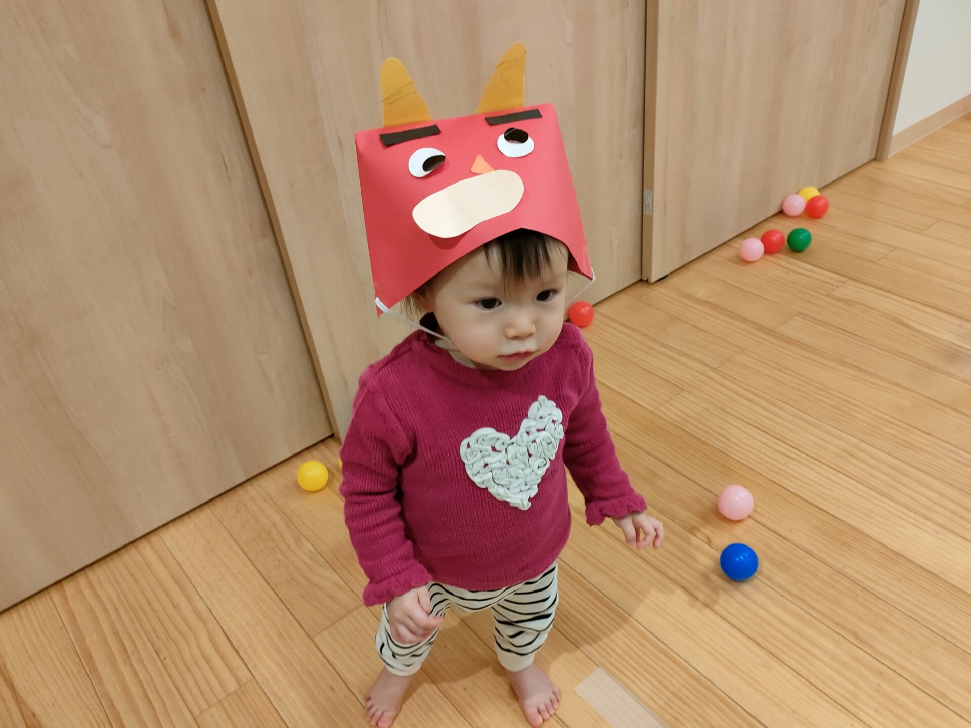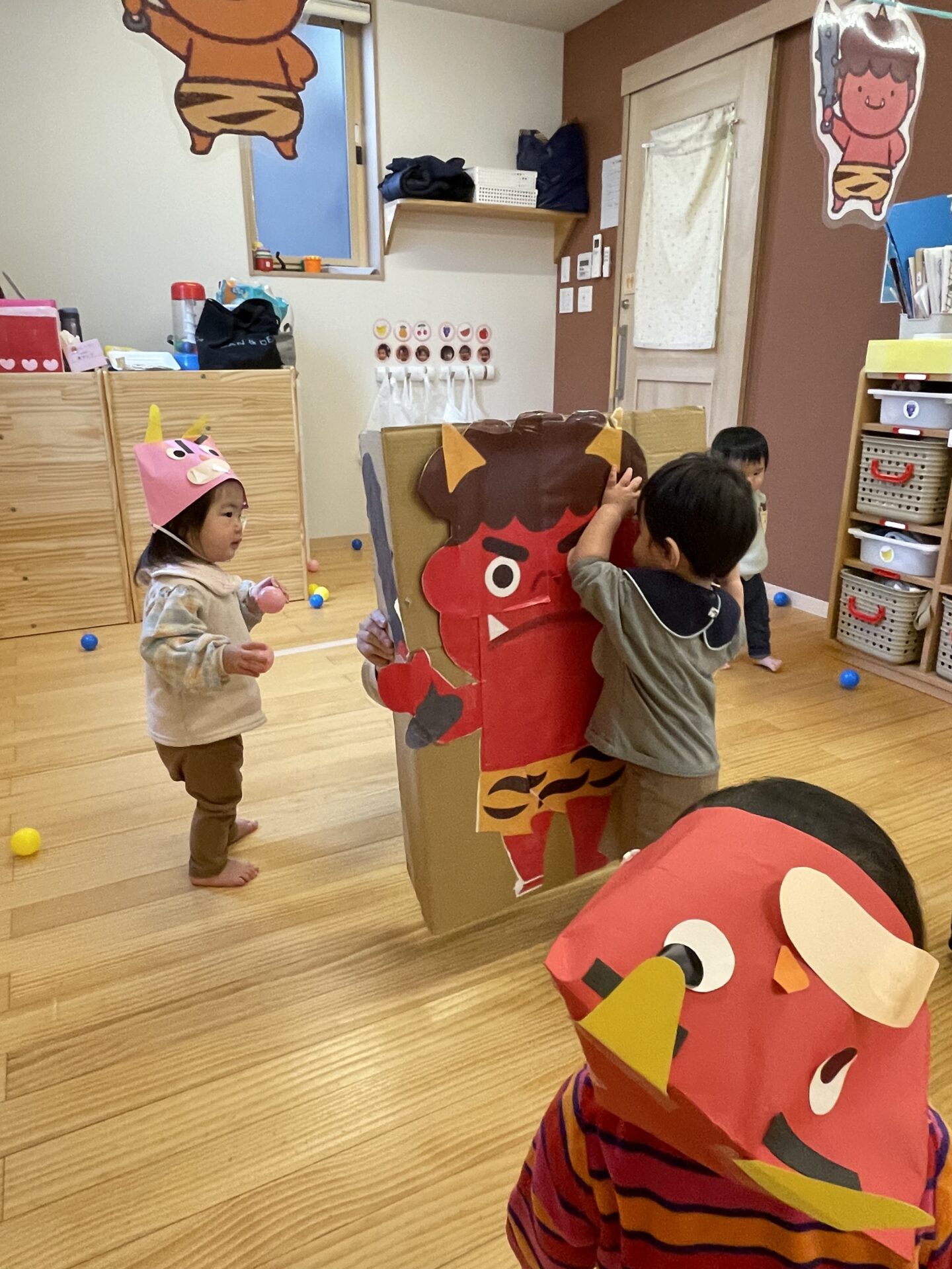 できたお面を、お部屋に飾り、鬼のパンツや、豆まきの歌を楽しみました。🎵