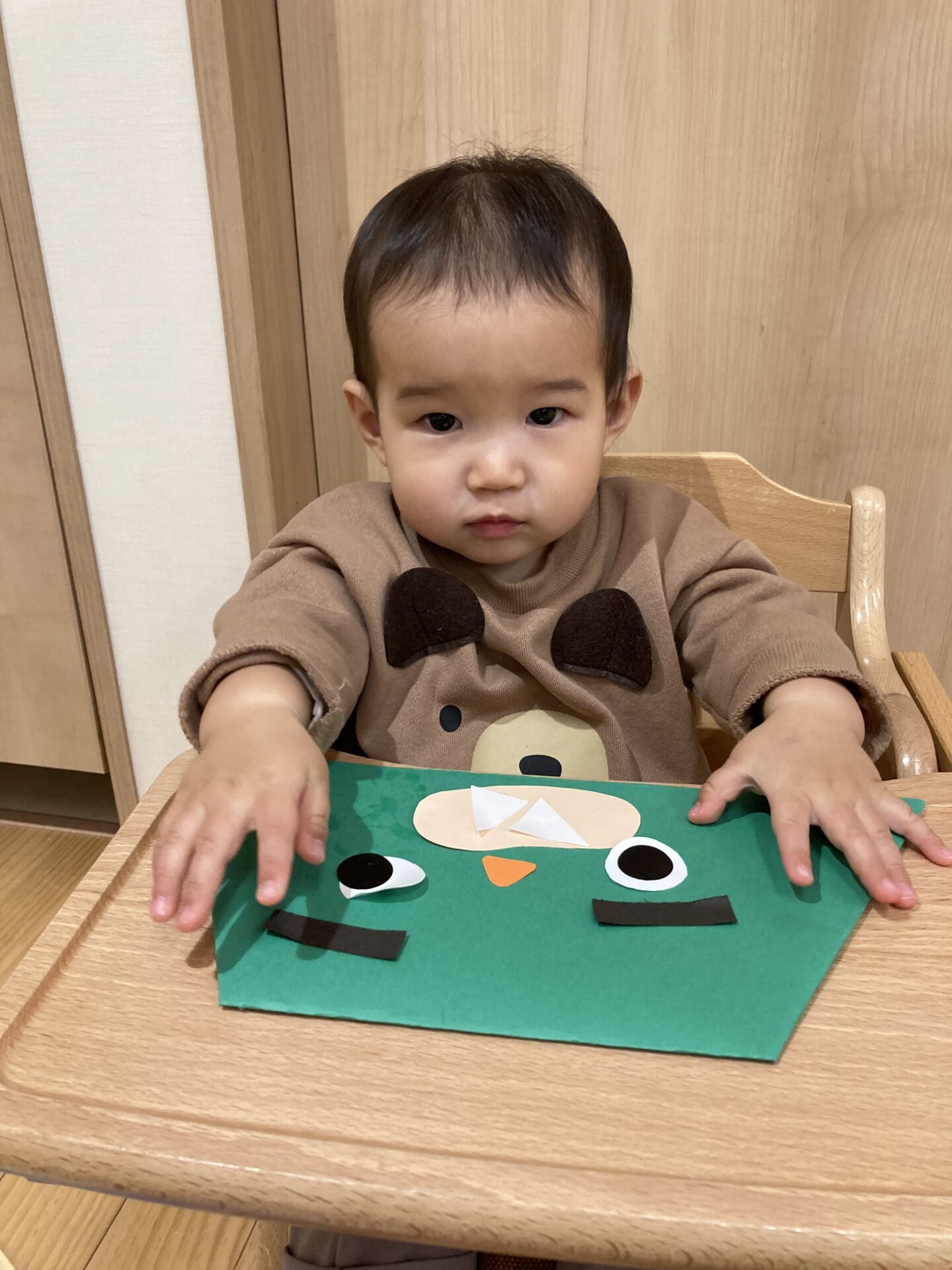 鬼の顔の色を自分で選び、保育者と一緒に顔のパーツを貼り付けていきました。