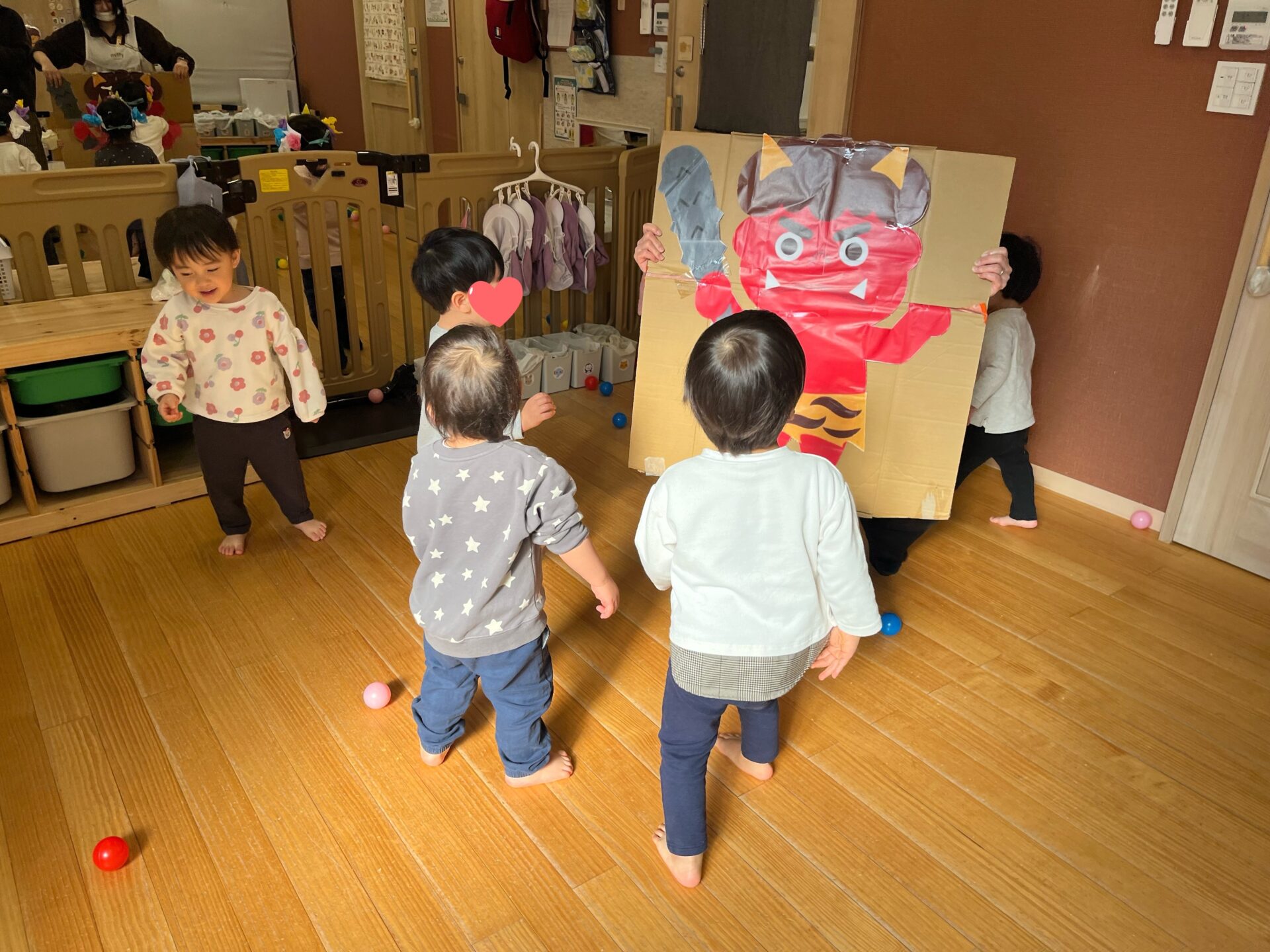 子ども達と同じくらいの大きさ鬼には少し驚きつつも、子どもたちは一生懸命鬼退治することができました✨