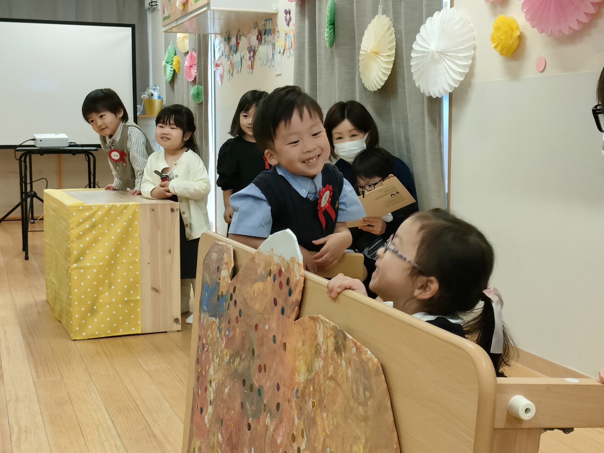 保育者に名前を呼ばれると、しっかりお返事をしてみんなの前へ立ちました。