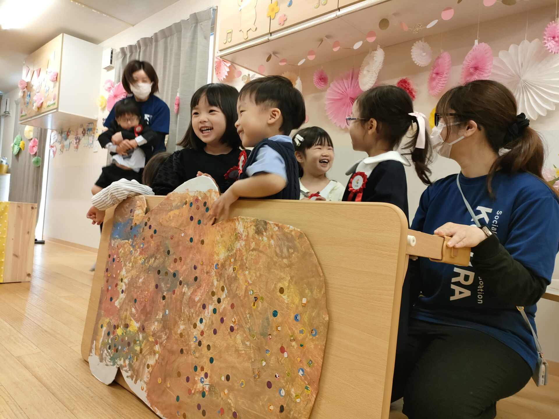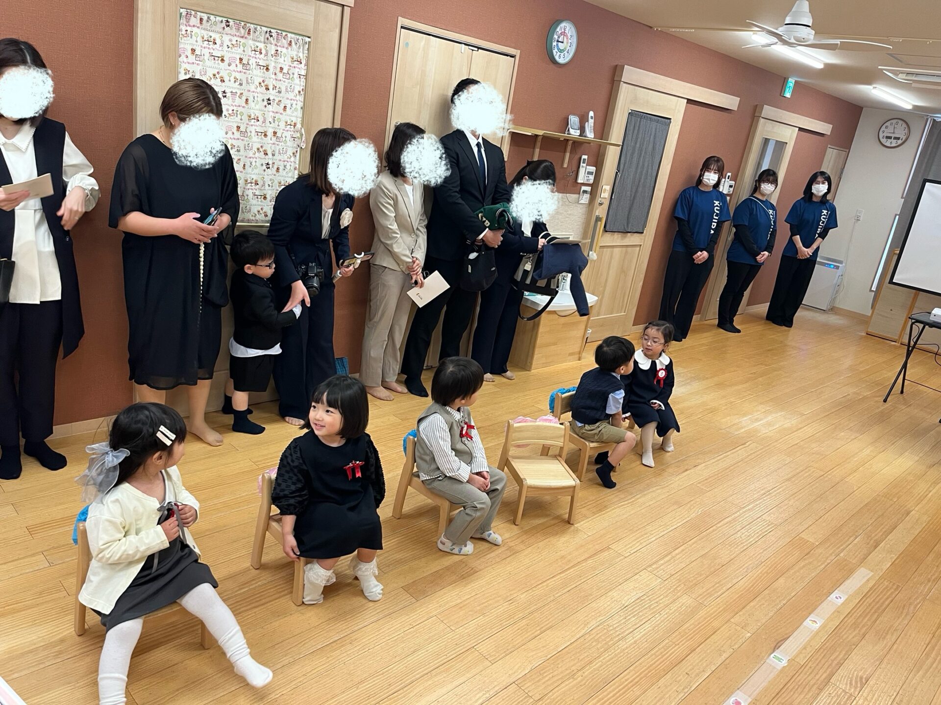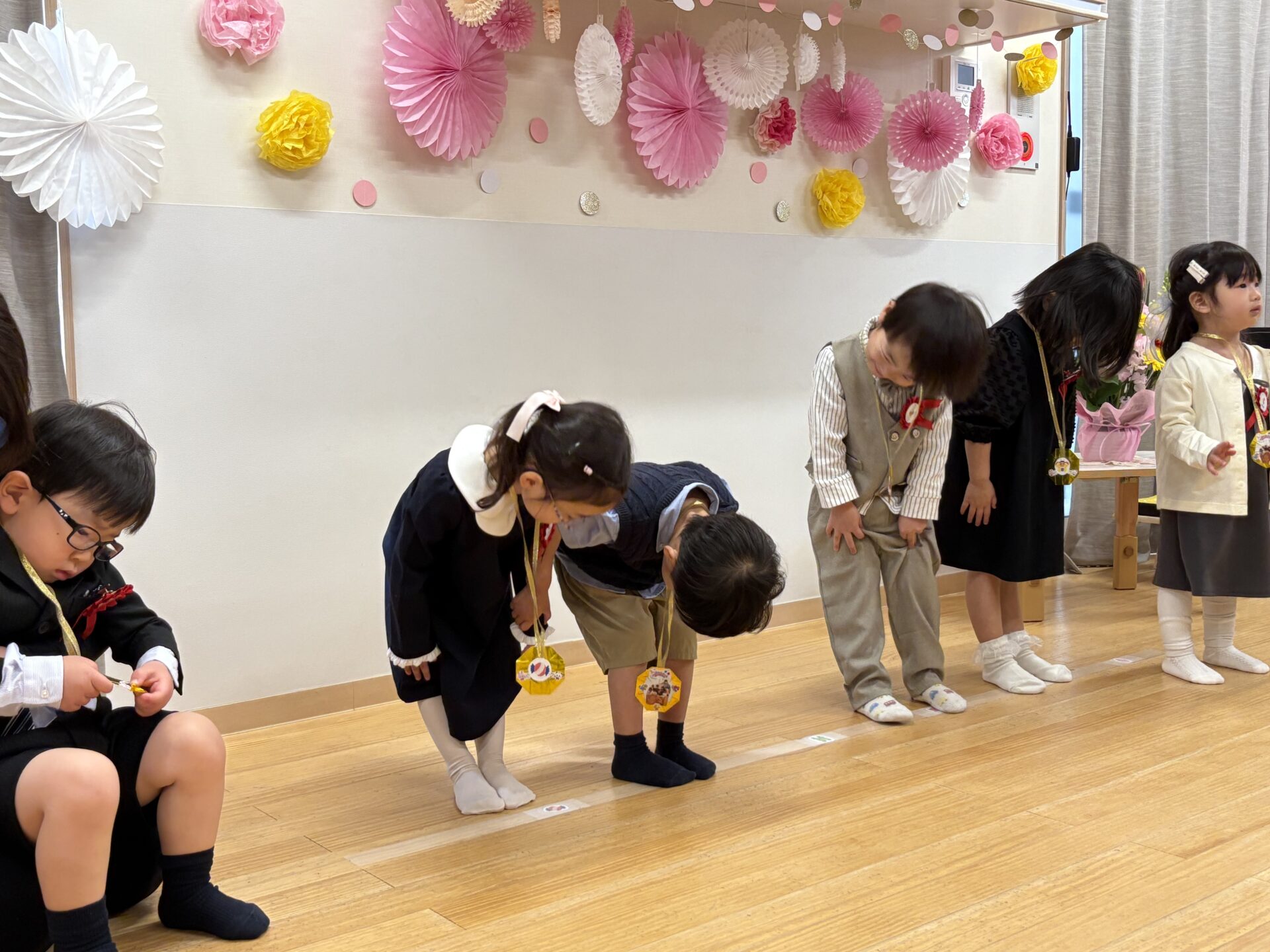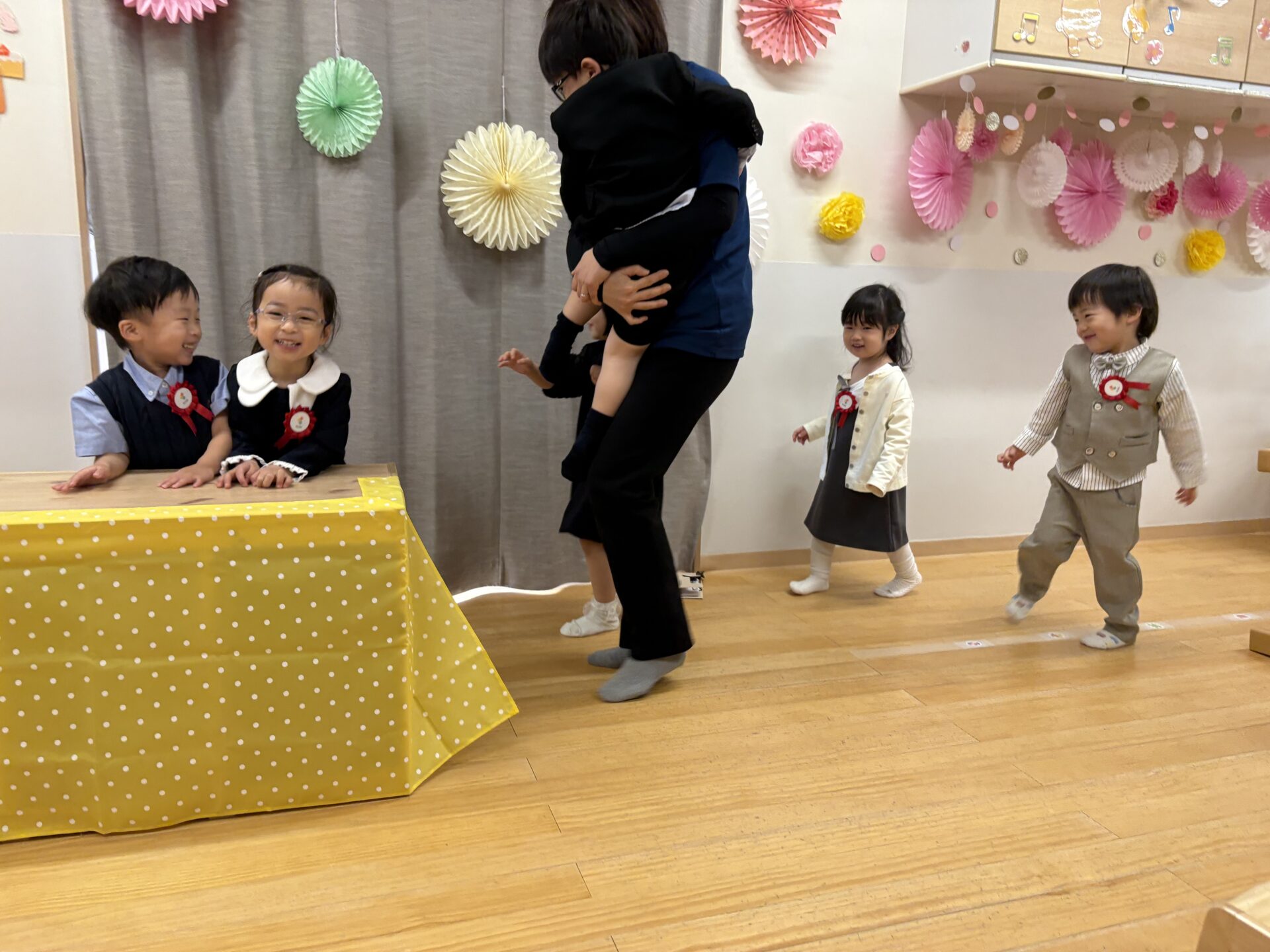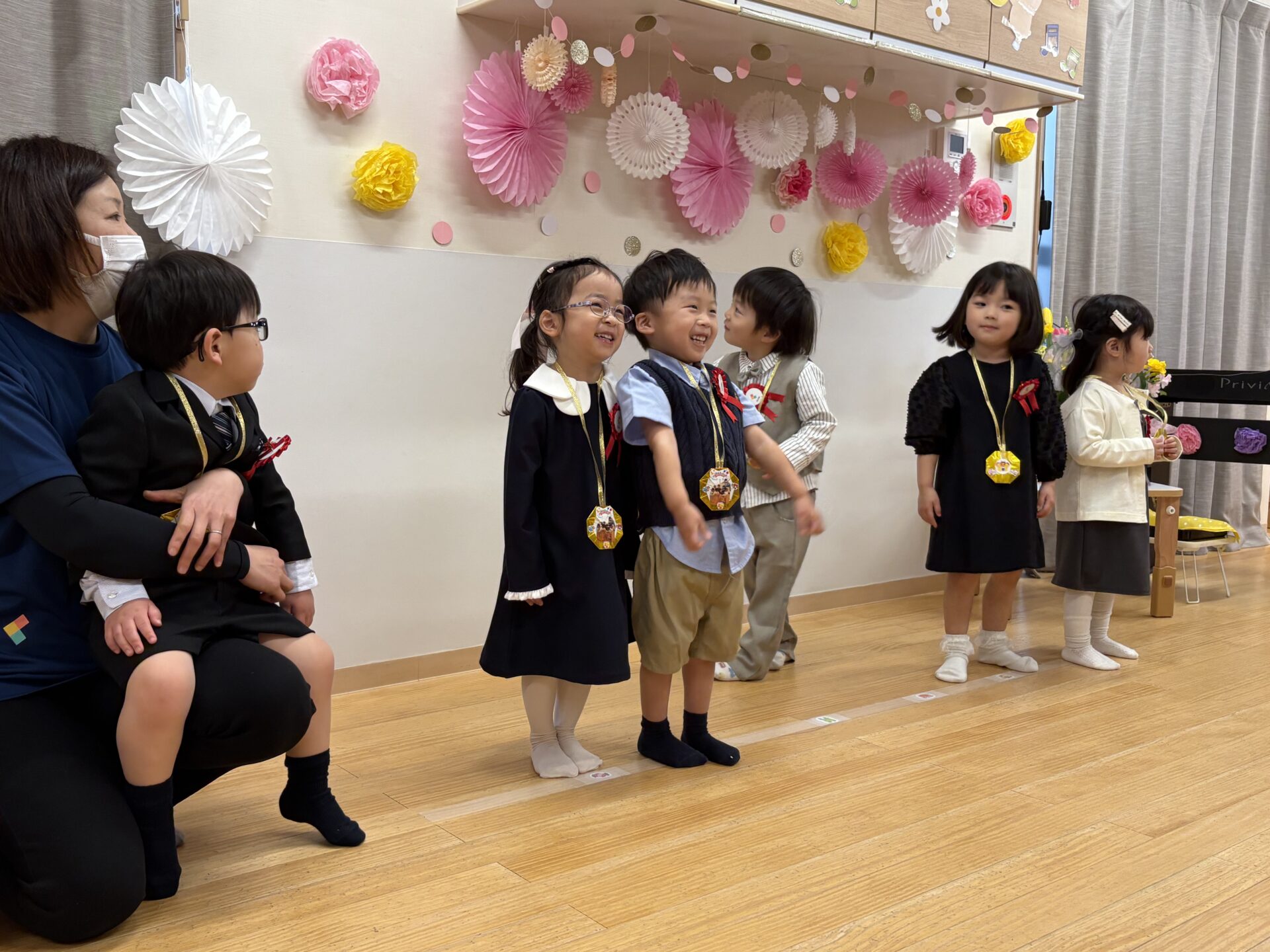 桜が咲く中、おめかしした素敵な姿で元気いっぱい登園してきてくれたあめ組さん✨普段とは違ったお部屋の雰囲気に少し緊張する姿もありましたが、お友達を見つけると自然と笑顔になっていました☺️