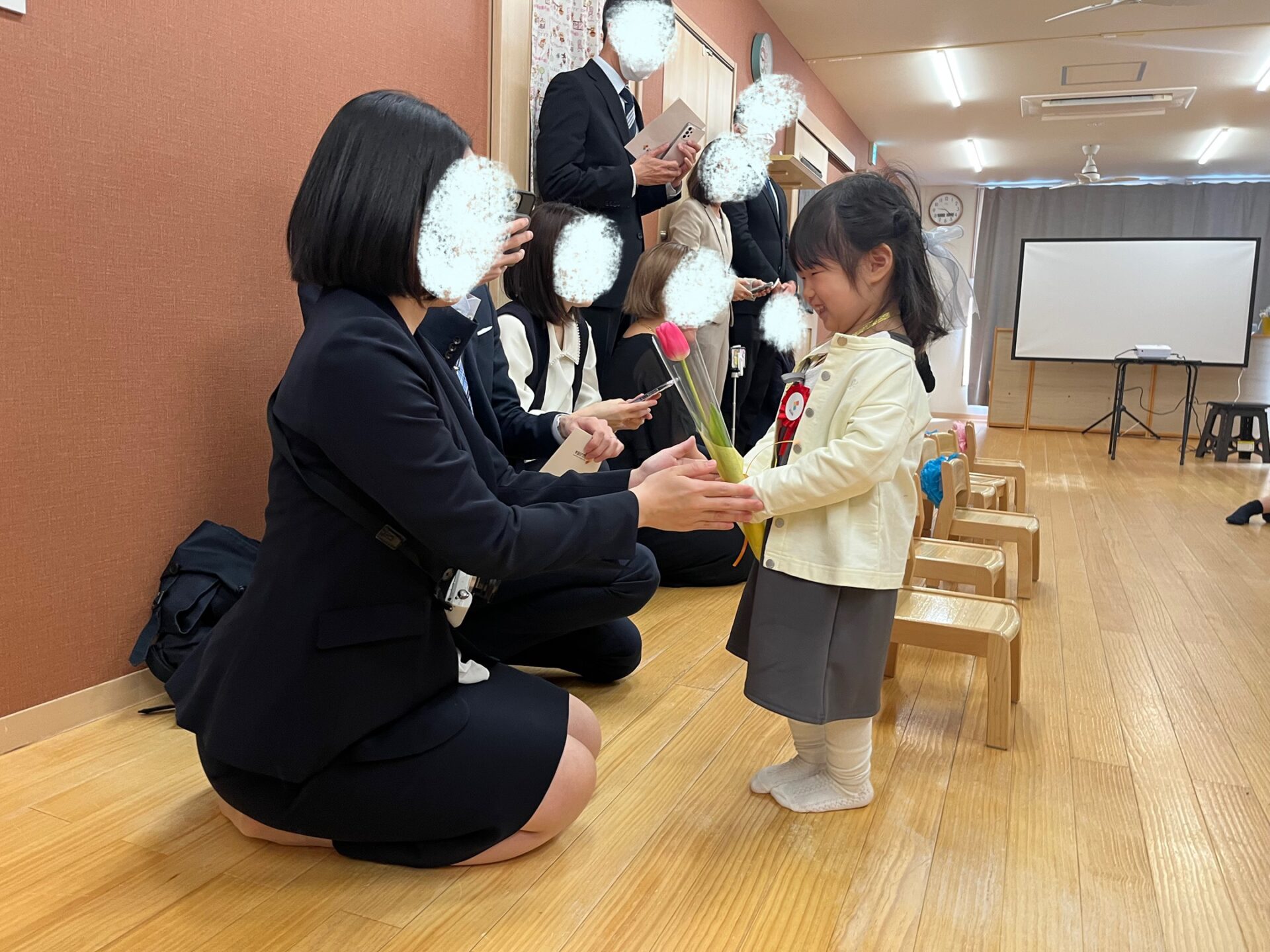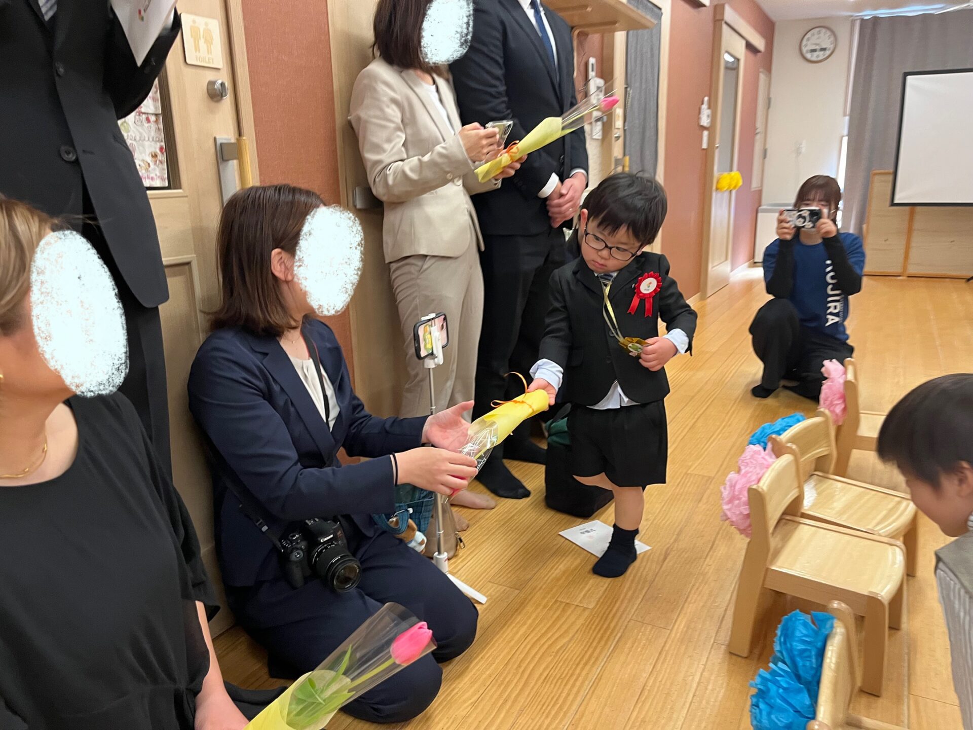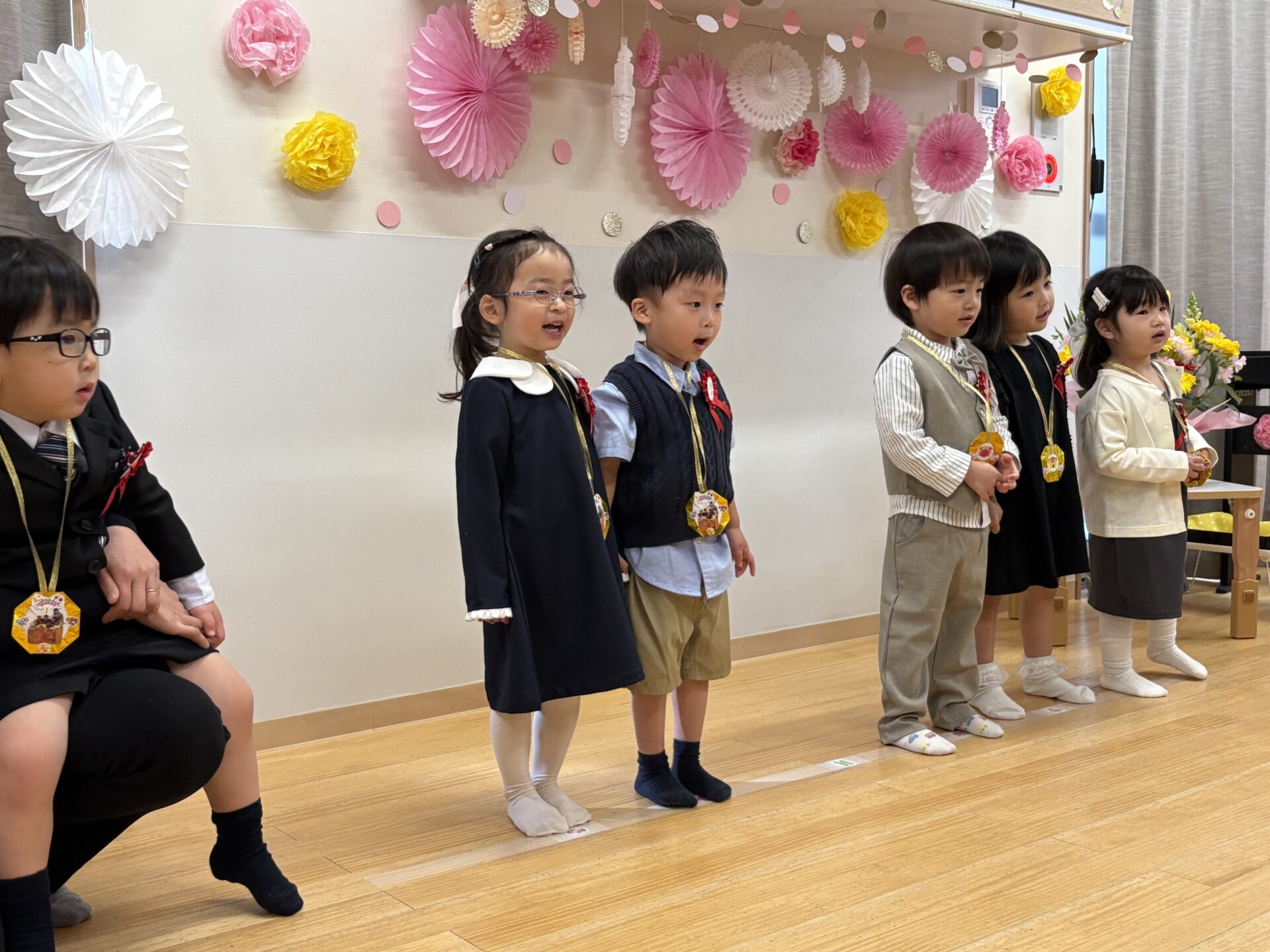 歌のあと、ご両親へお花を渡しました。少し照れたり、笑顔だったりとさまざまな表情を見せながらも、上手に渡していましたね☺️
