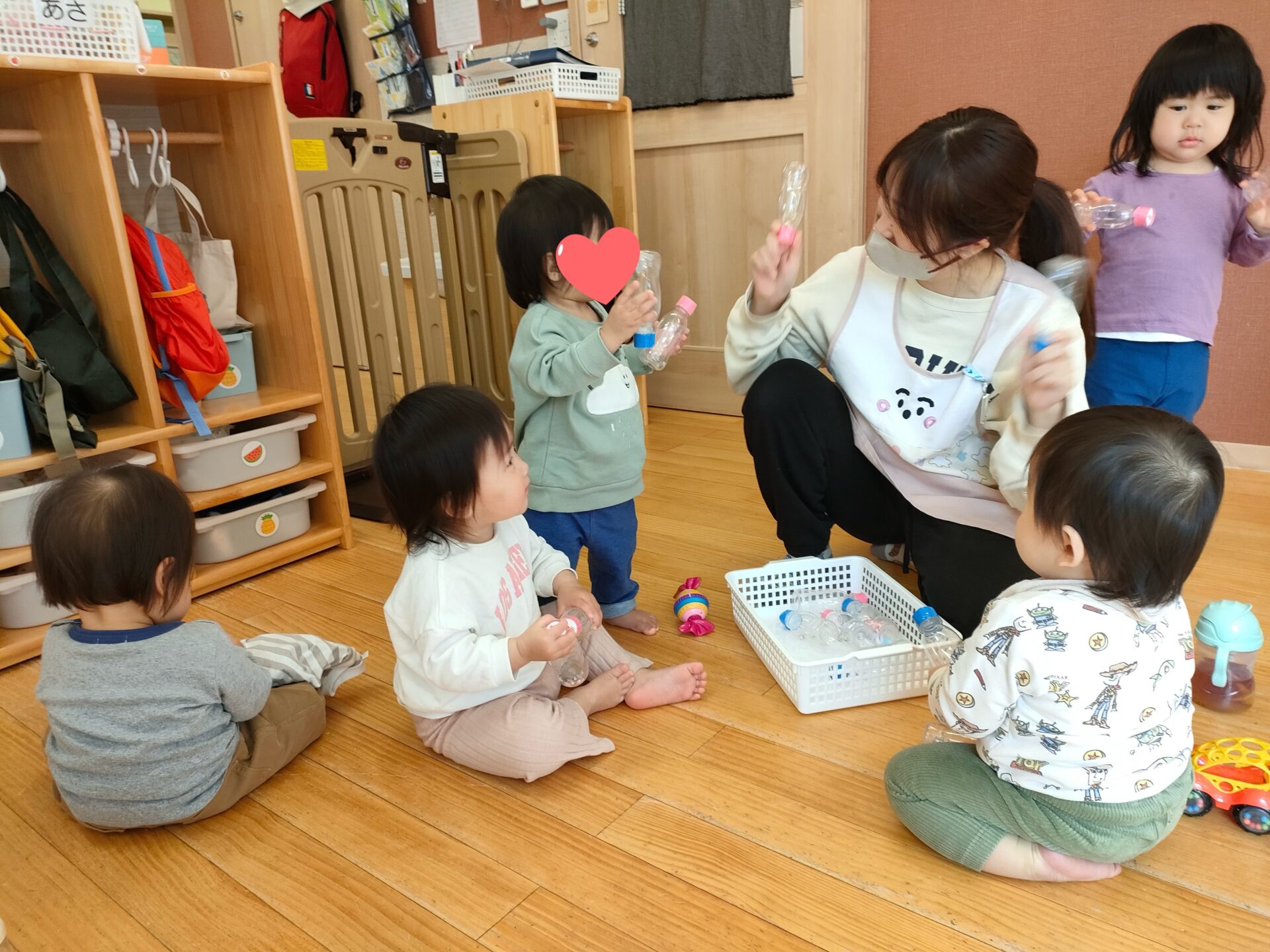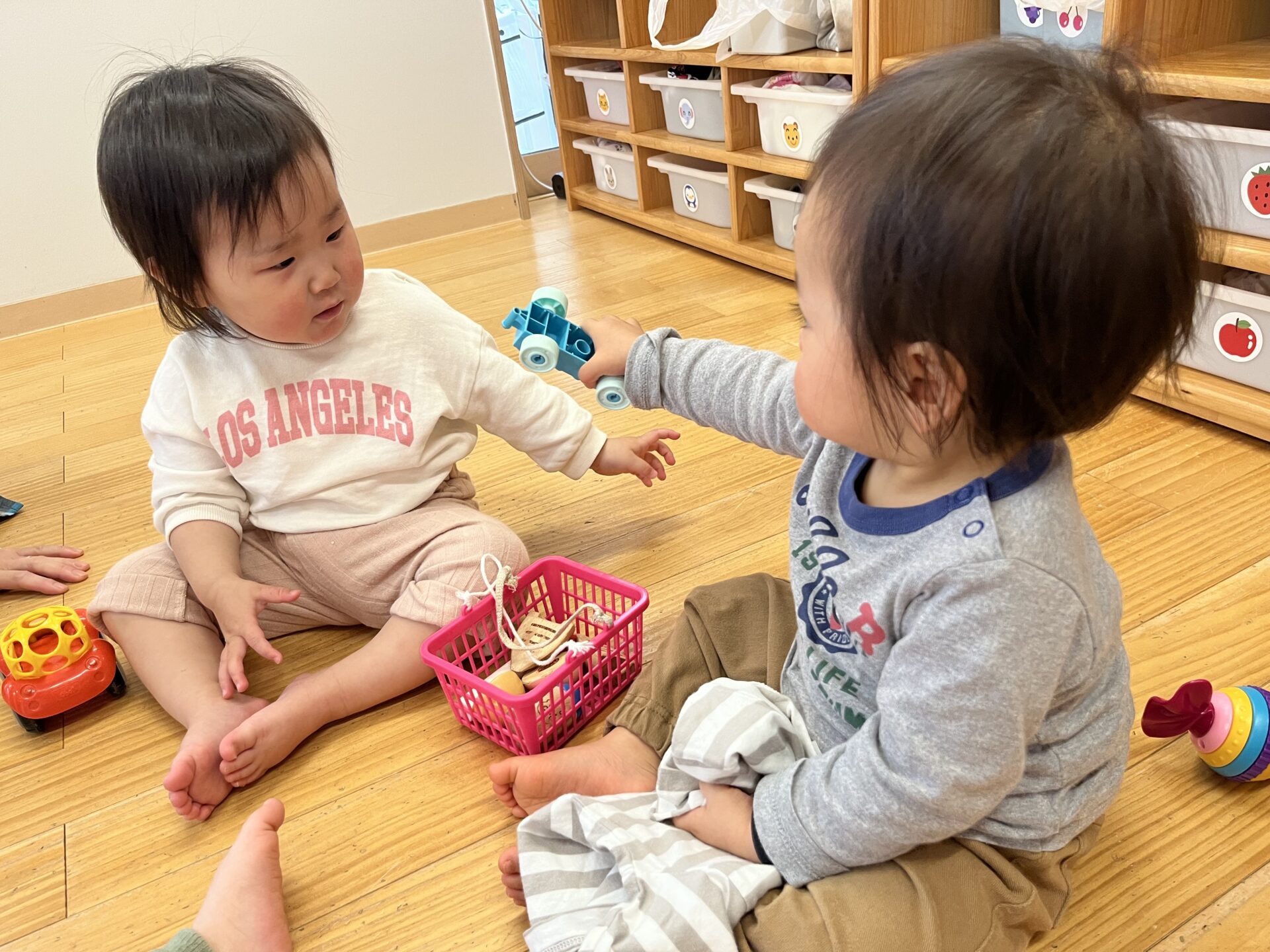 遊びに慣れてきた頃にはお友達同士で玩具を渡し合っていました!