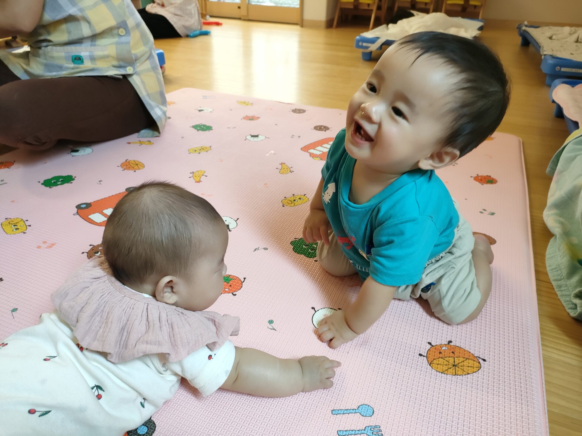 自分よりも月齢の低いお友だちを見て思わずにっこり😄