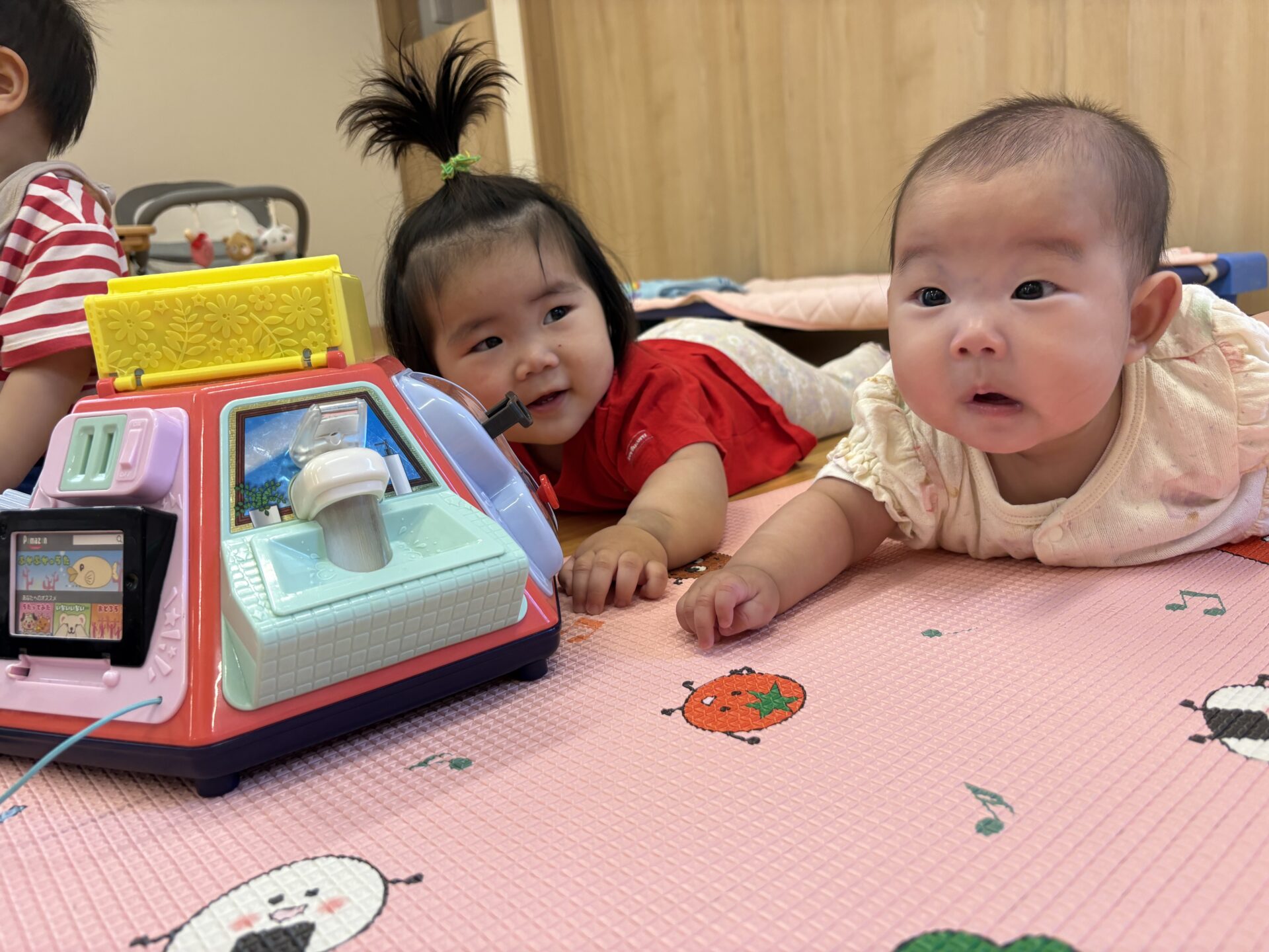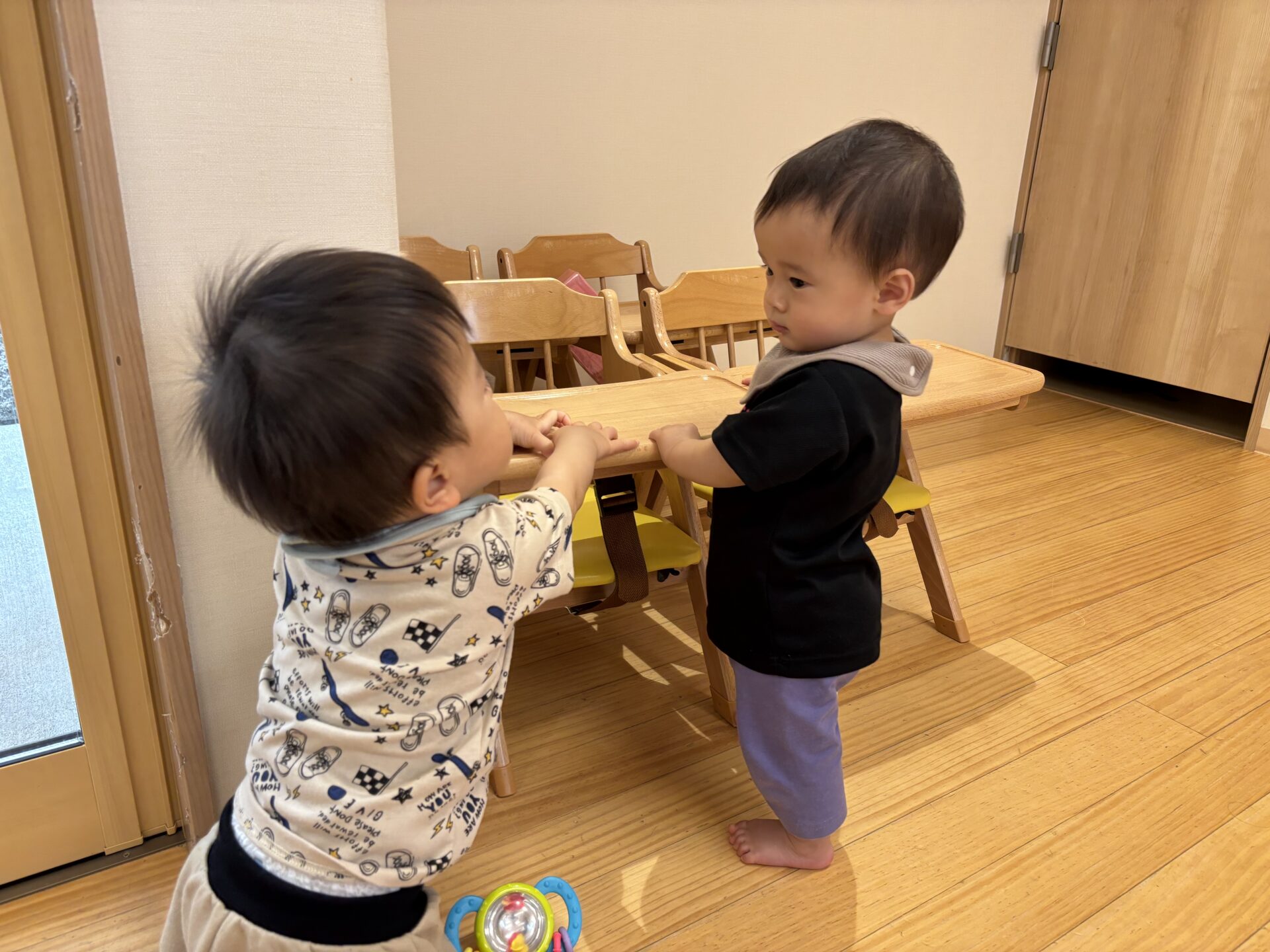 月齢が近いお友だちとは「〇〇くん、つかまり立ちしてるの?僕もしてみようかな😚」と刺激しあいます。