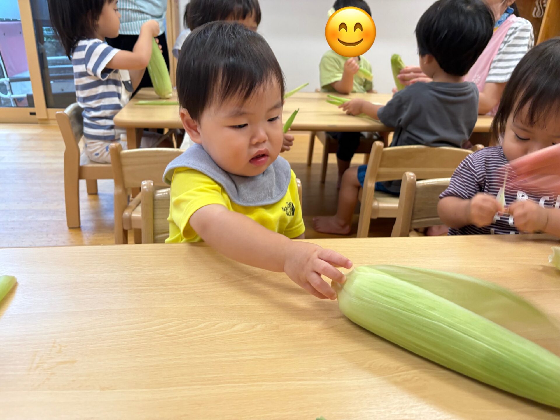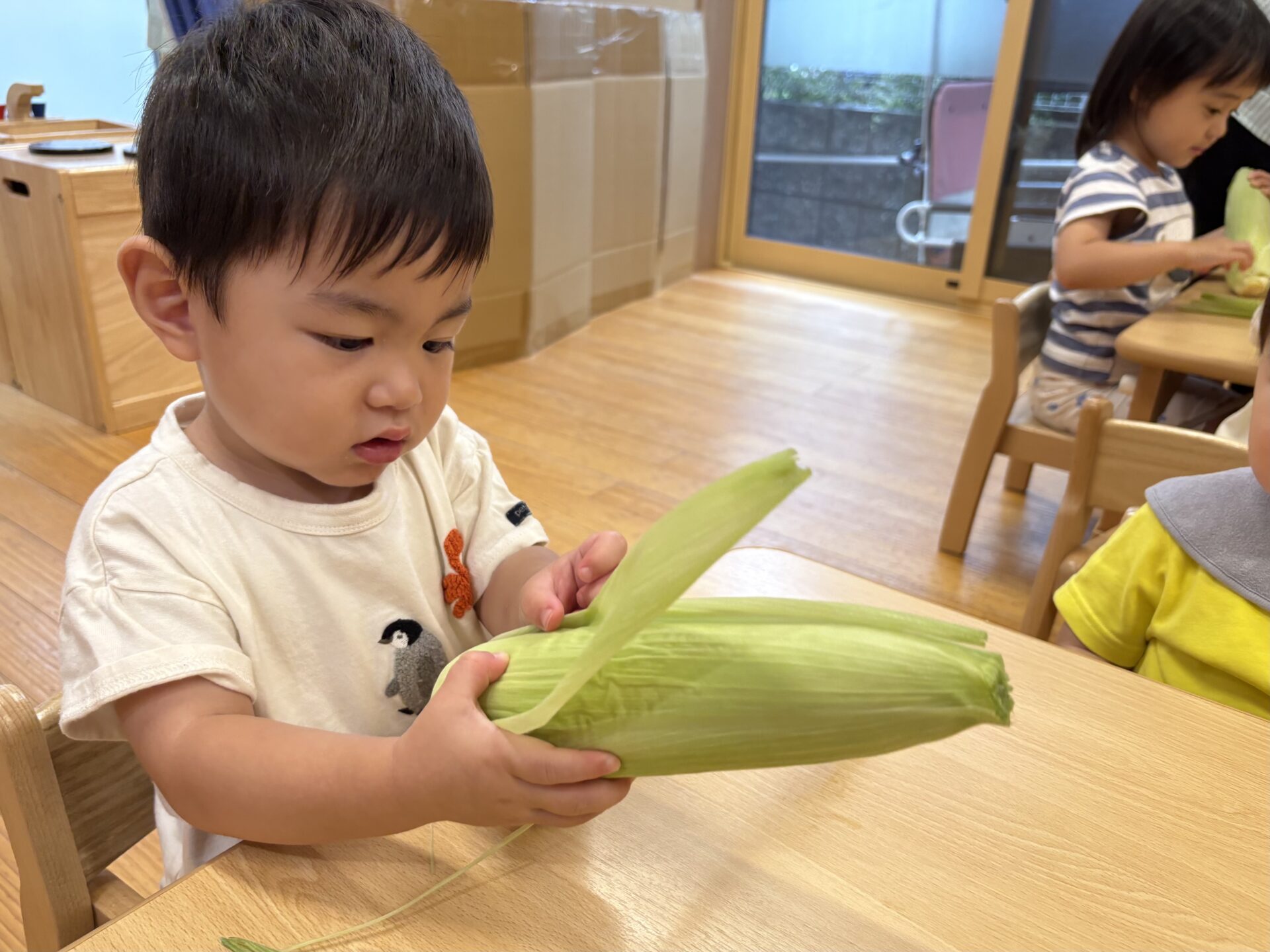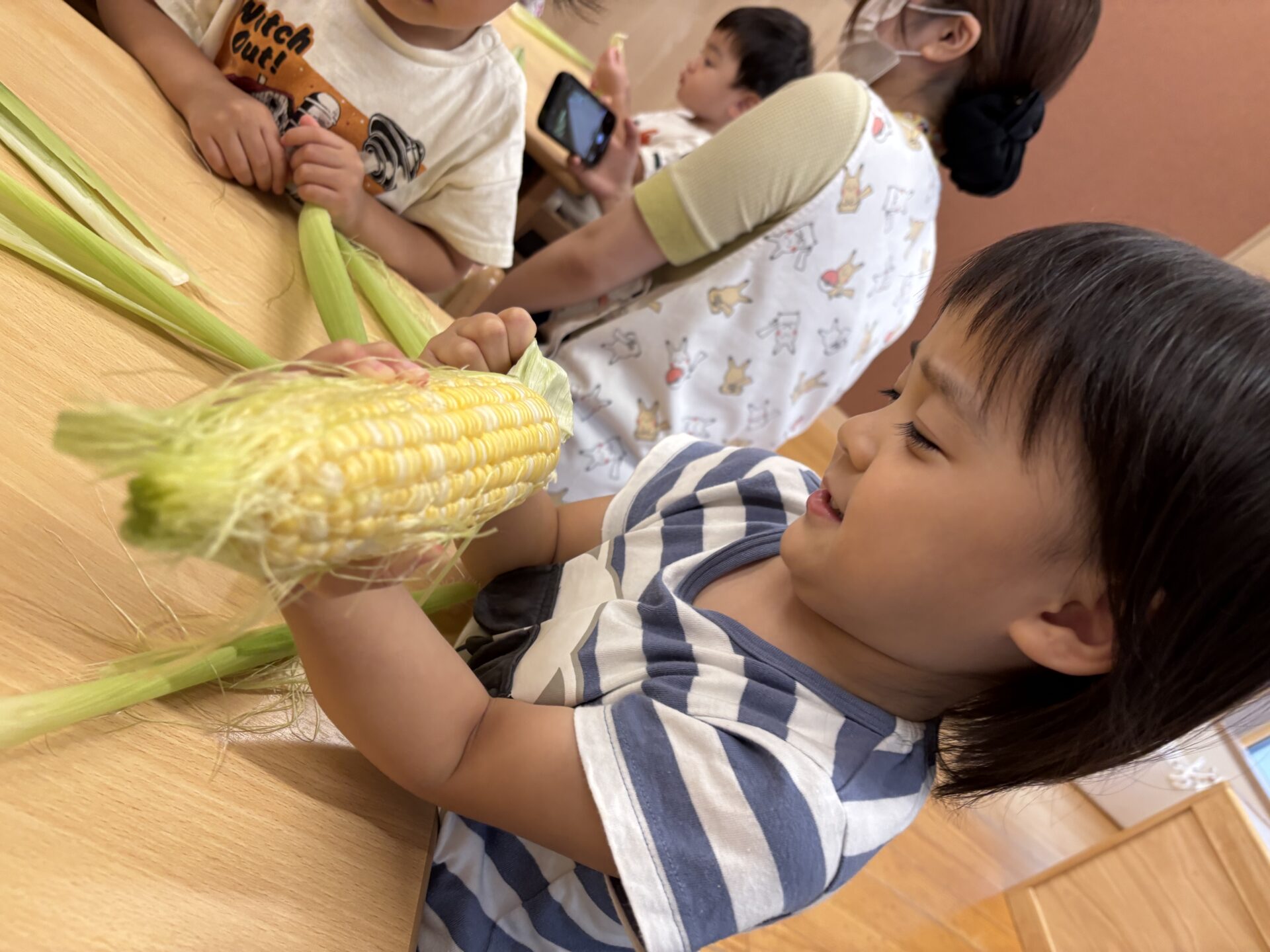 とうもろこしを知っていても、皮がついた物を見るのは初めての子どもも多かったようで、「これはなんだあ?」っと言うような表情の子ども達でしたが、一人のお友だちが「とうもろこし」🌽っとみんなに教えてくれました😊
