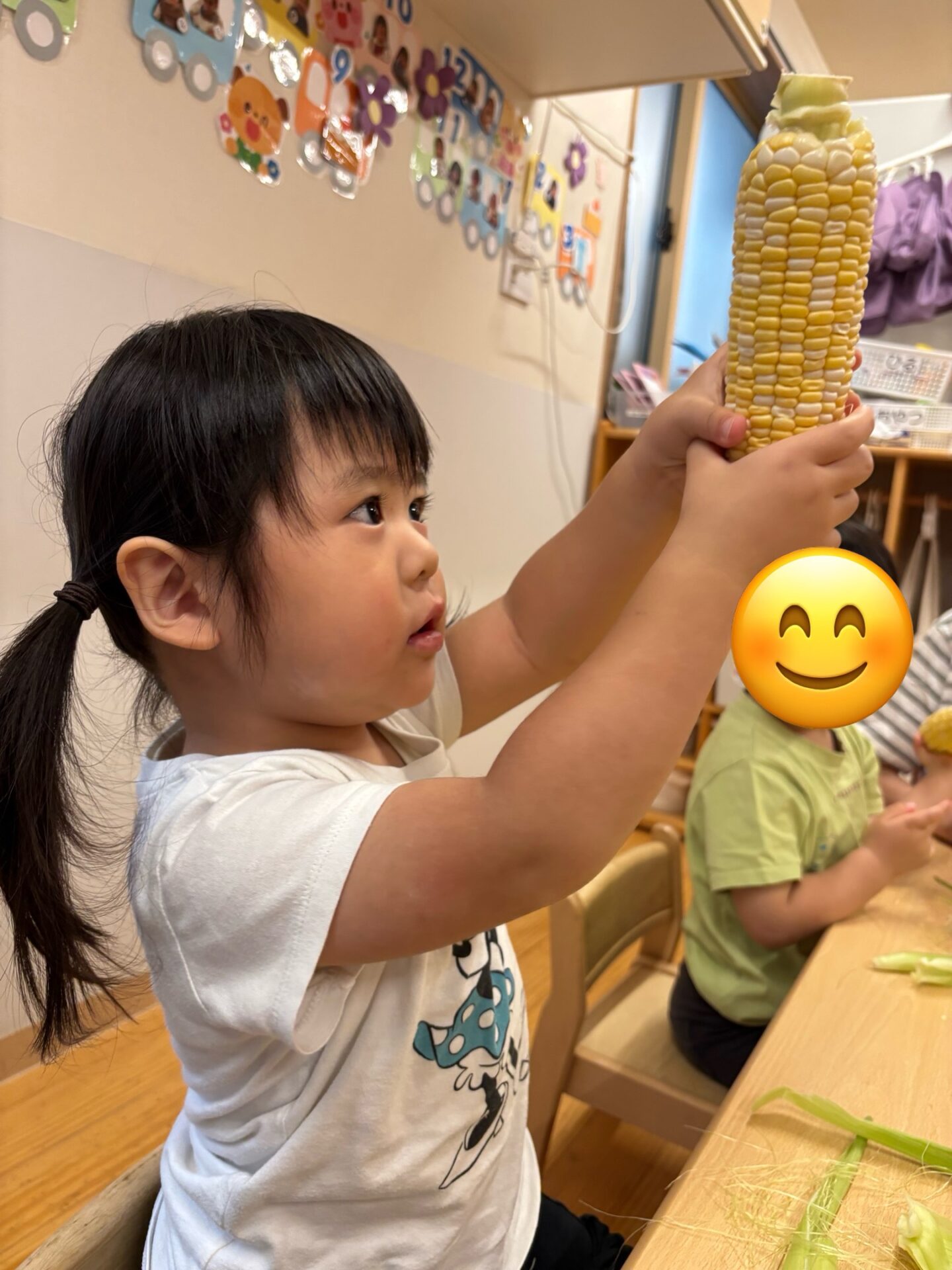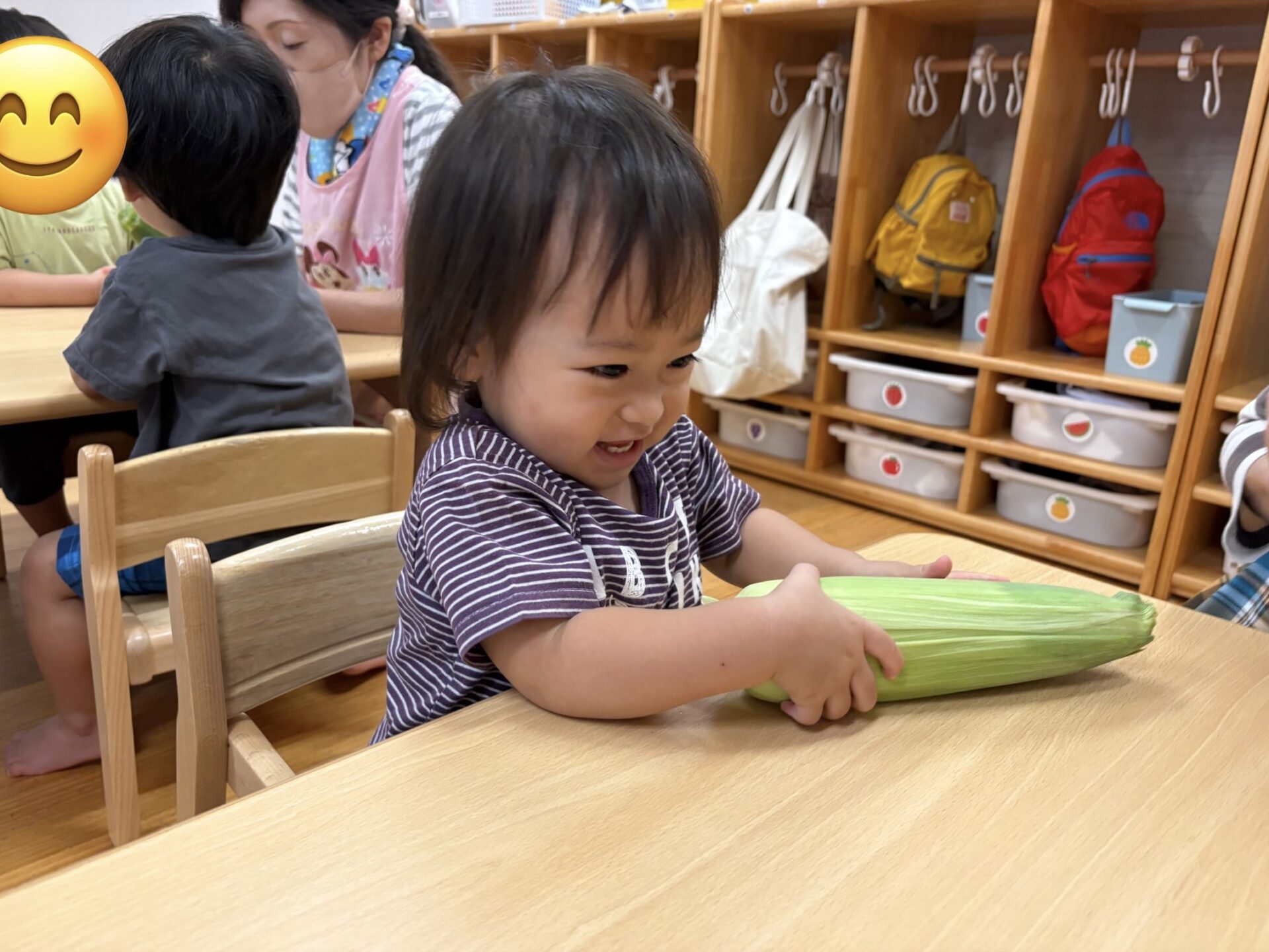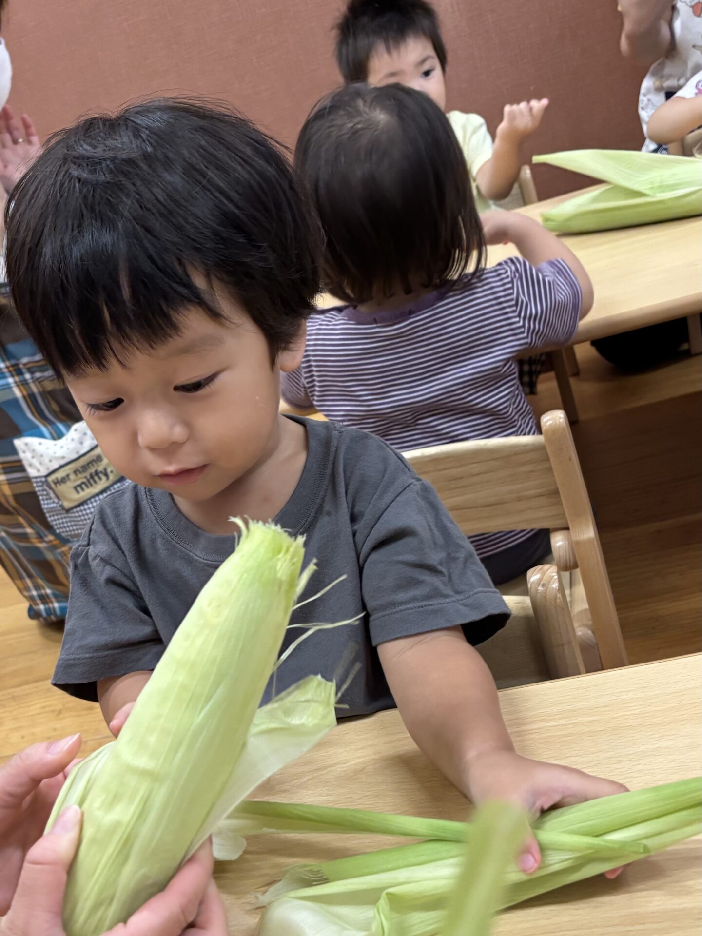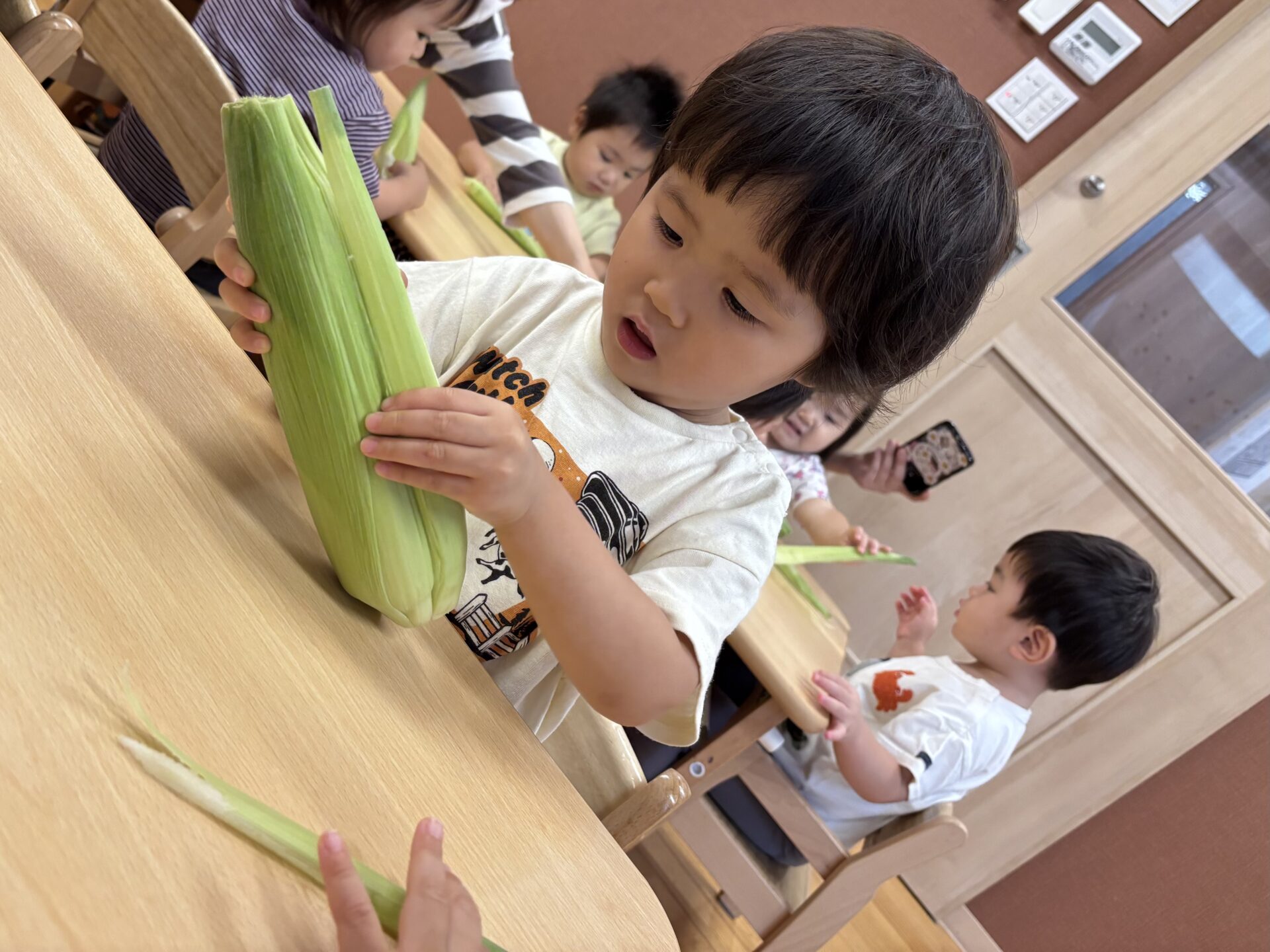 とうもろこしを知っていても、皮がついた物を見るのは初めての子どもも多かったようで、「これはなんだあ?」っと言うような表情の子ども達でしたが、一人のお友だちが「とうもろこし」🌽っとみんなに教えてくれました😊