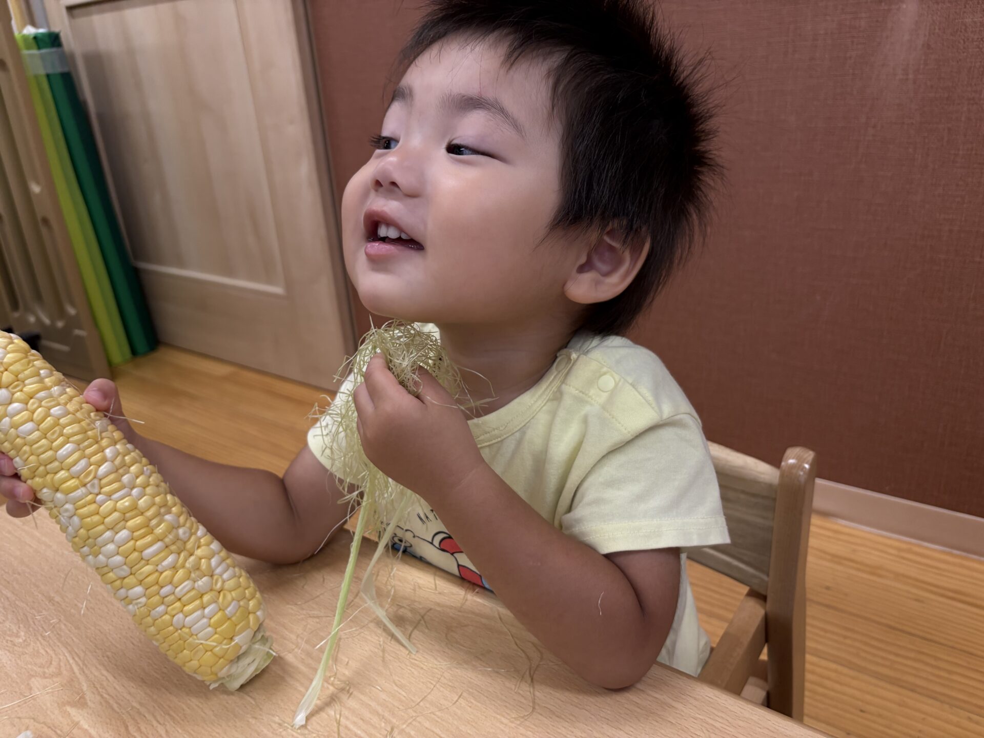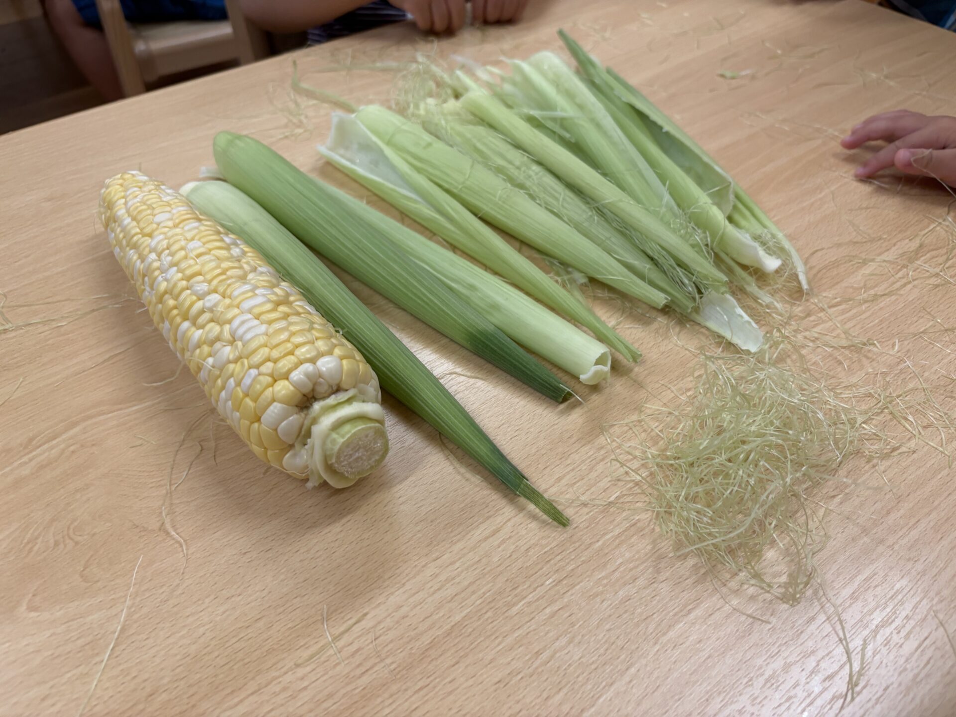 とうもろこしの周りに付いていたお髭を綺麗に取るお友だちや、とうもろこしのお髭を顎にあてて「おひげー😁」っと表現するお友だちもいました。