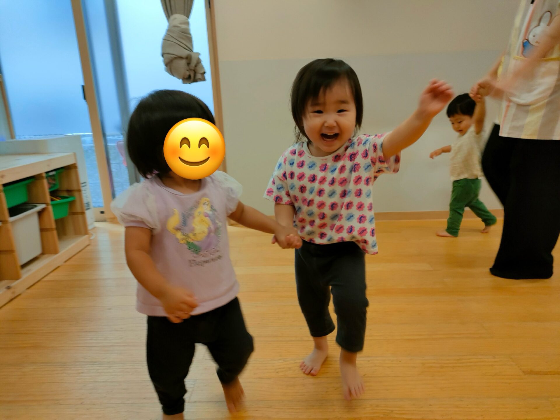 お外に行ってお友達と手を繋いで歩けるように、お部屋で練習もしています。「ゴーゴー!😆」