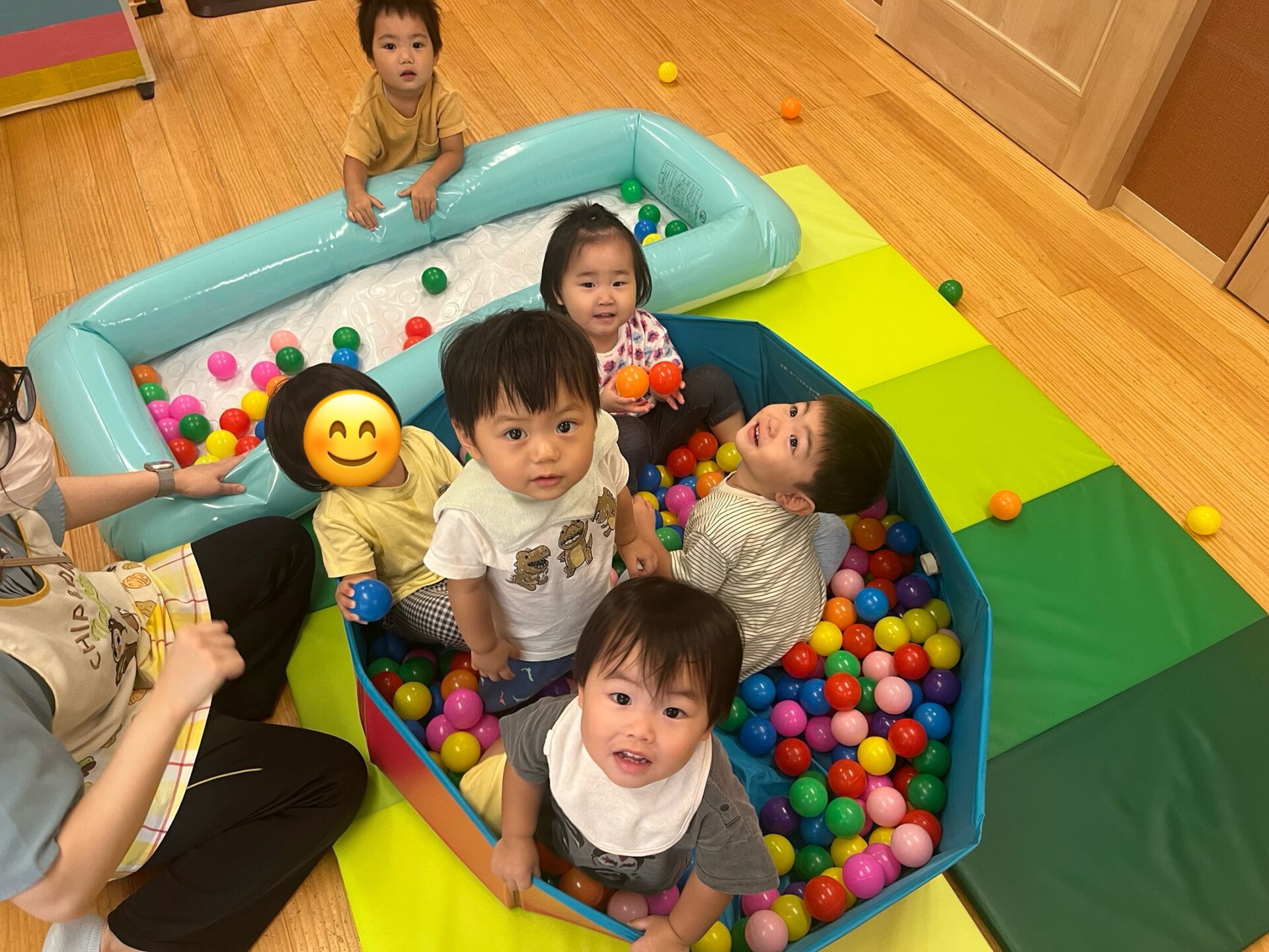 だいち組さんの中で1番人気の遊びは、こちらのカラーボールを使ったボール遊び。保育者が上から降らせるボールの雨を待つ期待の眼差しがとても可愛らしいです😊