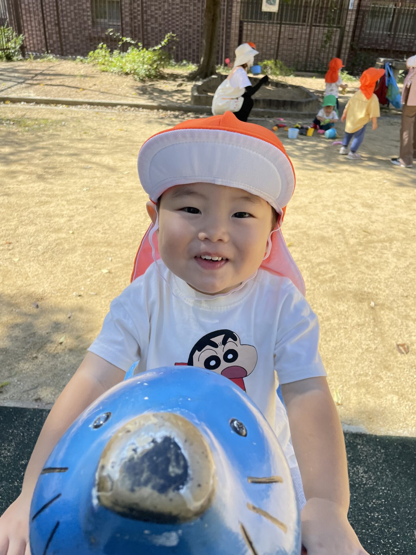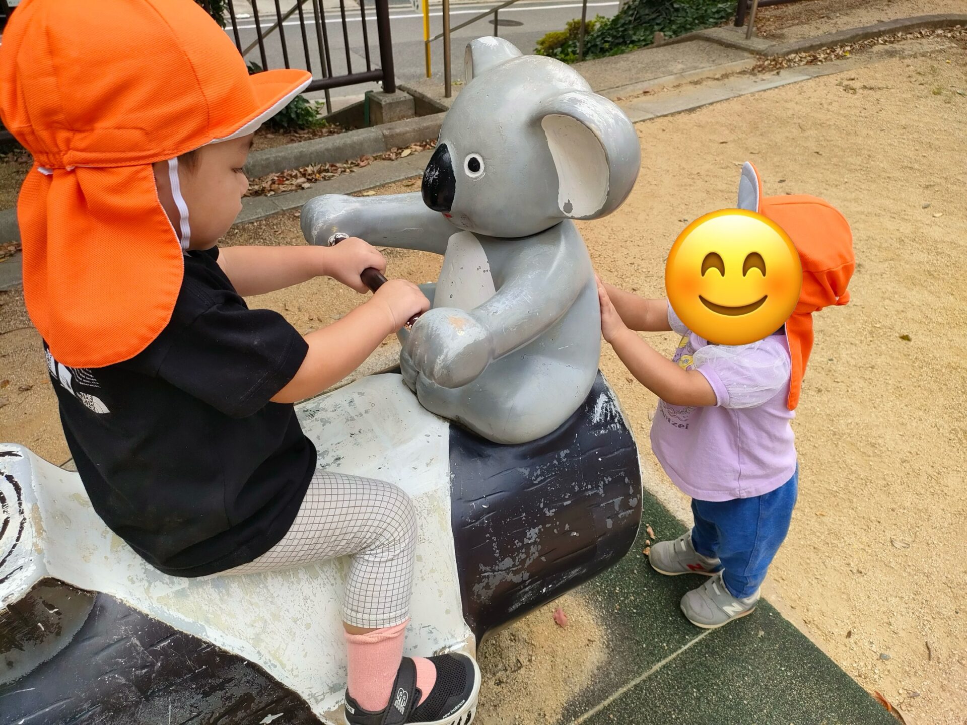 保育者が押して揺らしているのを見て、お友だちが乗っているスプリング遊具を揺らしてくれていますよ。