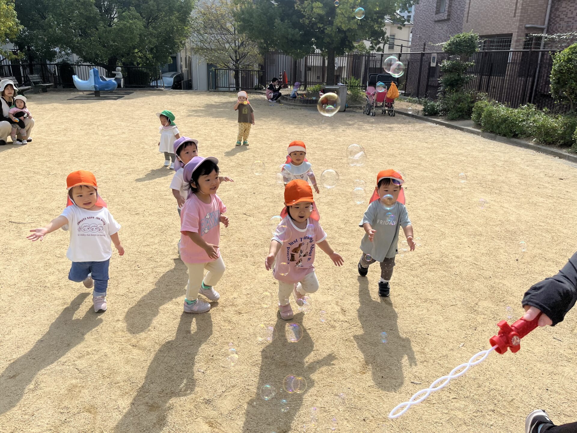 「うわ〜!」「きゃー😆」と声が聞こえると思ったら、シャボン玉を楽しんでいました🫧