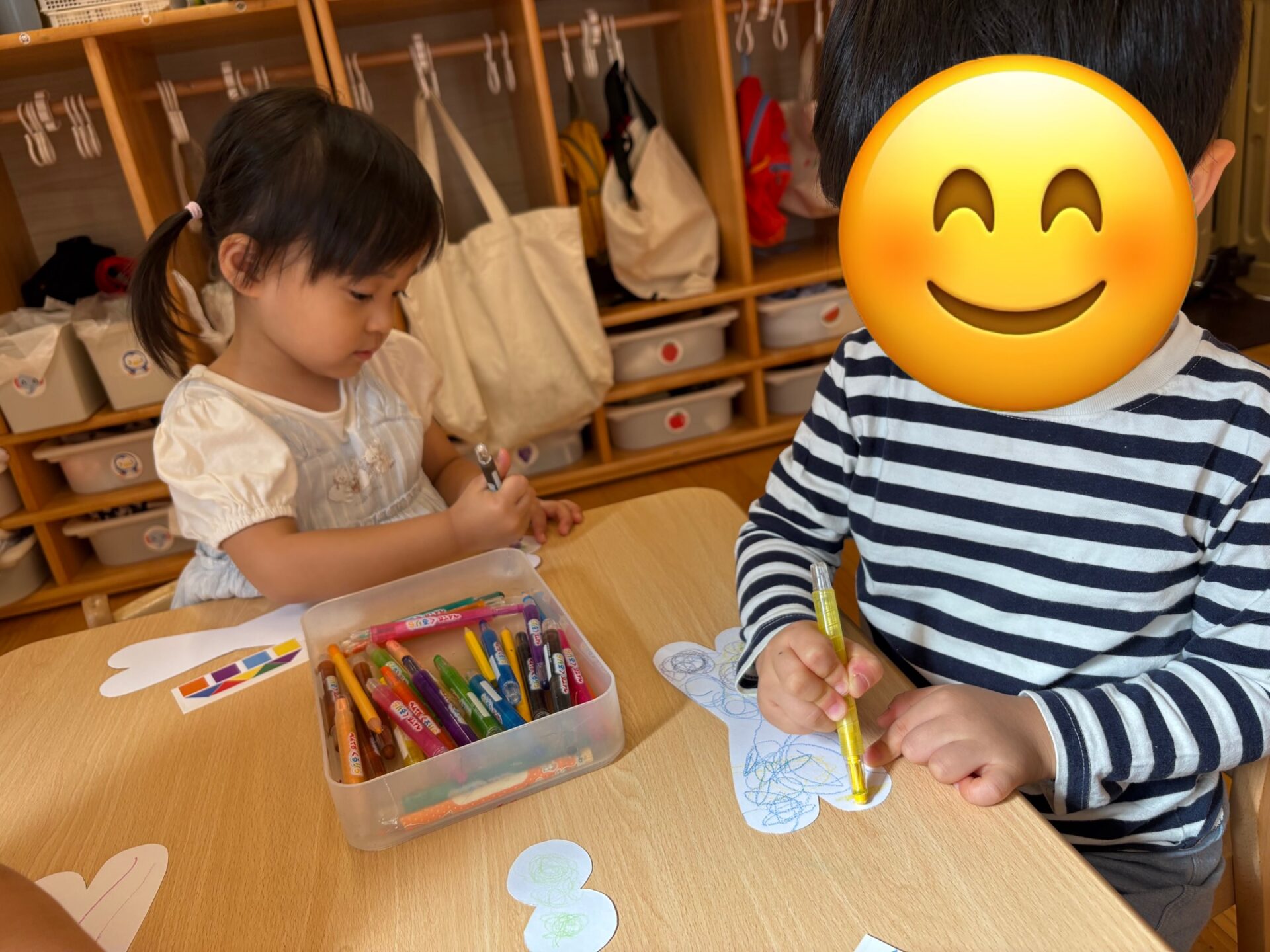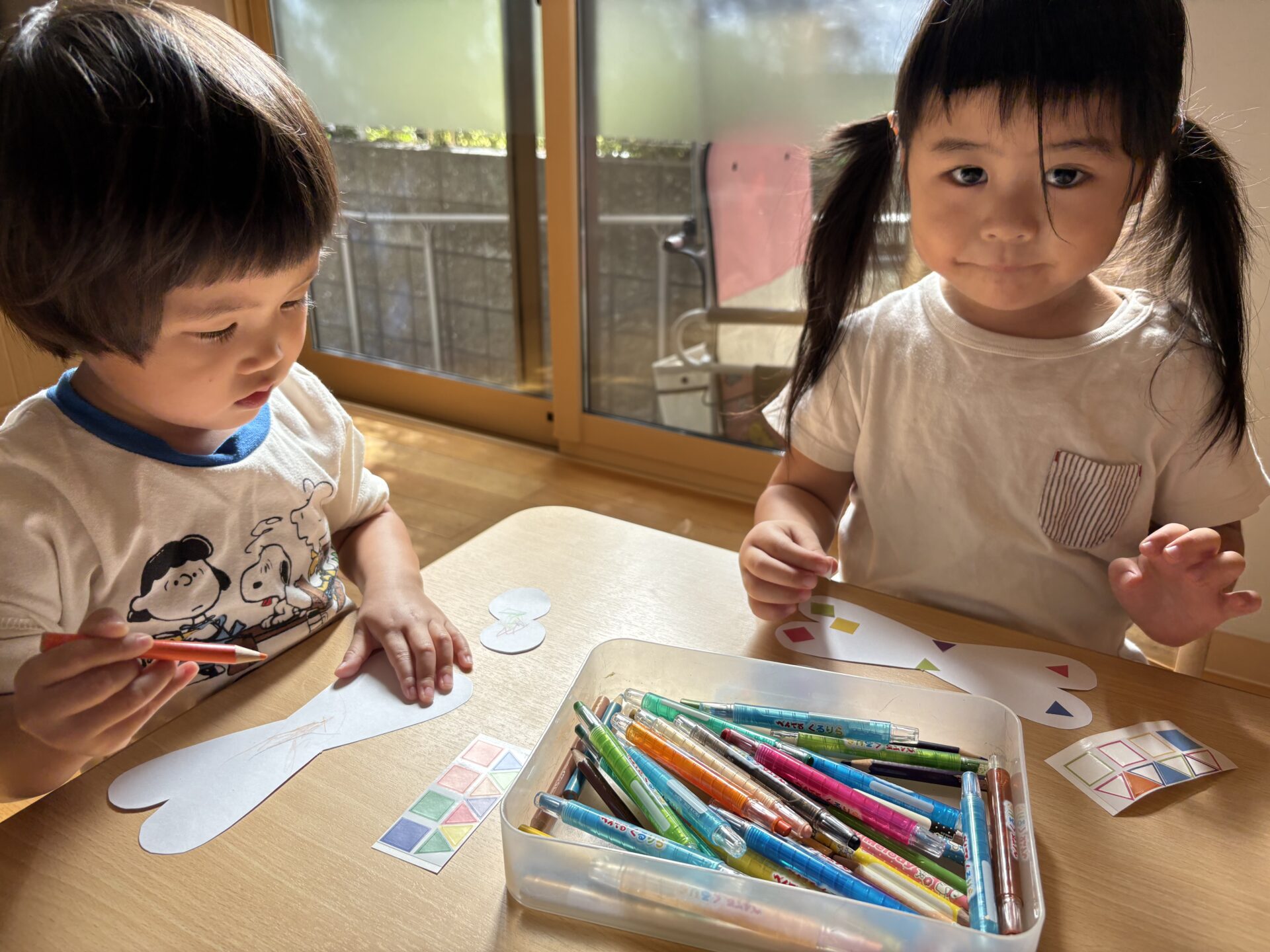 クレヨンや三角と四角のシールも用意したので、好きな模様をつけてもらいます😊