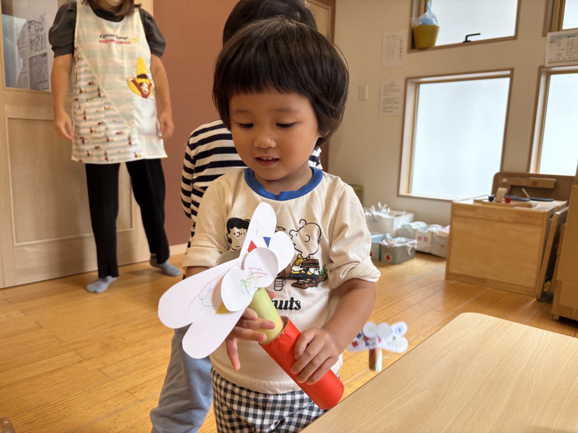 トンボに興味を持っているので、2歳児あめ組さんでは「トンボ」の立体製作をしました。