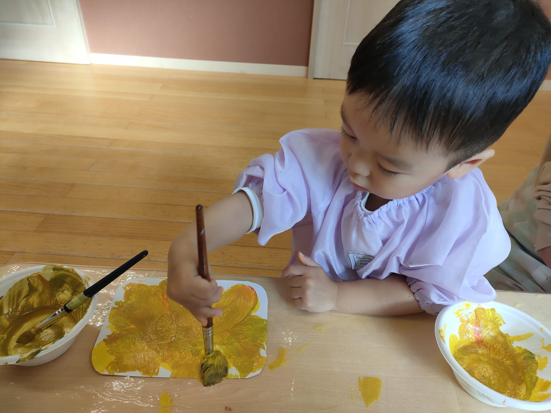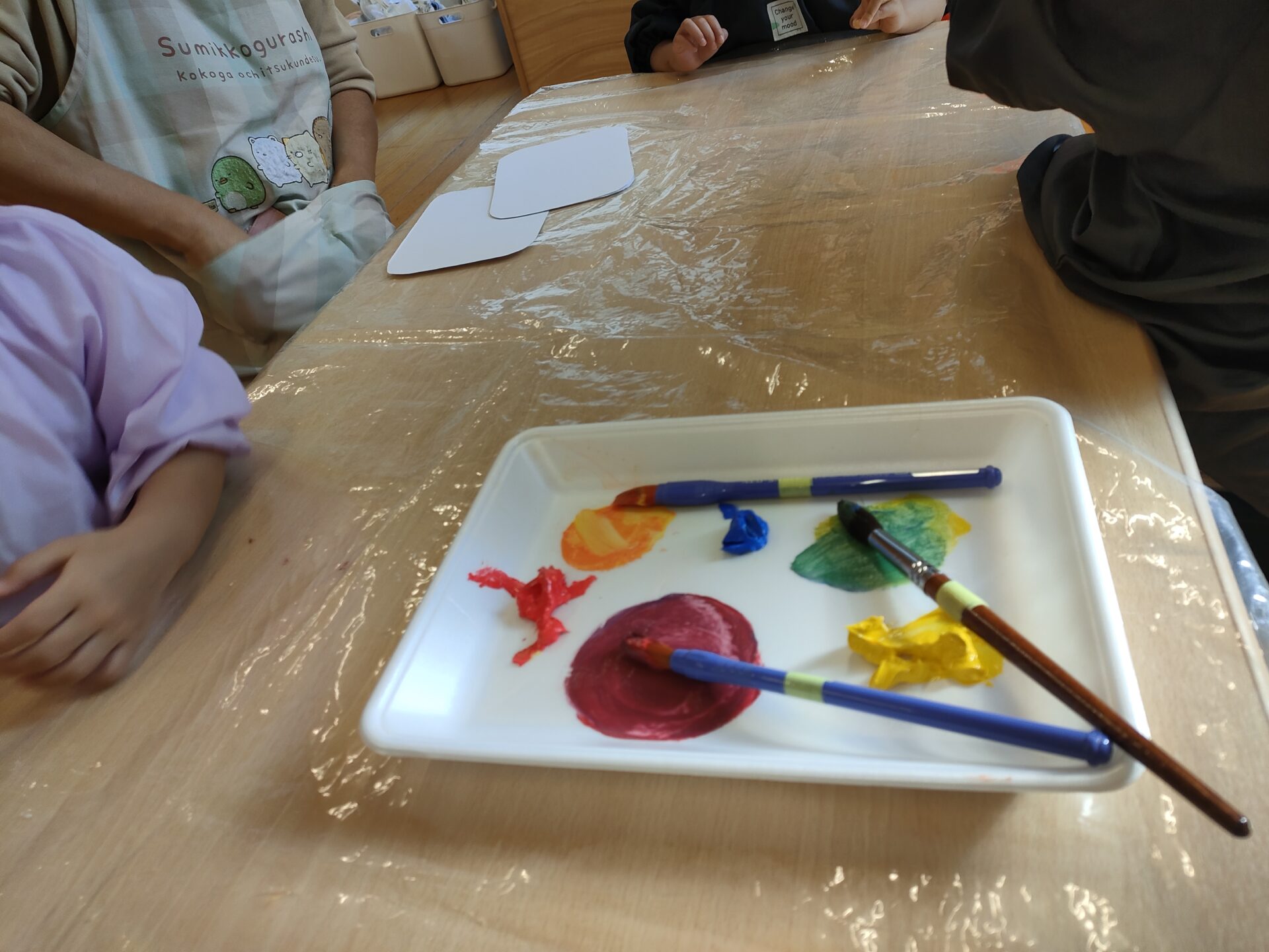 絵の具が大好きな子ども達は、絵の具を見た瞬間、「〇〇はきいろー」「〇〇はあかー」っと使いたい色を知らせてくれていましたよ。