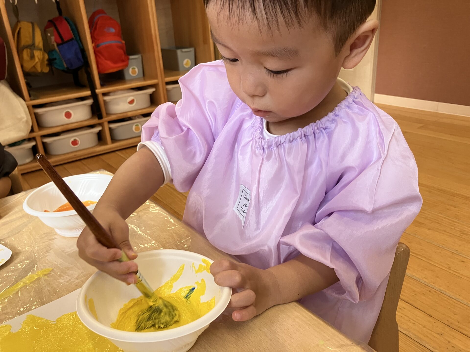 それぞれに使いたい色が決まっていたようで、一人ずつ好きな色を容器に入れていくと、「きいろ、いれてー」「〇〇は、あかとあおもいれてー」っと自分の思いを迷わず教えてくれていましたよ。