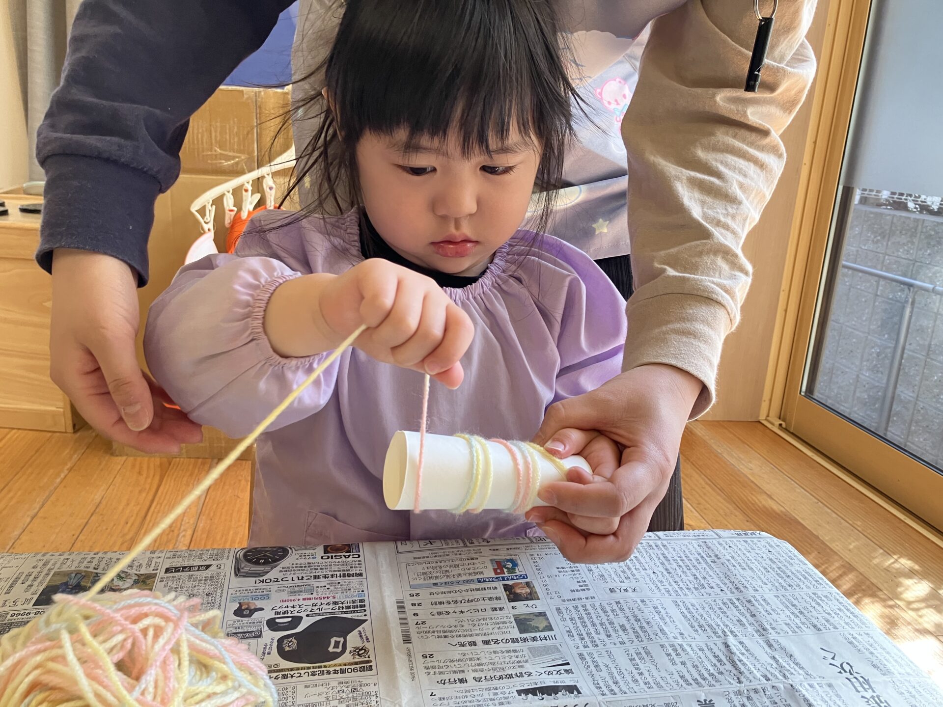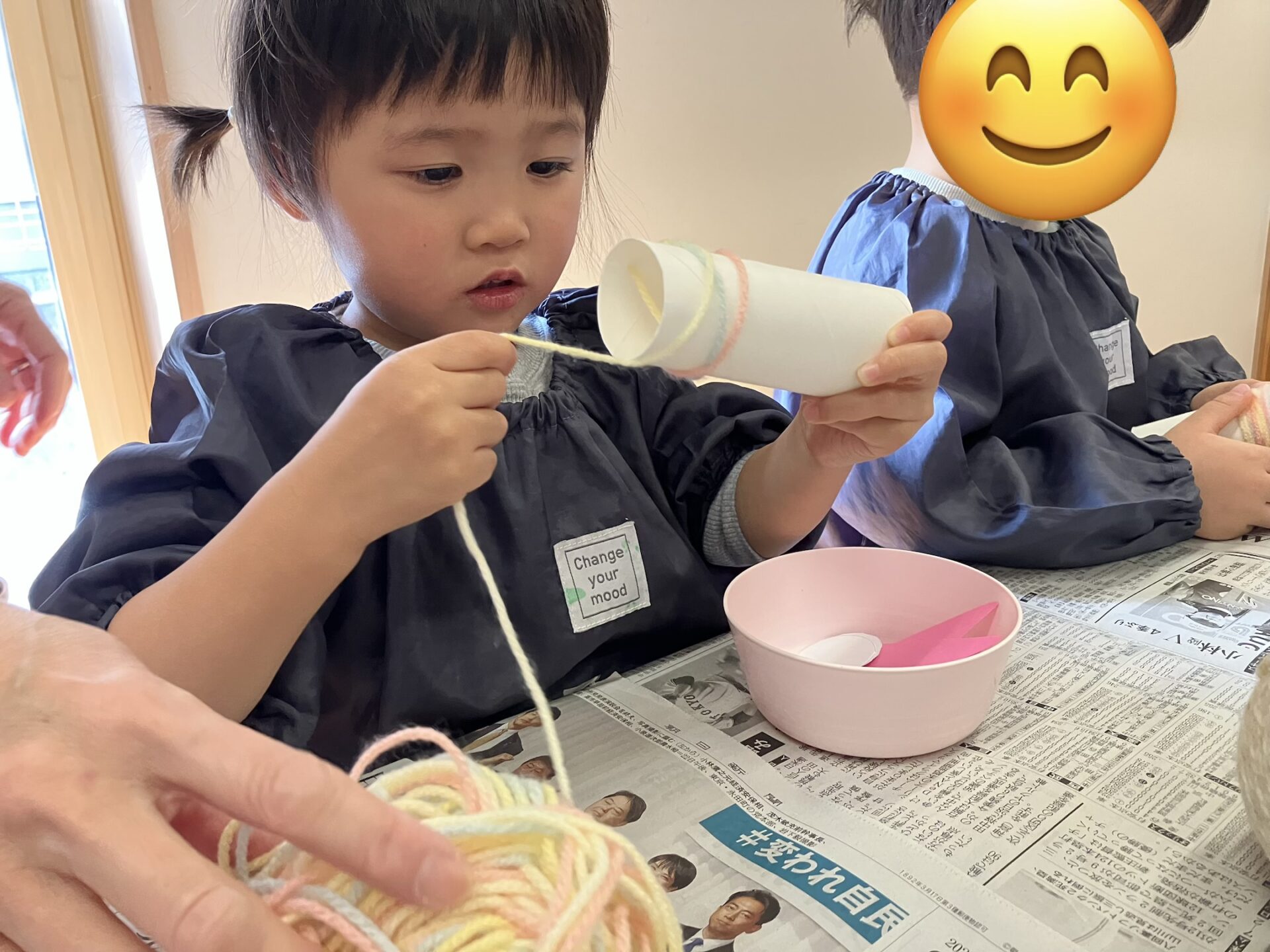 初めに毛糸で糸巻きをし、髪の毛を作りました。糸巻きの歌を歌いながら、上手に巻いていました。
