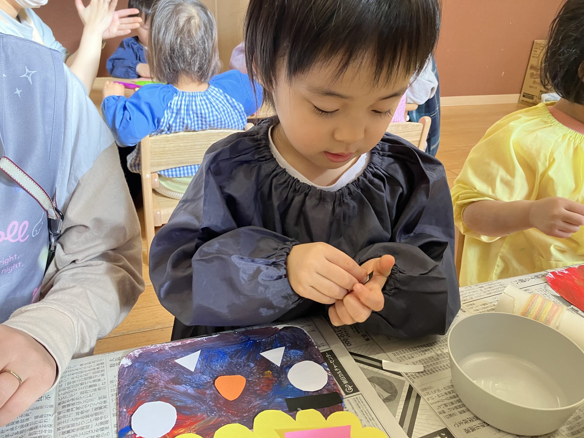 初めに鬼の顔の色塗りをすることを知らせ、赤、青、黄色の絵の具を使って色遊びをしました。