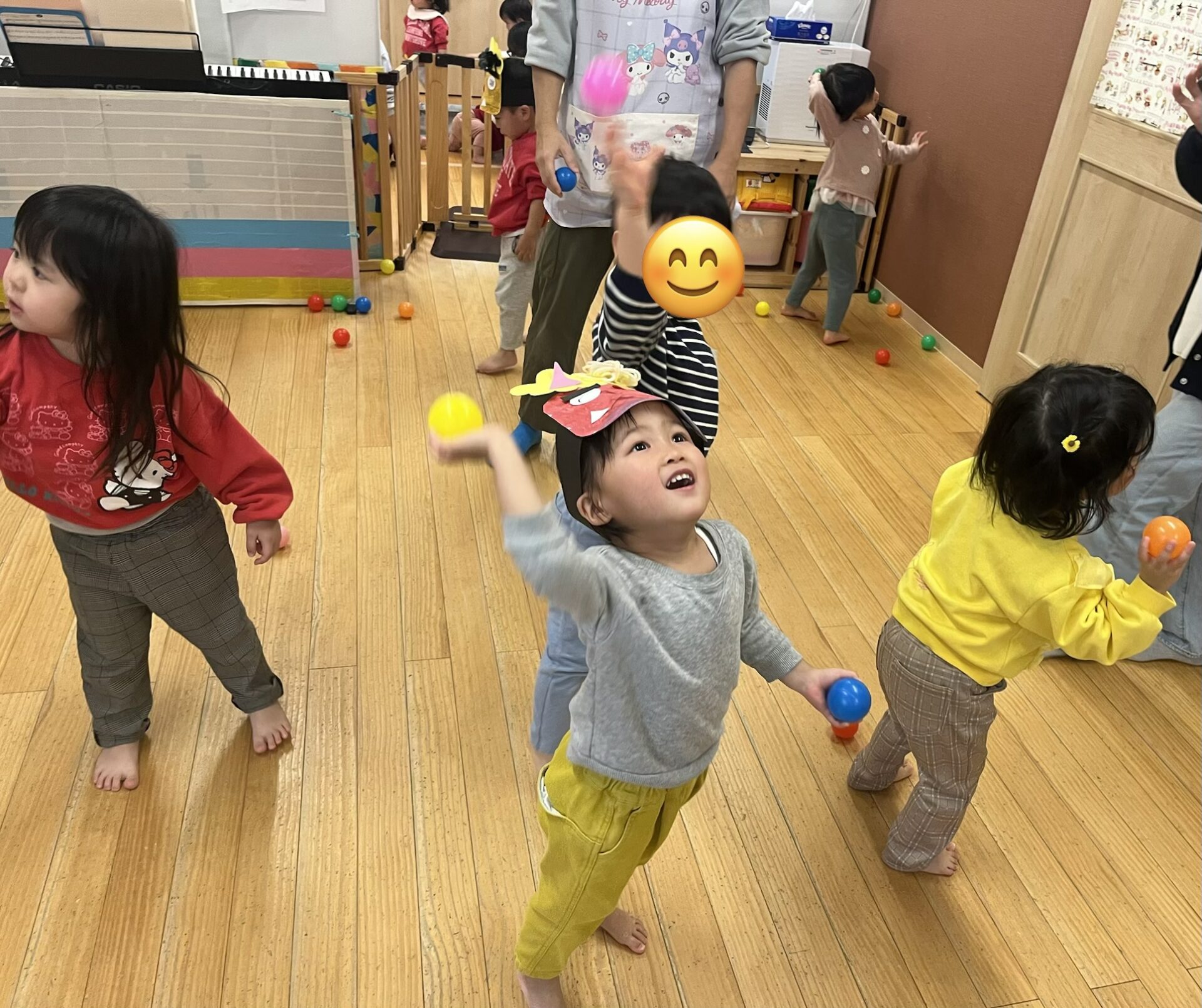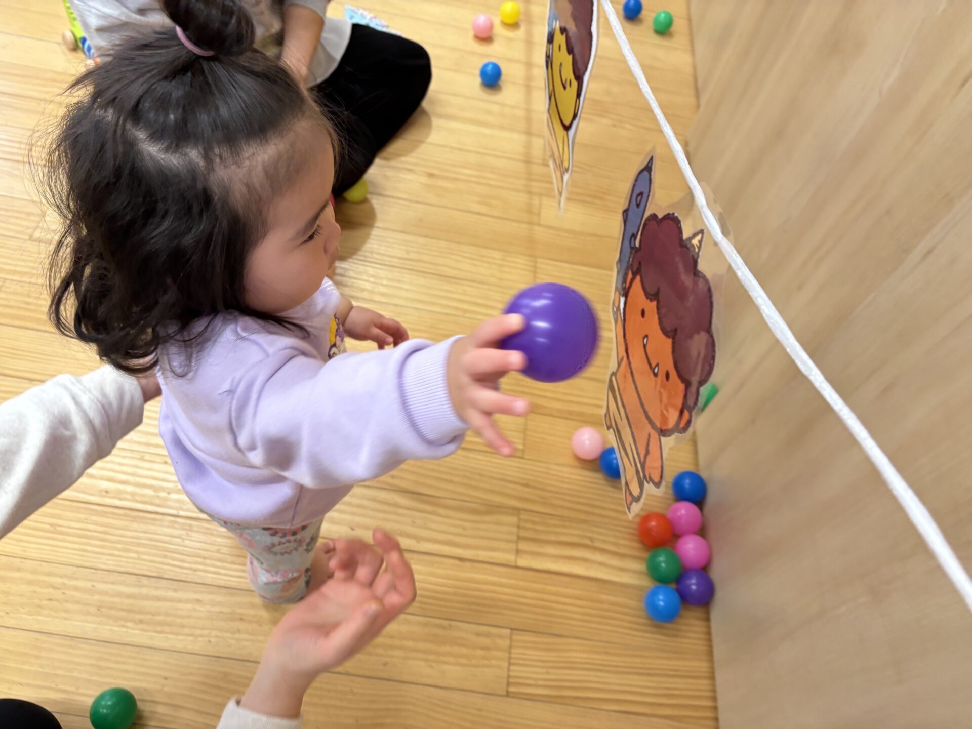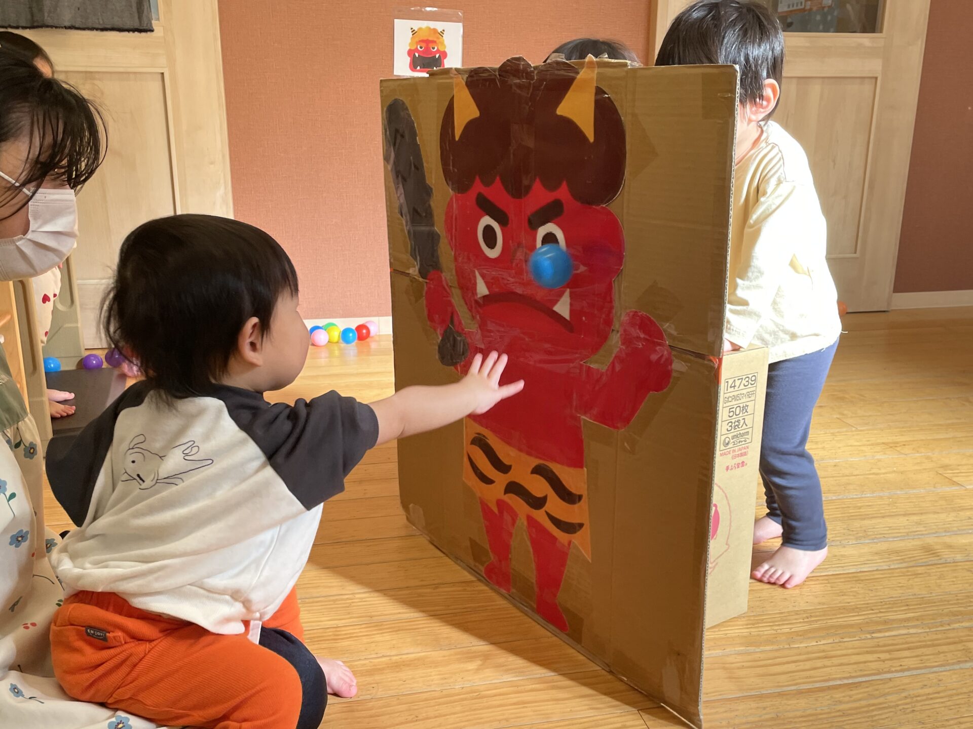 各クラスに分かれて豆まきをします。(カラーボールを豆に見立てています)子どもたちは鬼の的に向かって豆を投げ、一生懸命鬼退治をしていました!