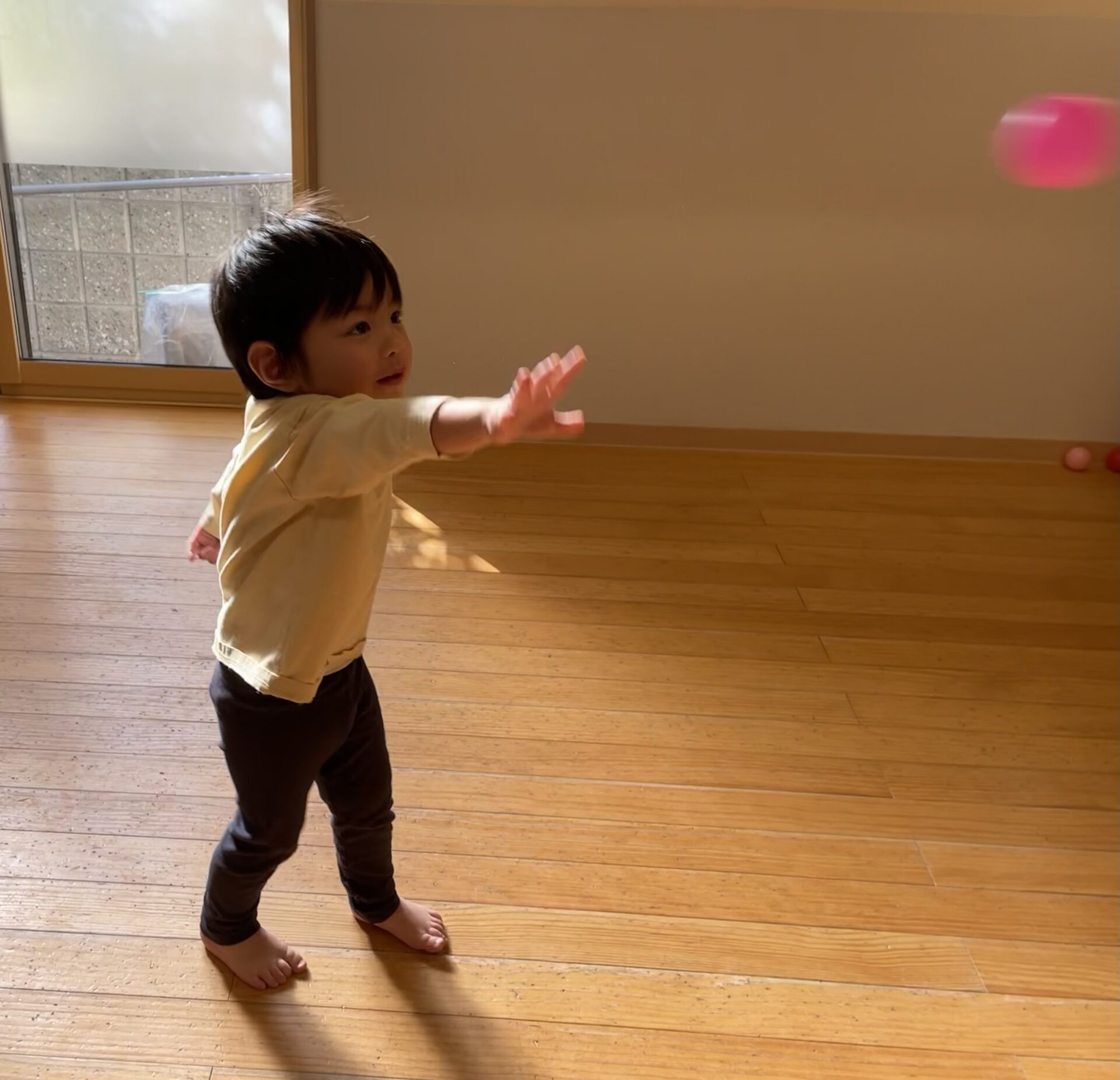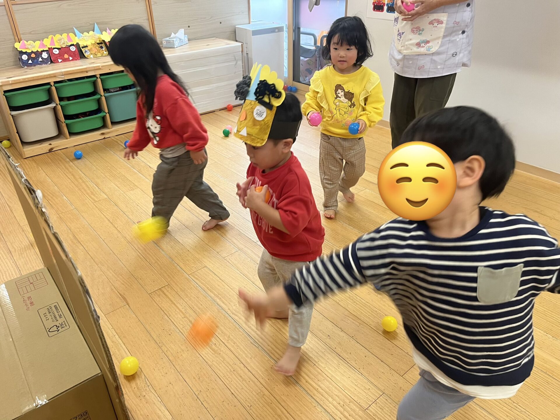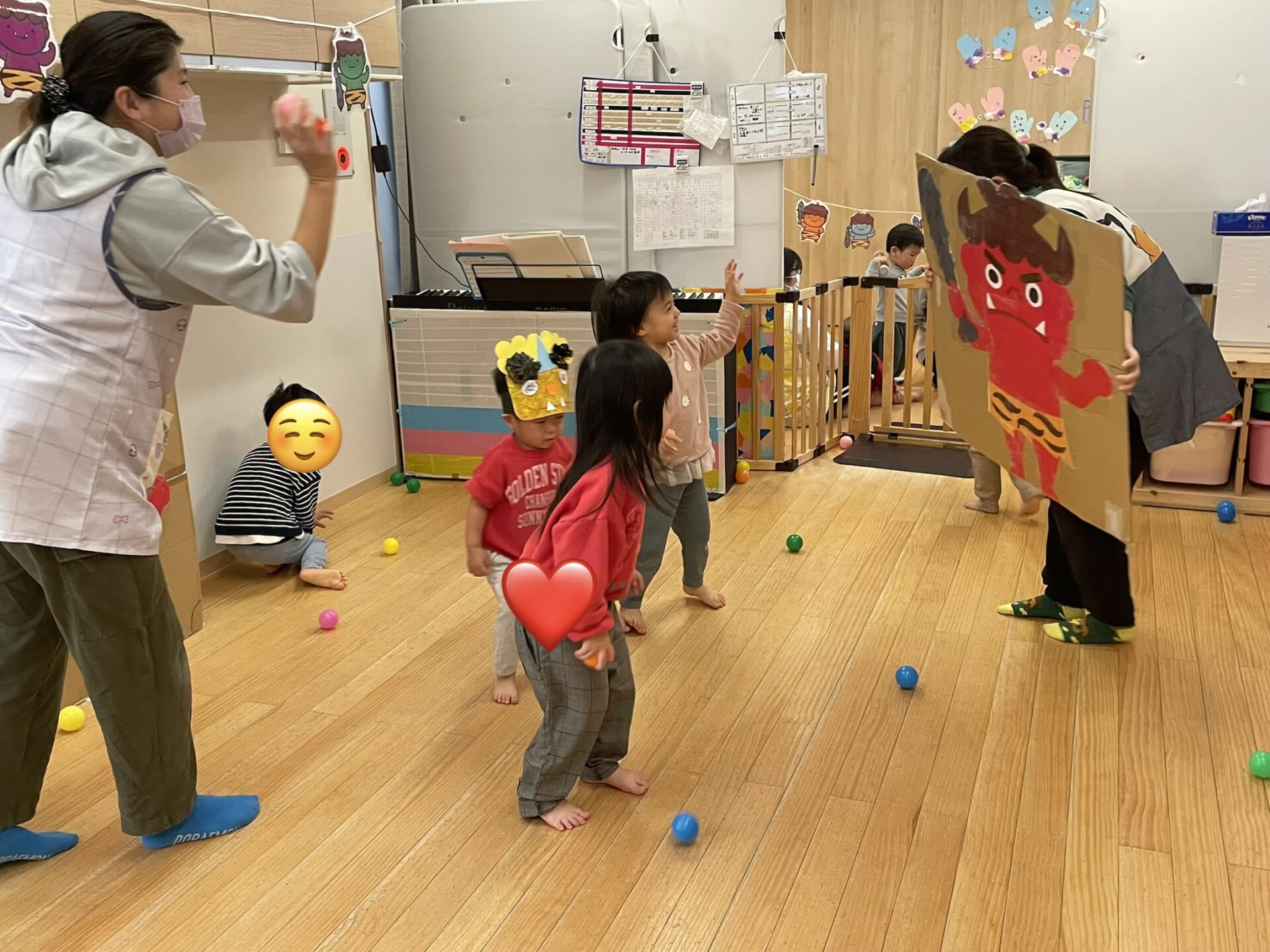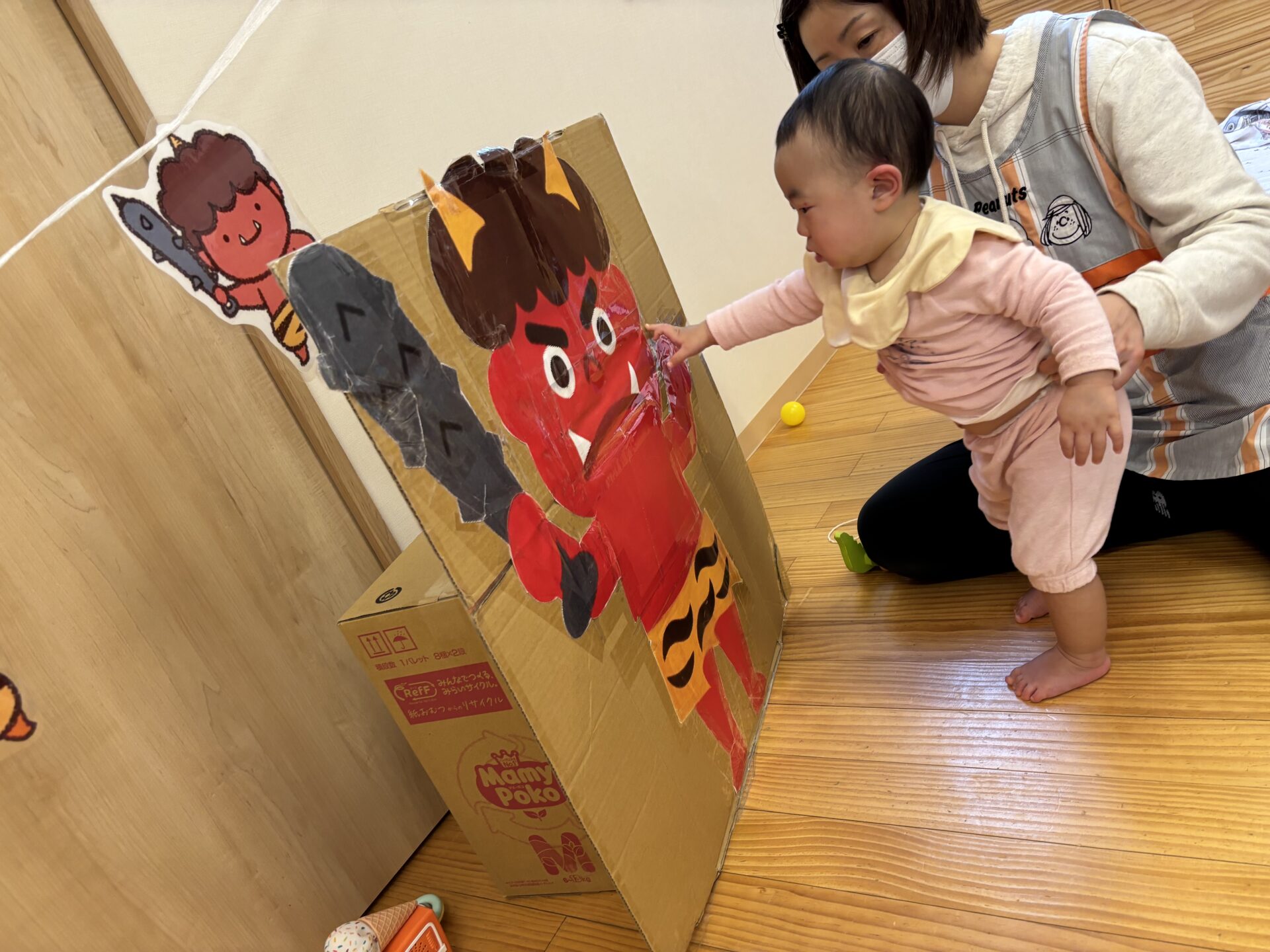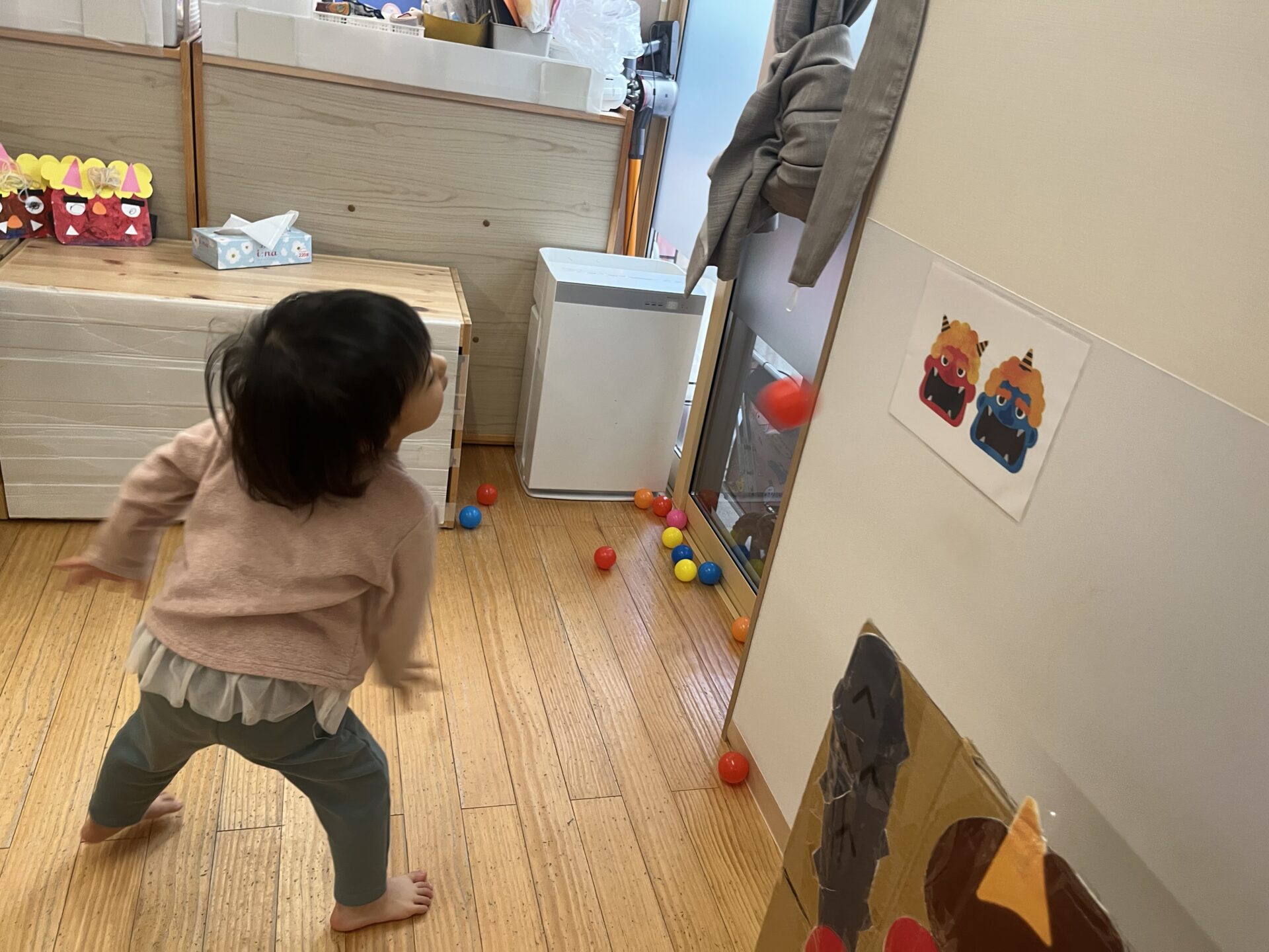 保育者が鬼を持って移動させると「きゃ〜!!😆」と逃げ回りながら、「おにはーそと!!」とやっつけてくれました✨