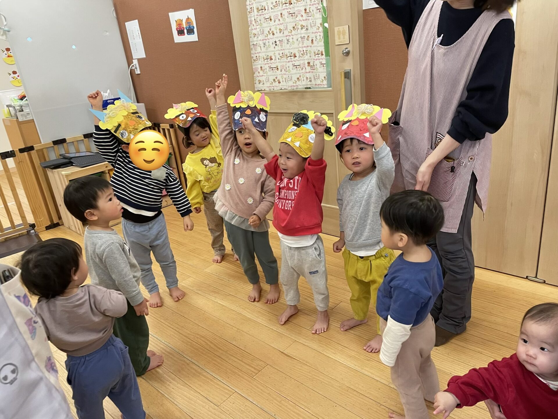 お歌の後、あめ組さんは製作で作ったお面を被って準備万端!